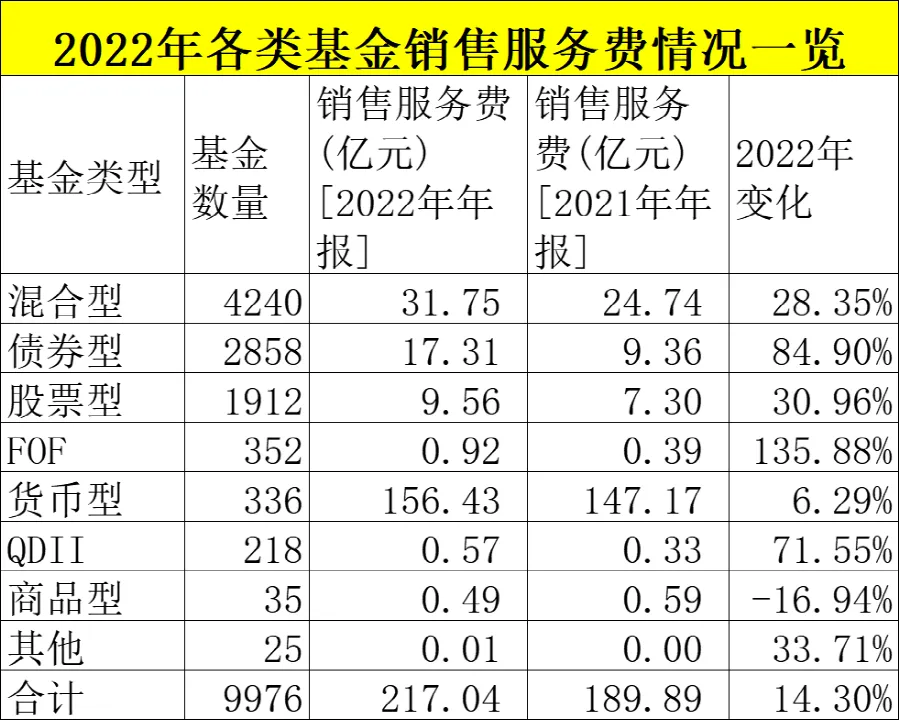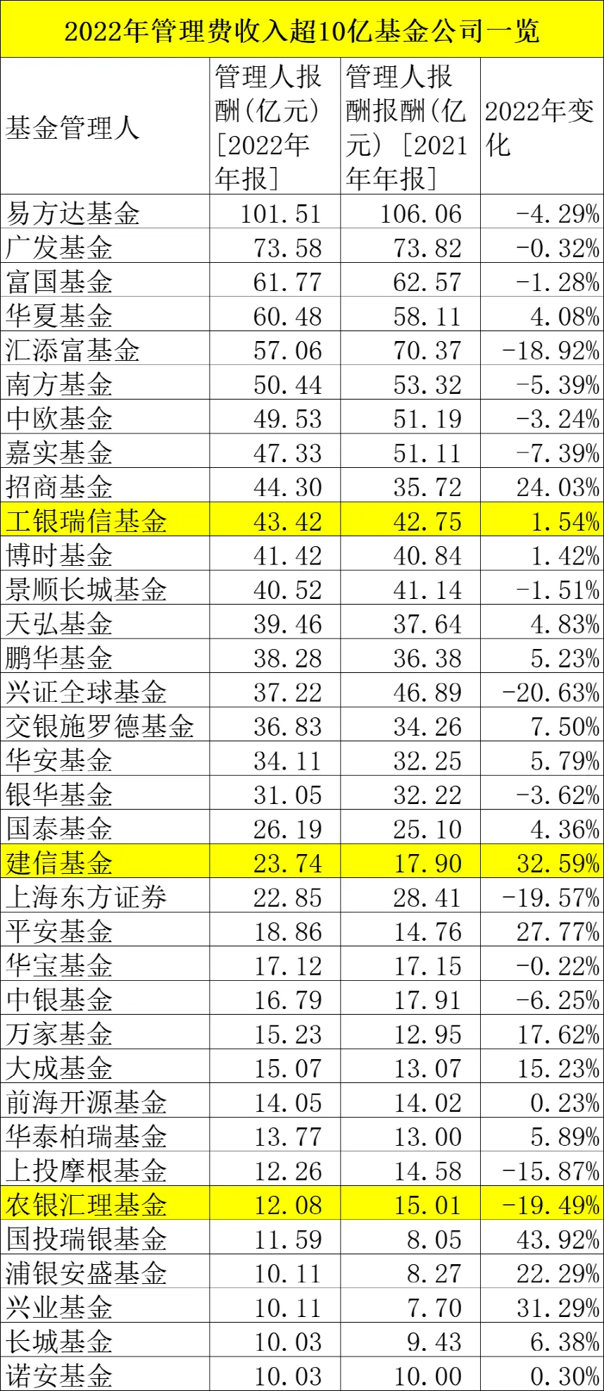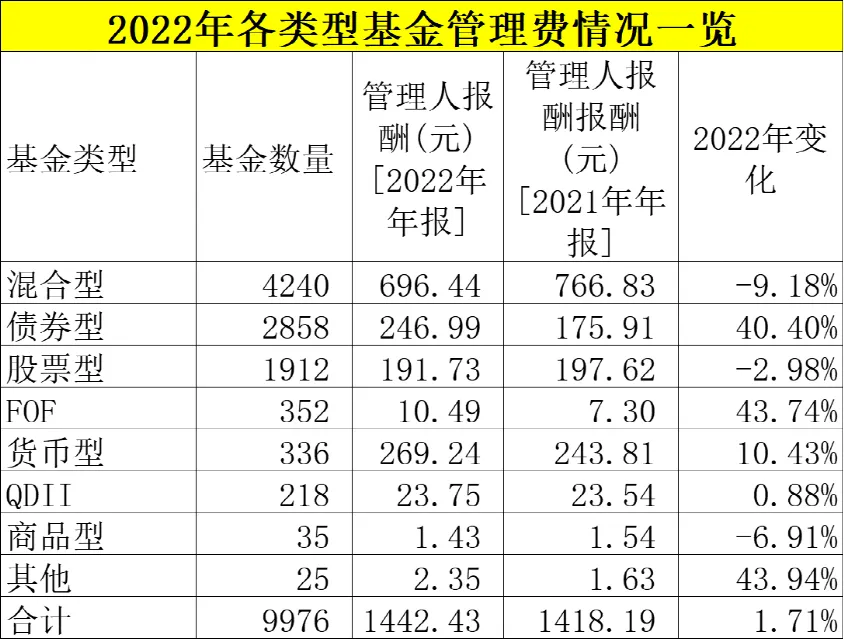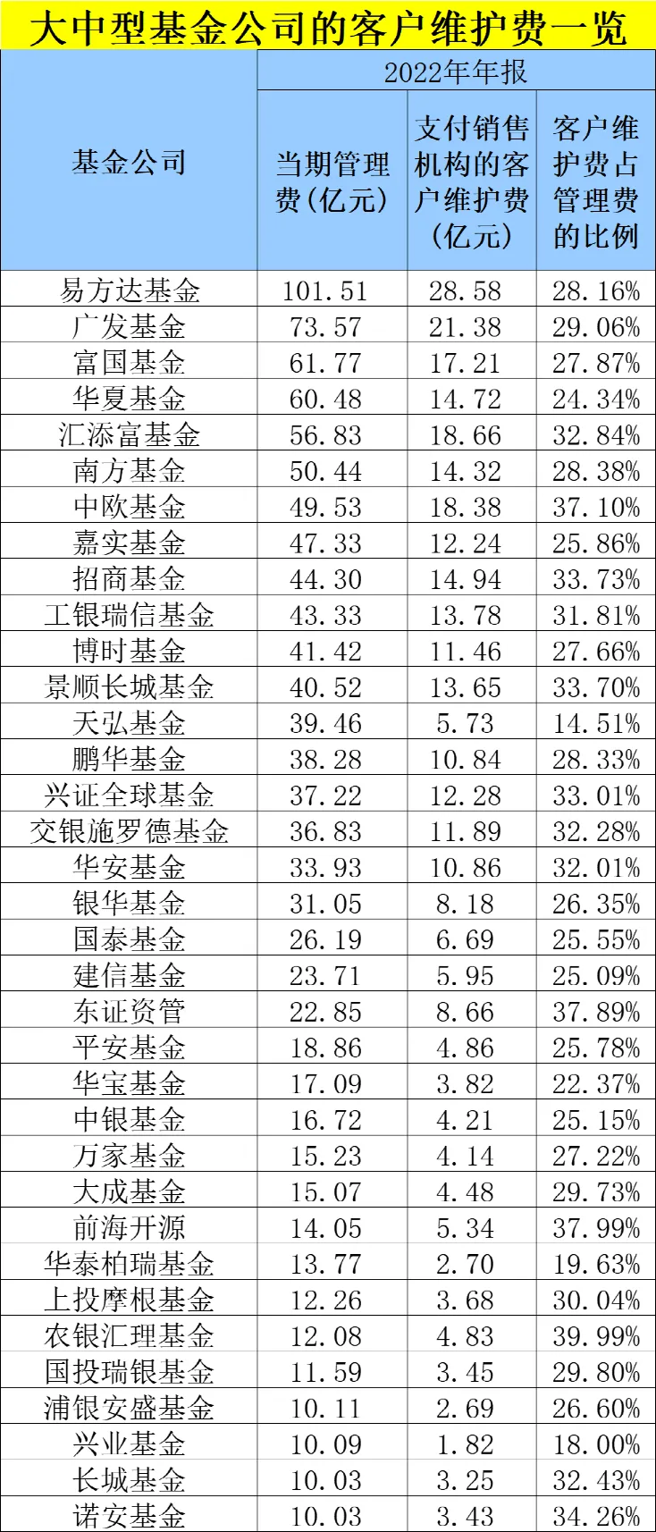 中国基金报记者 方丽 随着公募基金2022年年报全部披露完毕,揭开了2022年公募基金的团体答卷,基金公司旗下产物各项数据也随之曝光。 受2022年A股市场演绎震荡大跌的市场影响,团体基金出现万亿级的亏损,2022年团体亏损1.45万亿。 备受市场关注的基金管理费、托管费、生意业务费、贩卖服务费等“四费”也得以曝光。固然2022年股票市场震荡下跌,但是“四费”仍维持汗青高位,更较2021年这一汗青高点出现小幅增长,创出汗青新高度。 2022年管理费收入1442.43亿 逆市中仍得到1.71%的增长 自2019年以来,公募基金权益基金发展驶入快车道,团体公募基金规模也节节攀升,克制2022年底,团体公募基金总规模到达26.03万亿,相较2021年底的25.56万亿出现了小幅增长,因此也动员了2022年基金管理费在弱市中继续增长。 根据天相投顾数据对公募基金2022年报的统计,2022年整年基金公司管理费收入总计到达1442.43亿元,比2021年的1418.19亿元增幅到达1.71%。相较于2021年、2020年都保持50%以上的增速,2022年管理费增长幅度显着放缓。 这意味着,2022年整个行业管理费收入革新了2021年保持的记载,创出汗青新高。 业内人士表现,管理费增幅重要受益于团体基金规模仍保持增长态势,一方面是由于虽权益基金团体表现平平,但是团体规模仍相对稳固,另一方面,债券基金、固收+、FOF等公募基金规模保持妥当增长,因此动员了管理费收入的小幅攀升。 从基金范例来看,相比2021年,2022年仅肴杂型、股票型、商品型基金管理费收入出现下滑,其他范例都有增长。此中管理费收入最大泉源是肴杂型基金,这类基金合计收取管理费696.44亿元,在管理费总收入中占比达48.28%。而相比2021年的765.23亿元下滑了9.18%。 别的两个管理费收入泉源的主力军分别为钱币基金和债券基金,管理费收入分别到达269.24亿元、246.99亿元,相比2021年水平分别增长10.43%、40.4%。另一个管理费增幅较大的是FOF基金,固然2022年管理费收入仅10.49亿元,但是同比增长了43.74%。 别的,股票型基金2022年收取的管理费191.73亿元,这类基金管理费收入较2021年出现了2.98%的下滑。QDII基金、商品基金、其他基金2022年管理费收入分别为23.75亿元、1.43亿元、2.35亿元。 35家公司管理费收入超10亿 天相投顾对基金2022年报的统计,2022年,在151家有数据可统计的公募基金公司中,有35家公司管理费收入高出10亿元。而在客岁同期,这一数据为31家。也就是说,管理费收入高出10亿元的基金公司数量仍在增长。 具体而言,非钱币资产规模最大的易方达基金以101.51亿元的管理费收入稳居第一,成为现在唯逐一家管理费收入超百亿的基金公司,该公司在2021年管理费收入就高出百亿,而2022年的管理费收入较2021年下滑了4.29%。 同样基金管理规模较大的广发基金、富国基金、中原基金跟随厥后,2022年管理费收入分别到达73.58亿元、61.77亿元、60.48亿元,较2021年的变革为-0.32%、-1.28%、4.08%。 除了这三家2021年度管理费收入超60亿的基金公司外,另有汇添富和南边基金管理费高出50亿元,这两家基金公司非货管理规模也在行业中处于领先职位。 别的,另有6家基金公司2021年管理费收入在40亿元至50亿元之间,包罗中欧基金、嘉实基金、招商基金、工银瑞信基金、博时基金、景顺长城基金等。 这12家公司合计收取管理费671.37亿元,占行业总收入的差不多半壁山河,表现出行业会合度依然高企。 同时,2022年有37家基金公司收入不敷5000万元,收入低的基金公司(包罗券商资管)仅得到不敷60万元管理费,规模巨细带来的收入差异巨大。 团体来看,基金公司管理费收入布局继续分化。在可比基金公司中,2021年共有136家基金公司管理费收入实现同比增长,99家出现管理费收入上涨。值得注意的是,部门中小型基金公司近一年以来管理费收入实现多少式跃升。此中东兴基金2022年管理费收入为1.37亿元,较2021年的0.27亿元的数据激增406.96%。 别的,华泰资管、百嘉基金、兴华基金、中泰资管、博远基金、东海基金、中庚基金等管理费收入增幅超100%。 另有一批大中型基金公司管理费收入在2022年市场情况下逆市走高,如在管理费收入超10亿的公司中,招商基金、建信基金、安全基金、万家基金、大成基金、国投瑞银基金、浦银安盛基金、兴业基金等公司管理费增长幅度到达“两位数”。 业内人士表现,2022年底子市场走弱,股票、债券轮替调解,部门基金公司捉住了行情,要么自动权益基金、要么债券类产物表现出较好业绩,因此动员基金管理规模的大跨步前行,实现管理费收入的妥当增长。 2022年贩卖服务费413.98亿 占管理费收入22.17% 毕竟上,基金公司并不能得到账面上的全部管理费收入,银行、第三方基金贩卖公司等基金贩卖渠道也要从中分一杯羹,客户维护费更是此中一个告急的付出环节。 根据天相投顾数据统计,扣除没有客户维护费的部门基金管理人,纳入统计的173家基金公司旗下9136只基金在2022年共向贩卖机构付出客户维护费(即“尾随佣金”)413.98亿,比2021年整年的407.95亿元有微幅上涨。 统计还表现,2022年基金向贩卖机构付出的尾随佣金占到管理费收入的22.17%,与上一年的22.7%相比有所下滑。 从基金公司的情况来看,尾随佣金占管理费收入的差异较大,部门基金管理人尾随佣金占管理费收入比例较高,如贝莱德基金、汇泉基金、凯石基金、泉果基金、西藏东财、达诚基金、朱雀基金、国融基金