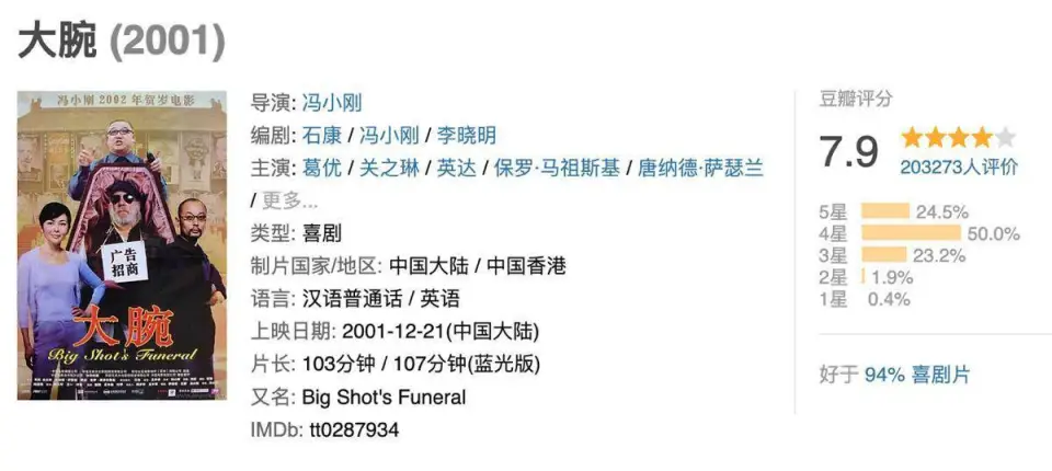 2022年已经靠近尾声,换做往年,一样平常这时间是影戏贺岁档最烽火弥漫的宣传窗口期。只是这些年,贺岁档、春节档影戏在疫人情前,变得“寸步难行”。 忆往昔,1997年开始,源于冯小刚的《甲方乙方》,影戏界才有了全新情势的影戏档:贺岁片。自此,冯小刚开启了每年一部贺岁片的模式。而这次想说的是冯小刚在2001年的贺岁片,《大腕》。 影戏连续了冯小刚京味小品段子的特性,照旧当年他最善于的玄色笑剧题材,讽刺又风趣,怪诞又写实。演员阵容放在当年,也绝对对得起这个片名。 主角是葛优,影片中是板寸络腮胡的形象,那会儿的葛优让人着实叫不出“大爷”两字, 和葛优搭档的另有英达,那会儿的他也没有如今胖。 别的,冯小刚还请来了关之琳和美国演员唐纳德·萨瑟兰,唐纳德·萨瑟兰在2018年拿到了奥斯卡的终身成绩奖。里头另有李诚儒的交情出演,另有当年也半退休的王菲也被请来唱了影片的推广曲《白痴》。 《大腕》上映之初,口碑评价没有特殊好,就连反面在豆瓣评分也不外6点多的评分。 颠末整整21年的社会变迁,影戏如今评分7.9分。分数的上升,一来,是观众对影片审美产生厘革;二来,当年影片还算是超实际的范畴里,而如今再看,剧情简直神预言了实际天下,以致实际远比影片更为怪诞。 影戏讲的是国际导演泰勒(唐纳德·萨瑟兰 饰),在中国拍摄时心脏病发作导致生命告急,他把自己的葬礼托付给给自己拍摄纪录片的照相师尤优(葛优 饰),渴望能办个喜丧葬礼。 尤优找到老同砚王小柱(英达 饰),王小柱想通过葬礼大赚一笔,于拭浇獒礼看成奥运会找赞助商一样,广告竞标。每一个步调、环节都被植入广告,涌入了赞助商、冠名商等等。大到灵车,小到隐形眼镜,以致另有女性丰胸广告:“做女人挺好”。 浮夸到什么水平呢?好比贴满广告的灵车应客户要求,要绕着北京跑三圈、另有因客户需求,必须死不瞑目戴着隐形眼镜的右眼…… 葬礼俨然像是大型营销现场,无数明星加盟出场,有当司仪的,有开口献唱的,说这是婚礼现场氛围都充足。而遗体告别次序也有所考究,要么排咖位,要么走关系。 谁料,泰勒病情好转清醒过来。得知消息后的尤优和王小柱如晴天轰隆,一块进了精力病院,而后尤优在露西(关之琳 饰)探望后,开口称自己装疯是怕广告商追债,但王小柱是真疯了。 如今再看,在其时大概以为非常谬妄的剧情,如今看大部分都酿成实际,以致远比剧情来的离谱。里头的“神预言”,让讽刺都变得更为辛辣。 在影戏剧情里,有个假冒品牌的广告方硬是想挤出个广告位置,尤优不解为什么一个假冒伪劣产物,还要投这么多钱做广告,而对方答复:广告做大了,知道的人多了,假的就成真的了。 即便是想批驳广告和款子对今世人的生存与头脑的影响,片尾的赞助商列表里,又恰恰是影片剧情中出现名字的赞助商们,简直是影片插入广告的“教科书级别”。 在他多年后的影戏《非诚勿扰2》中,植入的广告不可胜数,一部影戏就差点变广告大片了,照旧冯小刚会玩。 公益广告的效用也被玩的明确。剧情里盗版VCD广告商乐成夺标,尤优上台取消对方的资格,紧接着对着媒体镜头高喊,无偿用于公益广告的发布。 记者问起“你不以为用葬礼招广告和卖盗版VCD都是不道德的举动吗?”尤优不苟言笑的答复“葬礼是正版的,是靠出卖自己赢利,而盗版是靠出卖别人赢利。” 最经典的是精力病院里的段落,人们穿着寝衣,严谨讨论着将来的经济发展趋势,他们提到中国将来就朝着互联网方向发展,中国房价飙升等等,另有对影音、网络、地产产业的产业暗码都逐一应验。 好比,想靠电子商务赢利,全都是傻蛋。网站就得拿钱砸,舍不得孩子套不着狼。 先高薪聘几个骂人的枪手,再找几个文化名流当靶子,谁火就灭谁。 网站靠什么呀?靠的就是点击率,这点击率上去了,下家儿跟着就来了。 你砸进去多少钱,加一零,直接就卖给下家了。 我还告诉你,有人谈收购,立马儿就套现,给股票你都免谈。 肯定要选最好的黄金地段,雇法国操持师,建就得建最高档次的公寓。 电梯直接入户,户型最小也得400平米。 什么宽带呀,光缆呐,卫星啊,能给他接的全给他接上。 楼上面有花圃,楼里边有游泳池。 楼里边站一个英国管家,带一假发特名士的那种。 业主一进门,甭管有事没事,都得跟人家说:May i help U sir? 社区里再建一所贵族学校,讲义用哈佛的,一年光学费就得几万美金。 再建一所美国诊所,24小时间诊。就是一个字,贵~看感冒就得花个万八千的。 你说,如许的公寓一平米你得卖多少钱? 2000美金?那是本钱!4000美金起。你别嫌贵,还不打折。 你得研究业主购物生理。乐意掏两千美金买房的业主,根本不在乎多掏两千。 什么叫乐成人士你知道么?乐成人士,就是买什么东西,都买最贵的,不买最好的。 不止是对话的亮点,在细节上冯小刚也下了功夫。 精力病院的墙上挂着拉斐尔《雅典学院》的油画,这幅画以古希腊哲学家柏拉图举行雅典学院之逸事为题材,把代表着哲学、数学、音乐、天文等差别砚科范畴的文化名流会聚一堂,代表着人类寻求智慧和真理者的歌颂,也拜托了对精美将来的向往。 而这幅画,摆在了精力病院中。 只管披着笑剧的外壳,《大腕》以一场葬礼的闹剧对社会实际举行了批驳与讽刺,转达了各式各样的文化征象和期间虚症:广告的泛滥与腐蚀、资源的强势与绝对主导、盗版与版税