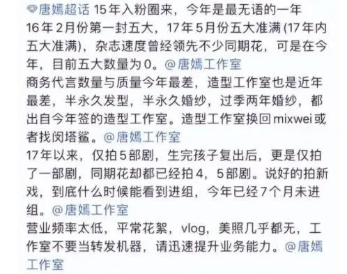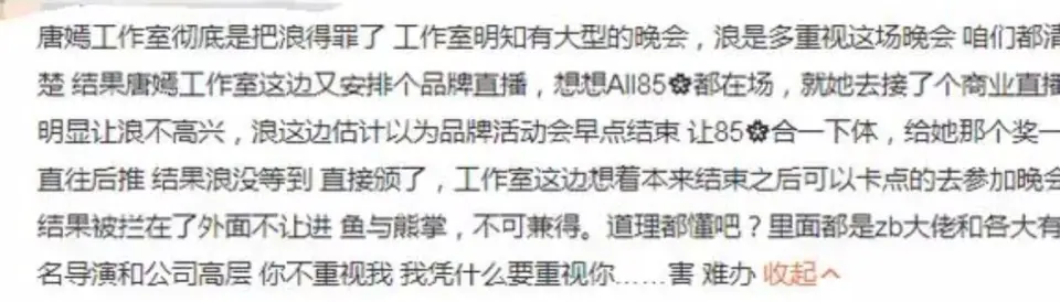 全部的人都在问“唐嫣”,那里去了? 唐嫣不是第一次玩失落,但却是第一次以如许的方式为人所知。 就在运动调解了时间,一拖再拖的情况下,她照旧成了“失落生齿” 如许的事,她不是第一次。 曾经在一次发布会上,原定2点的运动,由于唐嫣迟到不停比及3点。 来由是她要去换鞋。 其时的媒体诉苦了两点:“唐嫣爱迟到,有她的运动,根本没有不迟到的。” 第二个是她的来由总是很烂。 哄人都那么不老实。 而和刘恺威的《令媛女贼》发布会。 她再度迟到两个多小时。 现场的工作职员末了开始在台上唱歌舞蹈来延误时间。 这次听说她是在《克拉情人》的拍摄现场,弄完了才过来。 但纵然迟到了。 她款款走上台的时间,仍旧是被簇拥的小公主。 全场仍旧为她生存了欢呼掌声。 她几点到,发布会几点开始,这就是她的底气。 但如果说她是由于喜欢拍戏而误事,也不是。 由于她拍戏,也迟到。 和胡歌拍摄《高手如林》的时间,她也迟到了两个小时。 整个剧组现场等。 为了让唐嫣免于导演的责难 胡歌还曾积极的出策划策。 终极,唐嫣照旧顺遂过关。 如许的事太多了。 大概唐嫣以为这次还会和从前一样。 只是,这一次,她失算了。 当全场都在找她的时间。 她正端坐某个化装品的直播间,和主持人直播带货。 期间,也有不少粉丝好奇的扣问大概是提示,她为什么不去微博之夜。 她完全没有分析。 等她完成本身的事变,卡点去到现场的时间,才发现,这一次没人将就她了。 她被拦在门口,谈判了20分钟。 凭着一张如假包换的明星脸,生生没有进去。 厥后唐嫣方也给出了表明,说是在参演的《繁花》剧组只放一天假。 以是,就在这一天安排了直播和领奖。 但这个表明也没能得到更多的体谅。 究竟,剧组的主演胡歌也没出什么幺蛾子。 直播和领奖时间辩论也是肉眼可见。 纵然工作室安排了,艺人也可以提出意见。 况且那么大的晚会,那么多明星,她是唯一的让节目等,要卡点出场的。 岂非全部人都没她忙,商务都比她少。 而且,她在剧组照旧个三番。 到底有多忙,确实也让人猜疑。 说来说去,工作室欠好,剧组欠好。 晚会的构造方欠好。 但唯独她,内娱第一傻白甜,才是冤枉的。 事变真的是如许吗? 01、85花红的红,高出10年了。 但要说真传神切话题度高的,只有杨幂和赵丽颖。 其他的花,多多少有过颓势。 在这10年里,除了公认的杨幂、刘诗诗、唐嫣和杨颖之外,连续也有其他的花崭露锋芒。 且各个都很踏实。 热依扎凭着山海情的水花成为85后的第一个飞天视后。 童谣则凭着大爆剧《三十而已》乐成拿下白玉兰。 张小斐成了金鸡影后。 短短几年,85花的影响力就从绝对流量扩展到了正剧。 但她们之间似乎有着一条显着的分界限。 85花形成了和其他年事段迥然差异的态势。 尚有赵丽颖,马思纯、刘亚瑟。 总之无论是流量照旧实绩,各人作品都不少。 究竟还没退休。 唯独唐嫣这几年没啥作品。 如果非要说有,大概就是迩来的综艺。 疯狂刷了一下“傻白甜”和“少年”的人设。 相比其他85花,她被拉下的太远了。 02唐嫣这次能再得奖,实在算是占了85花的光。 究竟这几年她没有什么作品。 而主理方显然也是为了情怀。 究竟10年前这一波人,带着《仙剑》系列站在那边,就足以抚慰民气。 为了这一刻,主理方在作为的安排上煞费苦心。 85花们更是不敢怠慢。 礼服清一色的高定。 早早的都开始发布行程和美照。 但就在各家努力备战的时间。 唐嫣家还做了个动作。 把原定在28日的运动提前了3天。 显然,她照旧想和从前一样,既要又要。 可早就今是昨非了。 2020年,唐嫣生了孩子,似乎就在娱乐圈消散了。 粉丝一度急疯了。 他们给唐嫣总结的17年之后只拍了5部戏,生完宝宝后,只有一部。 由此可以看出,唐嫣没有戏拍不是从完婚生子开始的。 85花不大概没有本子。 但递给唐嫣的本子要么是傻白甜,要么就是年轻的尊长。 而且脚本都不怎么样。 这和她始终刻以营造本身傻白甜不无关系。 这次的综艺也不例外。 但实际上唐嫣的情商很高。 在我们综艺里。 现场被问及胡歌、霍建华、钟汉良尚有罗晋谁的演技好的高难度标题时。 她险些没有思索就找到了按照拼音排序来回复的方式。 一样平常相处,和胡歌相处成了一家人。 曾经和杨幂好的如胶似漆,她失恋难过,杨幂帮她手撕渣男,天天打电话问她需不须要本身。 和杨幂疏离后,又和刘亦菲好的和双胞胎一样。 还能和孙坚险些天天见面喝早茶,而没有绯闻。 这些你固然可以说是由于她人可爱。 但终归说到底,照旧成熟的心态和娴熟的为人处世本领。 她有本领驾御复杂的脚色。 但她一面想要营造本身可爱小公主的形象,一面又想人们透过这个外壳,发掘到她的实质。 太难了。 如果非要在85花里找个傻白甜,赵丽颖更符合。 不太会语言,人际来往本领也堪忧,很少八面玲珑,也从不报团。 但她很少谋划个人形象。 但恰恰这种个性让她在塑造脚色上有了很大的自由。 这也是她如今在85花里转型最乐成的缘故原由之一。 其他杨幂很难演贤妻、杨颖很难演职业女性、刘亦菲、刘诗诗也有驾御不了的形象。 这和她们的演技有关。 也和她们长期以来给人的既定印象有关。 同理,如果唐嫣不停还在积极打造本身“傻白甜”的形象,将来阻力不会少。 03、固然,唐嫣尚有本身的王牌。 那就是罗晋。 85花的婚姻状态确