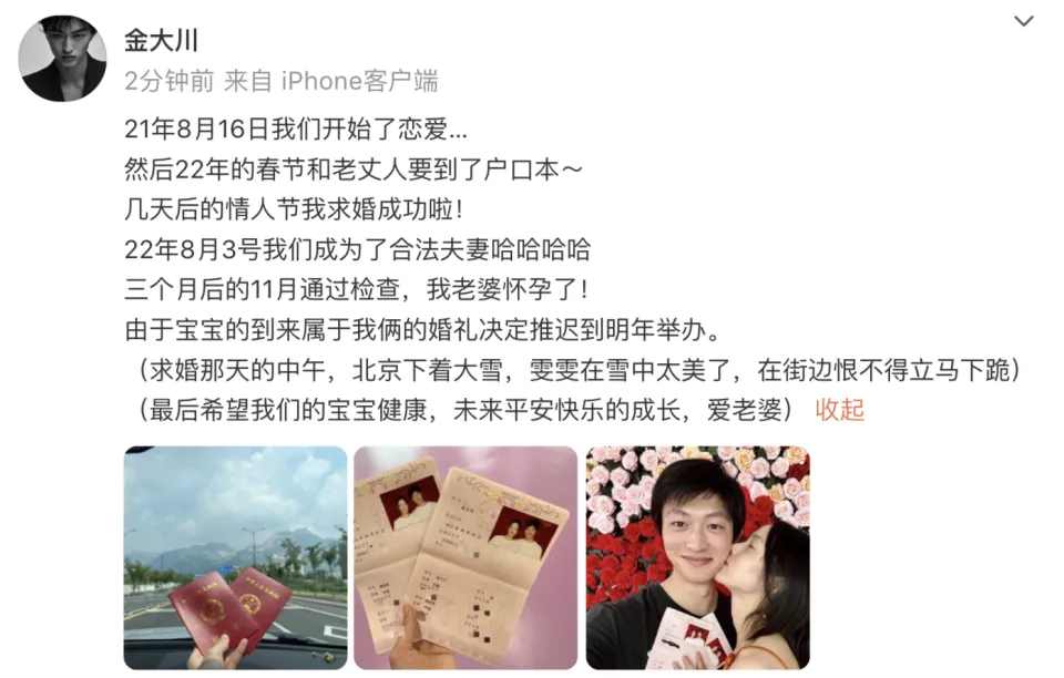 3月17日,有网友晒出金大川和雎晓雯的合影,并祝福两人新婚快乐,两位超模界的顶流完婚居然云云低调,都不提前关照一声的吗? 厥后网上又曝光了另一张两人的合影,女生腹部隆起,被网友推测怀有身孕,看来是奉子完婚。 但两位当事人都没有做出任何回应。 4月2日,金大川终于官宣和雎晓雯完婚以及有身的喜信,而且一五一十地交代了从爱情到本日的全过程,详细到某月某日,信息量巨大。 金大川透露自己和雎晓雯是在2021年8月16日在一起的,22年的春节就跟老丈人要户口本,这才来往快要半年的时间,居然就如饥似渴地想要登记了。 但终极领证的时间是2022年8月3日,也就是说两人谈爱情不到一年的时间,便去民政局登记注册了。 领证后的三个月,也就相当于是在客岁11月,雎晓雯有身,由于宝宝的到来,两人把婚礼推迟到来岁举行,以是本年3月网上曝光的照片并非婚礼现场,夫妻俩将会带着孩子办婚礼。 金大川晒出了自己的完婚证,二人已经偷偷完婚泰半年了。 完婚证件照中的金大川和雎晓雯都笑得满脸幸福,非常般配。 雎晓雯手持证件亲吻金大川的脸颊。金大川直接原图输出,连美颜滤镜都没加,二人都美满是素颜,活得很真实。 雎晓雯现身批评区幽默地留言说恭喜,金大川还复兴称“同喜”。 网友感慨两人真是闷声干大事,将来宝宝的腿得有多长啊!另有不少网友停顿在金大川和cici时期。 金大川还回想起求婚那天的场景,雎晓雯在雪中特殊美,自己恨不得在街边就立马下跪,看来厥后是换了个场所下跪求婚。 金大川也期许宝宝的到来,预祝孩子安全快乐长大,末了示爱妻子,从言语中不丢脸出他很爱雎晓雯,仿佛仍然处在热恋期。 金大川和雎晓雯是相差4岁的姐弟恋,二人经常在国际舞台上走秀,男方19岁就得到了中国名模盛典国际关注奖,女方曾被《New York Magazine》评为秋冬季的十佳新人,也多次登上过维密的舞台。 作为模特他们在天下排名都非常靠前,以是两个精良的人肯定有许多共同语言。 二人的恋情曝光是在2021年9月1日,二人多次接吻,非常甜蜜。 这么算起来,他们当时在一起才只有半个月的时间,就被狗仔拍到了。 再厥后,二人经常牵手现身机场,从不避忌,但也不做任何回应。 本年2月,网友发现两人都已经在无名指上戴了婚戒,原来他们在客岁8月份就已经领证了。 不外前不久有狗仔队曝光两个人的行程,一上车又亲上了,固然这不是重点,重点是开车期间,男方多次违背交通规则,好坏常伤害的操纵。 毕竟是公众人物,盼望金大川要做好榜样,更是为了自己、妻子和孩子着想,宝宝的安全康健也离不开爸爸的积极和自律啊! 末了再一次恭喜金大川和雎晓雯,超模界的金童玉女肯定要狠狠地幸福下去! |