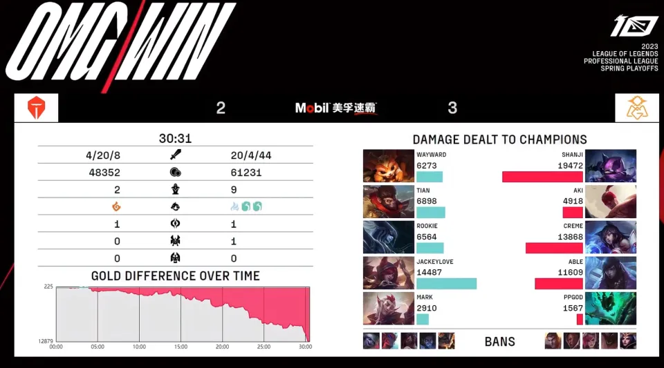 本日4月2号好汉同盟LPL季后赛,由TES战队对抗OMG战队。第一场角逐TES战队碾压局轻松取胜,然而第二场角逐Shanji招牌兰博提前增援打赢下路团,搞得TES上野非常暴躁,总想对兰博动手,但每次都被反杀,Rookie妖姬完全切不动人,因此被OMG战队扳回一分。 第三场角逐Shanji塞恩开局玩套路,一级入侵野区绝食搞事,断送兵线帮下野取得上风。不外Aki职业生活只在公开练习赛里玩过一把蜘蛛,感觉好汉纯熟度比力一样寻常,节奏补刀落伍太多。中期OMG接团直接被碰碎,正面根本扛不住,再加上Rookie狐狸换惩戒抢大龙,使得TES战队乐成取得赛点。 第四场角逐OMG猴子开局梦游,被大树一人反光野区,下路也被越塔双杀。不外OMG三路对线打得好,猴子仗着队友上风控下全部资源,Shanji奎桑提断兵线送塔掩护队友拿小龙,还要一打三反杀Rookie小炮! 后期JKL泽丽团战输出拉满,但Rookie小炮秀出内鬼操纵,对着月男推推棒救死扶伤,导致队伍输团丢电龙魂,两队开始生死决斗! 决胜局OMG打野盲僧开局又炸了,但中上上风增援取得双杀,小天强行越塔被反杀,Rookie四禁中单选冰女,然后对位落伍三级。 只管TES阿水对线打出很大上风,但中上野都崩了,最关键的小龙团Wayward纳尔闪现空大,惨遭团灭以后就没法玩了。终极TES战队劣势过大,以2-3得分输给OMG战队,止步季后赛八强! OMG战队时隔2173天终于赢下LPL季后赛Bo5,之前山鸡拿三阵上单还受到不少质疑,但本日他用力气重新证实本身,无论操纵还是套路都显现灵性,每把角逐都能Carry,如今版本上单元置能打出云云高光的表现真的让人难以置信! TES战队止步八强,Rookie彻底沦为配景板,对线无论选什么都被压抑,团战稀烂秀出推推棒操纵,Doinb就地直言:“我就说了他不会玩小炮,春季赛小炮那么强没选过,伤害算得禁绝!”从四禁中单玩冰女就看出Rookie的好汉池已经左支右绌,曾经的积极哥要背上一口最大的背锅。 不外TES战队输给OMG也不算爆冷,究竟他们通例赛状态那么差,除了Jackeylove以外的其他人都没发挥好,题目不但是出在中路一人身上。赛后TES队员担当采访,媒体问Wayward春季赛竣事之后对本身接下去有什么样的猜测,Wayward笑哈哈地答复:“好好用饭,好好睡觉,然后好好练习吧!” 感觉Wayward已经彻底开摆了,被山鸡爆成如许好像也没什么感触,完全没有受到影响。究竟Wayward原来就是暂时被拉上来打的,纵然被镌汰也轮不上他背锅,夏季赛能不能上场还不肯定呢。 TES战队以八强效果竣事季后赛征程,估计接下来的休赛期会对队伍做出巨大的调解,至少上路位置得确定首发了。那么各人对于TES战队止步八强的这件事有何见解?欢迎留言,分享你的见解! |