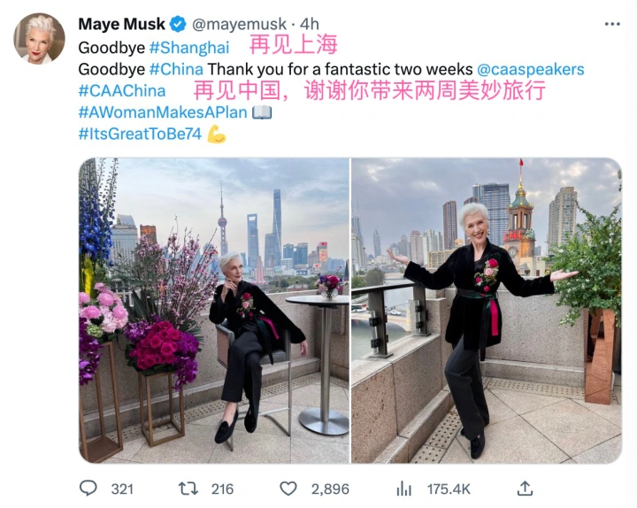 “再见上海;谢谢中国,我度过了优美两周。”4月2日,美国特斯拉首创人、推特CEO埃隆·马斯克的母亲梅耶·马斯克 (Maye Musk),在其网络交际平台总结此趟中国行的路程,多次提及“在中国玩得很开心”“每个人都很和睦”。 本年74岁的梅耶,当了50年模特,登上过多个时尚刊物。在交际平台,她将自己形貌为“国际脱销书作者、拥有2个理学硕士学位的营养师超模”。据梅耶透露,此趟来中国重要是旅游观光并签售新书,本月即将拿到营养学博士学位。 在梅耶受关注的背后,并不但是由于她是埃隆·马斯克母亲的身份,还因其履历人生打击后,敢于冒险、保持前行的乐观人生态度。也正因此,梅耶被网友称为“比天下首富还牛的女人”。 晒图打卡7地美景 “我在中国过得很愉快”梅耶在中国观光的的末了一站是上海。4月2日,梅耶身着黑丝绒外套,坐在兰花边上,与远处的东方明珠合影。她用照片向上海告别,感谢中国让她度过两周优雅观光。 3月29日,梅耶还来到浙江湖州,晒出打卡湖州影视城的视频日记。湖州影视城作为南太湖之畔一颗璀璨耀眼的新星,城内复原了被称为“万国构筑博览群”的上海老外滩,构筑集哥特式尖顶、古希腊式穹隆、巴洛克式柱子等浩繁经典构筑情势于一体,形成了独特的上海滩景致,再现了老上海的繁华情形。 3月27日,梅耶穿上一身奶油色西装,与远处的苏州地标东方之门合影。为了此趟中国行,梅耶说出行前在很多网站上搜索符合衣服。这件布满玫瑰花的上衣,出自中国鄂尔多斯的计划师之手。后一天,梅耶还嬉戏了有500年汗青的苏州园林,与樱花、古亭、古松等合影。 3月22日,梅耶称在广州度过优美一天。在分享新书前,她嬉戏了多个景点。照片体现其游览了沙面岛,搭船夜游珠江,欣赏两岸夜景,还登上广州天河CBD大厦103层,遥望被称为“小蛮腰”的广州塔。 从梅耶公开推文看,来到中国两周时间里,她在湖州、上海、广州、苏州、厦门、成都、武汉等7地景区打卡,期间在湖州影视城、厦门南普陀寺、苏州园林、成都金沙遗址博物馆等着名景点嬉戏,照相留念,观看川剧变脸演出等。在其分享图片下,浩繁外国网民留言表达了对中国文化的喜好,不少网友体现等候也去中国观光。 别的,也有不少中国多地网友对梅耶·马斯克发出观光约请。梅耶回应:“谢谢。我在中国过得很愉快。每个人都很和睦”。 单亲抚养3个孩子长大 困难时向孩子借衣服穿此趟中国行,梅耶也为其71岁这年写的新书《人生由我》做宣传。她将此书总结为12个字:一生冒险、漂亮和乐成的发起。 梅耶在新书中形貌自己人生履历,多次推倒重修人生,在3个国家9个都会生存过:15岁第一次登台,22岁完婚,31岁成为休业只身母亲,随后辗转在3个国家生存,造就出3名出色子女。60多岁重返模特舞台,本月拿博士学位。 书中,梅耶也追念大儿子埃隆·马斯克出生履历。她说,“埃隆出生时我二十三岁,这在1971年是女性分娩的均匀年事,我履历了三天假性分娩,白天不停在宫缩,直到晚上才制止。到了真正分娩时,过程也非常困难,由于埃隆的脑袋太大,而且他照旧8磅8盎司(约3.8千克)的胖小子。” 梅耶也在书中写道,在埃隆·马斯克小时间喜欢看各种各样的书,不会忘记读过的每个字,“我们叫他‘埃隆百科’”。1993年,埃隆·马斯克在12岁那年得到人生第一台电脑,他用代码写了一个盘算机游戏“Blastar”投稿给《电脑杂志》,得到500美金报酬。 由于是单亲家庭,梅耶不停做营养师、模特赢利抚养孩子,经济并不富裕。在一次飞往多伦多时,航空公司将梅耶的行李丢失。由于买不起新衣服,梅耶只能不停跟埃隆借衣服穿,几个月时间里,她不停向被别人表明为什么穿得这么希奇,“欠盛情思,我这么穿是由于行李被弄丢了。” 在3年零3周内,梅耶生养了三个孩子。她说孩子们上大学白手发迹申请助学贷款,如今为他们成绩感到得意,“老大埃隆正在制造电动汽车促进环境掩护奇迹,同时他也在开展火箭发射奇迹。老二金博尔开了一家农场食材直供餐桌的餐厅,而且他还传授天下各地的孩子学习制作水果园和蔬菜园。我最小的女儿托斯卡谋划着自己的娱乐公司,专门制作和导演脱销小说改编而成的爱情影戏。 ” 梅耶个人网站体现,这本书已经被印刷为26国语言版本,向举世发行。潮消息记者检索当当等网络书店发现,此书有不少宣传先容,比如“在失败中变得更强”“独立女性的出色人生”“乘风破浪的妈妈”,多家店肆销量已达10万+。在亚马逊上,该书售价该20.43美元,库存仅为17本。 同时走秀与带孩子 “统统和年事无关”“只管学习过程令人沮丧。但对于我而言这是一段很棒的履历。”谈及上网,梅耶说学习新技能永世不会太迟,“当我在交际平台发布信息,粉丝们很快让我知道他们喜欢什么或是不喜欢什么。” 梅耶感叹,网络可以资助她朝着人们感爱好的方向进步。对她来说,“交际媒体真是巨大的发明”。一位计划师看到她网上的照片,约请67岁的梅耶在纽约时装周走秀。也由于交际媒体,梅耶和一家模特经纪公司签约,在69岁那年成为史上年事最大的”封面女郎”。别的,很多拍照师向她邀约拍摄,给了她更多拍摄机会。 成为“网红”后何时退休?74岁的梅耶把她母亲作为学习榜样。她曾在推特告诉马斯克,“你的祖母在96岁退休,由于她坐在轮椅上,无法展示她的艺术。然后,她如饥似渴地读书