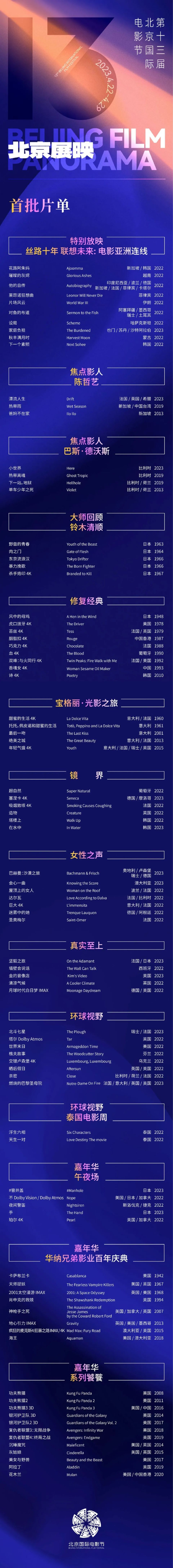 就在刚刚,第十三届北京国际影戏节公布了“北京展映”的第一批片单。 本年片单仍旧强大且精彩,既有费德里科·费里尼如许的大家经典回首,也有铃木清顺、巴斯·德沃斯、陈哲艺如许的国际影坛生力军作品,尚有《卡萨布兰卡》《肖申克的救赎》《胭脂扣》等着名影片放映,嘉光阴单位则有迪士尼公主系列、《复仇者同盟》《功夫熊猫》《银河保护队》等超等商业大片连映,简直不要让人太高兴。 艺绽君爆肝一整天,为各人优中选优,吐血整理出15部最值得买票去看的影片,各人照着买票就行啦。 《下一个素熙》 导演:郑朱莉 范例:剧情 这部影戏是客岁戛纳影戏节影评人周单位的闭幕片。片中的素熙,是一个被黑心公司PUA、被学校扬弃、蒙受巨大压力而殒命的女生,一位女刑警开始观察她的死因。这部作品发挥了韩国影戏不停关注实际题目的优点,社会批驳的广度和力度都很到位,而且堪称一部纯粹的女性影戏。 《小天下》 导演:巴斯·德沃斯 范例:剧情 本年北影节展映单位选取了比利时导演巴斯·德沃斯作为焦点影人之一,将展出他的《小天下》《热带离魂》《下一站,地狱》《单车少年之死》等作。这部《小天下》报告一位罗马尼亚移民工人和一位华裔生物科学博士偶然相遇并由于苔藓而擦出浪漫火花的故事。影片显现了苔藓微小而幽深无穷的天下,很有东方美学中“一花一天下,一叶一菩提”的意境。 《胭脂扣》(4K) 导演:关锦鹏 范例:剧情/爱情/奇幻 本年北影节推出了一批经典影片的修复版本展映,《胭脂扣》这部华语爱情经典就是此中之一。张国荣和梅艳芳不但在银幕上将“风华旷世”四字显现得极尽描摹,也用一段凄美怅然的故事揭破了爱情里的脆弱和苟且。 《诗》(4K) 导演:李沧东 范例:剧情 韩国大导演李沧东与“女神级奶奶”演员尹静姬相助,这部报告怎样写一首诗的故事拍得深沉而迷人。影片在悠长清静中深藏剧烈感情,外貌上在讲文艺奶奶的诗意生存,背后却匿伏着巨大的暴虐、罪过和隐痛,映射着韩国社会。 《吸烟致咳》(4K) 导演:昆汀·杜皮约 范例:笑剧 假如你对现在泛滥的超等好汉影戏反感至极,那么这部有点无厘头的特摄片肯定能让你劳绩许多高兴。影片通过一群“烟草复仇者同盟”搞团建的故事,对超英影戏举行了非常到位的讽刺,将反范例举行到底,怪诞又搞笑。 《在水中》 导演:洪常秀 范例:剧情 高产导演洪常秀的最新作品,入围了本年的柏林影戏节遇见单位。影片是一个关于拍影戏的故事,报告一个年轻的演员转型拍短片。片中有大量虚焦镜头,观看时万万别猜疑装备出题目了,就是这个style!洪常秀的絮絮叨叨、一样平常生存中的尴尬和幽默、灵光乍现的诗意在片中都有显现。 《甜蜜的生存 》(4K) 导演:费德里科·费里尼 范例:剧情/笑剧 意大利影戏大家费里尼的代表作,报告一位中产阶层记者在腐朽、空虚的生存中挣扎并终极堕落的故事。上层社会的生存看似甜蜜,却充满了心灵孤独和精力焦急。影片场景雄伟又过细,犹如卷轴一样平常,尽显大家情况,此中蕴含的表达即便过了这么多年也绝不外期。 《年轻气盛》(4K) 导演:保罗·索伦蒂诺 范例:剧情/笑剧 “意大利三雄”导演之一的索伦蒂诺通过两个功成名就的老人在度假旅馆的闲逛闲聊,探究关于生命、已往、将来、孤独等哲学思考。影片场景富丽,构图风雅,还时不时有幽默风趣的金句台词,两位老戏骨的演出也非常棒。 《塔尔》(杜比全景声) 导演:托德·菲尔德 范例:剧情/音乐 固然“大魔王”凯特·布兰切特在本年的奥斯卡影后之争上输给了杨紫琼,但这不代表她在《塔尔》中的演出很一样平常。相反,“大魔王”把片中这位不择本领、身居高位的指挥大家演绎得入迷入化。女性要得到乐成就得像夫君一样吗?人在权利和名利眼前要怎样把控本身?怎样对待艺术家在才华和道德上的不平衡?享受完这部精彩作品后应该会产生许多思考。 《晒后沐日》 导演:夏洛特·威尔斯 范例:剧情 客岁戛纳国际影戏节上技惊四座的童贞作,导演是苏格兰出生的作家夏洛特·威尔斯。影片报告女主角回想20年前她11岁时和父亲度过的一个假期,在平庸无奇的琐事中描绘出父母与子女的感情。故事固然很私人,但影片独特精炼的美学风格和纯熟的导演本领却俘获了许多影迷的心,此中惆怅又风雅的感情更让人回味。 《密切》 导演:卢卡斯·德霍特 范例:剧情 两个13岁的男孩,一段密切的交情,一段无可挽回的失去……这部影戏入围了客岁戛纳主比赛单位。导演用最豁亮的色调拍出了最令人痛彻心扉的芳华发展故事,影片还探究了性觉醒、校园霸凌、对性别的刻板印象等话题。 《卡萨布兰卡》 导演:迈克尔·柯蒂兹 范例:剧情/爱情/战争 英格丽·褒曼惊艳举世的颜值、战火纷飞中的三角恋情、尚有那首好听的《As Time Goes By》,都让这部影戏成为一代代影迷必看的经典。影戏将大期间的汗青变乱与小人物的感情天下相联合,洞视人类心灵深处,显现真爱的难得和巨大。 《肖申克的救赎》 导演:弗兰克·德拉邦特 范例:剧情/犯罪 有多少人把《肖申克的救赎》视作本身最爱的影戏?“有些鸟儿是注定不会被关在牢笼里的,它的每一片羽毛都闪耀着自由的光辉。”这部影戏经得起韶光查验,长年在豆瓣、韶光网、IMDb等各大影戏网站排名第一。 《2001太空周游》(IMAX) 导演:斯坦利·库