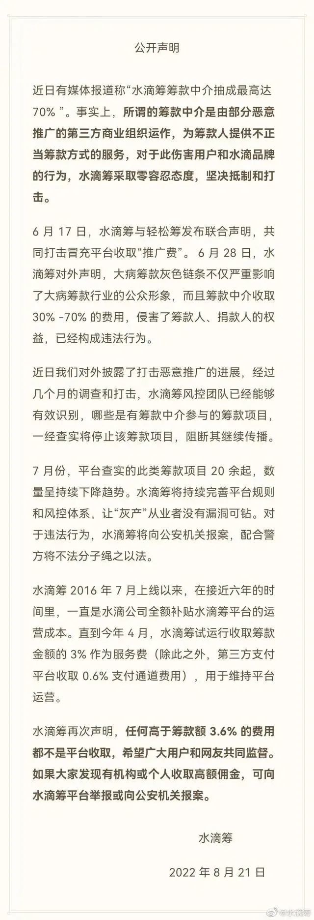 作 者丨武瑛港 编 辑丨徐旭,刘雪莹 图 源丨图虫 8月21日,有媒体报道指出,水滴筹筹款中介抽成最高达70%,水滴筹也因此事登上微博热搜第一。21日,水滴筹官博就网传筹款中介抽成一事作出回应,表现所谓筹款中介是由部门恶意推广的第三方商业构造运作,为筹款人提供不正当筹款方式的服务。 根据广西壮族自治区专项办信息,制止本年7月尾,广西共侦破养老诈骗类案件865起,抓获975人,逮捕102人、告状43人,打掉团伙104个,追赃挽损9415.47万元。 此中尤其值得关注的是使用大病筹款举行诈骗的案件,据相识,本年5月广西平南县公安局多部门联动,对涉嫌使用“爱心捐助”、“爱心筹助”、“爱心筹款”、“大病接济”等9个非法众筹平台在湖南、广西两省份诈骗接济款系列案件举行收网。 举措抓获以郭某某为首的诈骗团伙成员22人,捣毁空壳公司12个,诈骗网站9个;案件涉及爱心捐赠者50多万人,被骗困难患者3000多人,骗取400多万元;涉及区表里医院800多家,冻结涉案资金30余万元。 而这一依附于大病众筹的灰色链条,大概将给面对多重挑衅的互联网大病众筹行业带来更大的生存压力。面对“灰产”的裹挟,整个行业又该怎样破局钻营康健可连续发展? 行业最大的挑衅 针对灰色财产链,水滴筹、轻松筹曾发布团结声明,表现平台从未授权任何第三方构造或个人向筹款人提供所谓的推广服务,一旦筹款过程中出现恶意刷单、先捐后返等使用,都将触发平台风控机制,被判断为违规举动,平台将制止筹款服务,把筹款人列入筹款黑名单,已经筹集资金将原路退还捐款用户。 据相识,这一灰色财产链紧张有两个特性,第一是收费比例非常高,有的是30%、40%,以致高达70%,这显然不是出于善意,而是以谋利为目标;第二是冒充筹款人的支属,通过各种平台频仍发布筹款链接。 而选择和恶意推广相助的筹款人,大部门是多次发起过筹款的患者,他们所患疾病大多是白血病、慢性癌,治疗淹灭高且周期长,其家庭经济难以负担高额医疗费用。在多次筹款之后,患者通过自己的交际关系网已无法再筹到钱,以是明知恶意推广收取高额佣金,只能无奈担当。据分析,恶意推广举动背后,着实存在着小部门无力负担巨额医疗费用的告急患者的刚性需求。 水滴筹风控监察负责人郭南洋表现,恶意推广固然给这些患者筹到一部门资金,但代价却是整个行业生态的粉碎,导致广大用户对告急案例真实性产生质疑,进而影响对大病筹款行业的信托,这会让其他筹款人更难得到资助,“爱心人士捐款的本意是盼望资助筹款人,假如此中大部门被恶意推广者抽走,现实上是诱骗。” 中国互联网协会法治工作委员会副秘书长胡钢也曾对媒体表现,“职业筹款推广人”以及高额抽成征象的出现,是对公共慈善奇迹的一种伤害。我国慈善法明确规定,任何构造和个人不得私分、调用、截留或陵犯慈善财产。假如告急者在筹款的时间,没有向捐助者告知捐助资金的分配方案,比方需付出七成作为“推广费”,那么对捐助者来说也是一种诱骗。 别的,尚有互联网平台行业人士克日担当21世纪经济报道采访时指出,现在大病筹款行业最大的挑衅就是来自于外部的灰产、黑产的打击,很多互联网平台都深受灰产、黑产的困扰,其肴杂了公众的视听,使各人对大病筹款的真实性产生担心,在灰产眼前,企业的风控本领、规则本领和公安团结打击的本领都要举行升级,这也是面对挑衅的一部门。 行业面对多重挑衅 除了恶意推广等灰色财产链的影响,商业属性与公益属性的讨论以及自我造血本领的提升,大概也是大病筹款行业面对的紧张挑衅。 2022年4月7日,水滴筹公布,为维持平台稳固运营,开始试运行向筹款人收取平台服务费,平台服务费的收取尺度为单个筹款子目提现金额的3%,且单个筹款子目最高不高出5000元,别的第三方付出平台还将收取0.6%的通道费。 收取平台服务费一时引起较多讨论,背后着实折射出大病筹款行业面对的商业属性和公益属性关系的标题,有分析表现,大病筹款平台的运营方同时要面对筹款者的需求以及投资人的盼望,如安在商业和公益之间做好平衡,是一个仍在学习过程当中的课题。 西南财经政法大学相干研究职员曾分析称,由于像“水滴筹”如许的平台并不属于慈善构造,并没有在民政部门举行相干登记,运动不受民政部门的羁系,现在我国类似“水滴筹”之类的网络慈善平台所属的公司为营利性法人,网络慈善众筹平台只是其公司下的一个业务板块,如许的业务板块固然具有肯定公益性,但由于业务负担的主体是营利性构造,因而必要注意平台内在营利性驱动的有用控制标题。 别的由于网络慈善众筹平台不是慈善构造,个人告急也不是慈善募捐,不实用《慈善法》相干规定,羁系主体方面也不存在明确的规定予以支持。因此,网络慈善众筹平台在法律规制方面还存在相称多的缺失。 而水滴筹的定位是借助商业的力气来资助有必要的大病患者群体。但水滴筹不属于公益。 除了商业属性与公益属性的关系,收取筹款服务费还表现出大病筹款平台在“自我造血”本领方面面对的检验。根据水滴筹官网信息,已往五年多,水滴筹维持运营所需的本钱,不停由水滴公司补贴,未向筹款人收取费用。随着运营本钱逐年上升,水滴筹平台接纳了多项低沉本钱、进步服从的步调,但仍无法完全覆盖平台一样平常运营所需本钱。为了