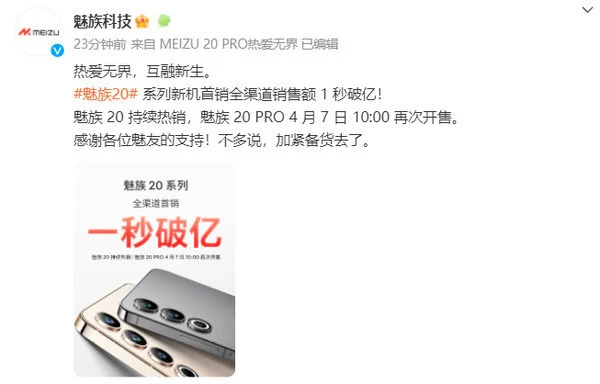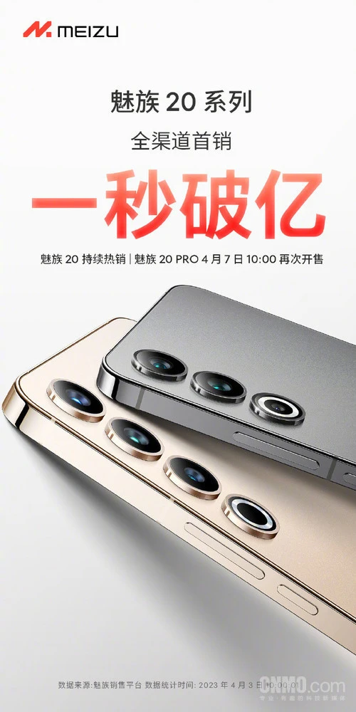【手机中国消息】4月3日上午10点,魅族20系列(魅族20、魅族20 PRO)正式迎来首销。魅族20系列是魅族走上新征程后推出的首款机型,也是时隔一年多时间后,魅族再次推出旗舰新机。魅族20系列上市后会不会受到斲丧者青睐,能不能助魅族重回正轨,这是许多人关心的标题。如今,魅族官方公布了魅族20系列的首销战报:魅族20系列新机首销全渠道1秒破亿! 魅族20系列首销全渠道1秒破亿 作为参考,魅族20售价2999元-3799元,魅族20 PRO售价3999元-4799元。以4000元的代价来算,魅族20系列1秒大概卖出了25000台,效果不错。 魅族20系列首销全渠道1秒破亿 魅族20系列能受到斲丧者的接待,跟其平衡的设置及2999元的起售价应该有很大关系。设置上,魅族20系列全系搭载了第二代骁龙8旗舰移动平台,接纳台积电4nm制程,搭配LPDDR5X+USF4.0,性能精彩。并搭载全新Flyme 10体系,支持全视鹰眼、隐形妙靴、全链路防诈等实勤奋能。手机配备新一代超声波指纹辨认,可以做到0.075s疾速解锁。 魅族20 其他方面,魅族20配备了一块6.55英寸144Hz电竞级护眼直屏,支持10.7亿色表现、100%DCI-P3广色域;后置5000万像素超感光三摄像头,前置3200万像素高清镜头;内置4700mAh电池,支持67W快充,仅需45分钟就能充至100%。 魅族20 PRO则搭载了一块6.81英寸2K 120Hz全面屏,支持1800nit峰值亮度、1500Hz瞬时采样率;后置5000万像素超感光主摄+5000万像素超广角镜头+5000万像素人像镜头,前置3200万像素高清镜头;内置5000mAh电池,支持80W快充,只要35分钟手机就能布满电。 |