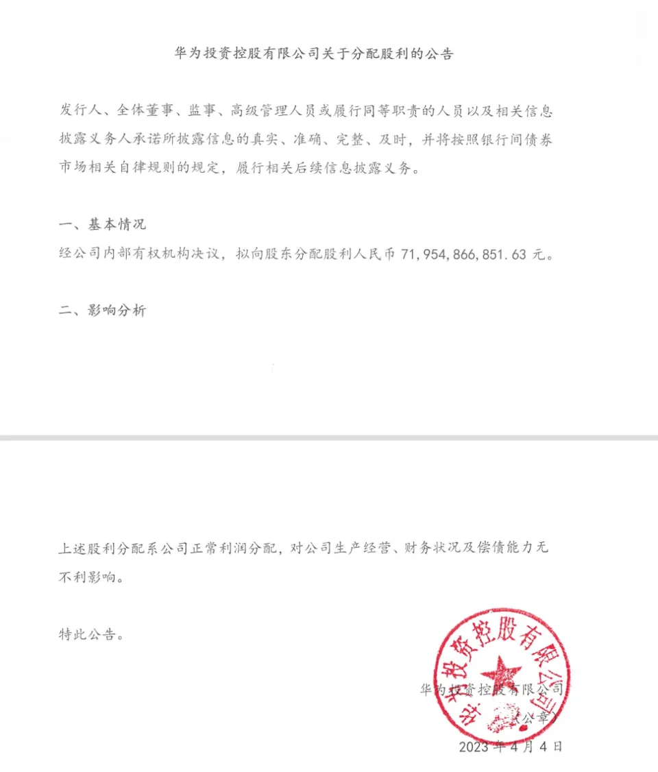 每经编辑:李泽东 4月3日,华为内部论坛“心声社区”公布:2022年度工会捏造受限股分红预计为人民币1.61元/股,分红以后捏造受限股代价预计为人民币7.85元/股。 4月4日,华为投资控股有限公司在北京金融资产买卖业务所官网登载了年度分配股利的公告。公告体现,经公司内部有权机构决定,拟向股东分配股利约720亿元。上述股利分配系公司正常利润分配,对公司生产策划、财政状态及偿债本领无倒霉影响。 据华为2022年财报,克制2022年12月31日,华为员工持股操持到场人数为142315人,均为华为在职员工或退休生存职员。此中,任正非作为自然人股东持有公司股份,也到场了员工持股操持。克制2022年底,任正非的总出资相当于公司总股本的比例约0.73%。 按此盘算,华为持股员工均匀分红约50.5万元/人。 3月31日,华为公布了2022年年报。2022年,华为实现举世贩卖收入6423亿元,净利润356亿元。值得留意的是,2022年度,华为研发费用总额为1615亿元,研发费用率25.1%。据统计,华为十年累计投入的研发费用高出9773亿元。 华为首席财政官孟晚舟体现:“2022年,策划依然面临较大压力,总体而言,策划业绩符合预期。2022年末,华为的资产负债率为58.9%,净现金余额1763亿,近万亿的总资产规模中,现金、短期投资、运营资产等高活动性资产构成了资产的主体部分,财政状态连续妥当,具有较强的韧性与弹性。” 华为副董事长、轮值董事长徐直军体现,只有维持和加大在一些范畴的研发投入,才华确保高质量的业务一连。同时,只有确保和增强研发投入,才华不绝创新。通过架构重构、体系工程、优化操持等提升产物竞争力。只要有高质量的业务一连和有竞争力的产物,就能连续生存与发展。 孟晚舟:个人案件已划上句号 华为从来都不是个人交班3月31日下战书,华为举行2022年年度陈诉发布会。华为轮值董事长徐直军以及华为首席财政官孟晚舟出席了发布会。 陈诉体现,2022光阴为团体策划安稳,实现举世贩卖收入6423亿元,净利润356亿元。面向未来,华为连续加大研发投入,2022年研发投入到达1615亿元,占整年收入的25.1%,十年累计投入的研发费用高出9773亿元。 “雪后疏梅正压枝,春来朝日已晖晖。对我们来说,我们有压力,更有信心。”华为副董事长、轮值董事长、首席财政官孟晚舟在现场体现,“我的个人案件(加拿大引渡案)已画上句号”。 会上,孟晚舟回应了将于4月1日起正式当值轮值董事长一事。“依照公司《管理章程》,我们是体制的交班、制度的交班,从来都不是个人交班,而是团体向导。华为不把公司运气系于个人身上,而是‘一张蓝图画到底’。公司的管理章程已经明白了轮值的职责,我和其他两位轮值董事长都是一样的,我们都会按照规则推行。“ 3月27日、28日,华为投资控股有限公司工会第四届持股员工代表会在深圳坂田华为基地召开聚会会议。聚会会议举行了华为投资控股有限公司董事会换届推举,产生了公司新一届董事会董事长及董事会成员。最令人关注的是,华为董事会确定副董事长徐直军、胡厚崑、孟晚舟继承公司轮值董事长。轮值董事长轮值期为六个月,孟晚舟将于2023年4月1日~2023年9月30日继承轮值董事长。 有记者提问华为轮值董事长孟晚舟如今去美国出差是否影响?孟晚舟体现,随着法官允许警方的撤诉申请,我的个人案件画上句号。孟晚舟体现,华为进入举世 170 个市场,我们的每一位员工都会根据工作的必要以及工作操持来安排正常出差。我和我的团队都在工作中忠诚履职于我们的业务,服务于我们的客户。 会上,谈及华为手机何时能规复5G芯片时,徐直军回应称,“供应链遇阻使得我们的手机业务受到的影响最大,从天下第二到‘Others’的行列。如今只能制造4G的,但由于我们在折叠屏、在体验上不绝进步,尚有人乐意买4G手机,我们的折叠手机可以做到跟直板机一样的重量,假如要等待买到华为的5G手机,要等待美国商务部的允许。” 在华为无法得到富足核心零部件供应的环境下,华为手机自2021年开始在IDC公布的出货量榜单中就已被列入“Others”的行列。华为空缺出的高端市场紧张被苹果承接,如今苹果已经是中国高端手机市场的向导者。Counterpoint Research发布的数据体现,2022年10月,苹果公司在中国的月度市场份额达25%,为汗青最高程度,而且一连两个月成为中国市场第一大手机品牌厂商。 徐直军:2023年,是华为生存与发展的关键之年3月31日下战书,华为发布了2022年年度陈诉。华为轮值董事长徐直军体现:“回首2022年,严肃的外部环境和非市场因素,继承影响着公司策划。身处狂风雨中,我们在继承疾驰,积极保障业务一连,确保对客户的支持与服务;我们也积极多打‘粮食’,使本身既能生存下来,也能为未来的发展打下底子。” 徐直军夸大:“2023年,是华为生存与发展的关键之年。本日的华为,就像梅花,梅花飘香是由于它履历了寒冷淬炼。我们面临的压力无疑是巨大的,但我们也有增长机遇、有组合韧性、有差别化上风、有客户和搭档的信托和敢于压强式投入。因此,我们有信心克服艰巨困苦,实现连续生存和发展。” 会上,孟晚舟在回应怎样对待财政妥当上体现,“从两个方面来看,我们的客户和互助搭档依然在信任华为、选择华为;其次,客岁末,我们的净现金余额是1763亿元,可以支持大部分商业操持,总而言之,我们依然存在,还将继承存在。” 她还体现,“我笃信,