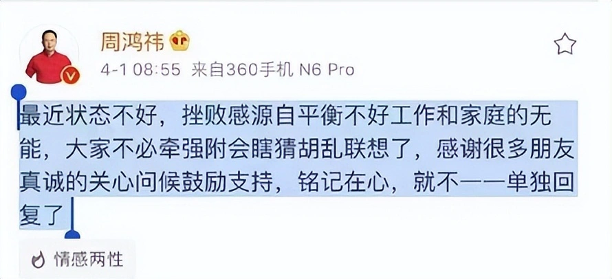 4月4日,互联网巨头三六零突然发布了一则公告,官宣董事长周鸿祎与老婆胡欢已正式仳离,颠末协商,两人已包揽理了仳离手续。 根据仳离协议,胡欢将得到周鸿祎所持公司44658.52万股股份,约莫占总公司的6.25%,按照当日的股市收盘价盘算,代价高达90亿元。 消息一出,瞬间引发了网友的热议,谁也没想到,互联网大佬周鸿祎也会有仳离的一天,而且分手费也是天价,数字大到让人不敢想象。 不外,据公告表现,胡欢只管分得了这笔股份,但在半年内不得减持,而且胡欢此前并未在公司任职任何职务,以是对于公司的管理层不会有任何影响。 简朴来说,周鸿祎仳离的财产分割,完全由他个人负担,并不会影响公司正常策划。 而且据数据体现,从本年的1月份到4月份,三六零股价飙升,短短2个多月的时间,股价涨幅182%,换手率更是高达250%。 从这个数据可以看出,胡欢得到的股份市值,在短期内,增长了近58亿。对于她来说,这无疑是一场美满的胜利之战。 然而,这个突然的消息,却让不少网友们也产生了质疑,不停恩爱的夫妻,为何突然之间就仳离了? 要知道,周鸿祎和胡欢这对夫妻,曾被很多人倾心,他们是真正共苦难的两口子。在周鸿祎创业初期,胡欢不停都是他背后的女人,包罗建立公司的启动资金,也都是胡欢给的。 厥后,周鸿祎创业遇到了崎岖,胡欢也不停鼓励支持他,这给了周鸿祎无穷的力气。 以是说,周鸿祎能有本日的成绩,离不开胡欢的大力支持,从这个角度来说,他俩仳离真的让人难以信赖。 因此不少网友对于这个事抱有猜疑的态度,一部分网友表现,有一种大概是仳离不离家,这不外是他们给自己留退路的一种方式,保禁绝这是为了套现。 不外也有网友以为,创业夫妻乐成后,多半都会仳离,由于很多夫妻能共苦,但不能同甘,毕竟在外是乐成的老板,在家里最不平他的就是老婆。 固然,也有听说说,周鸿祎是有了警惕思,他大概会走刘强东的蹊径,之后找一个貌美如花的小姑娘。 对此,个人暂不发表意见,毕竟大佬的心思,不是一样平凡人能懂的。 不外,关于他们仳离的听说,真的不是空穴来风,早在2018年就有传出,当时周鸿祎发朋侪圈感叹,称“我的人生竟然云云失败,没有任何意义!” 厥后,很多人出于关心,扣问周鸿祎发生了什么事,他回应表现,自己是状态欠好,心田布满了挫败感,缘故起因是平衡不了工作和家庭关系。 从这一点可以看出,周鸿祎和胡欢发生婚变,多半是两个人感情出现了抵牾,这些年里,不停在积怨,直到如今,两个人才找了一个最符合的机遇,选择仳离。 不管怎么说,能和中分手,就是最大的体面,对于周鸿祎来说,这大概是一种解放,对于胡欢来说,人生过半,能有云云一笔款项赔偿,也算是满足了。 但具体什么缘故起因,外人临时都不知道,以是各人照旧且看且爱惜,大佬的天下,不是我们凡人能想的。 |