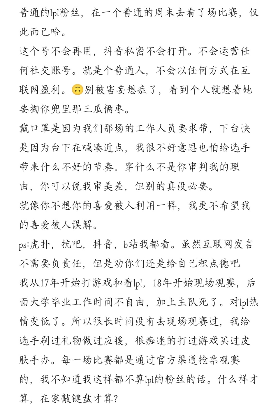 (反对网暴...) 前几天BLG克服RNG的季后赛,在赛后粉丝互动环节,上来了一位非常漂亮的女粉丝,身高腿长皮肤白,轻声细语嗓音甜,连小钰都不由得歌颂:“哇哦。” 是Elk粉丝 这位女生说她是Elk的粉丝,从他还在WE ID叫旧梦的时间就开始关注,很开心Elk来到得当的团队,盼望他去到更高更远的地方,让更多人知道Elk的名字。末了也灵活烂漫地和Elk合了影。 在合影环节,Elk有点含羞,不敢看女粉,双眼直视火线比出大拇指手势。女粉没有特意比手势,急遽合完影就用手半遮脸离开了。 网友质疑 很多网友就质疑她是不是真的LPL或旧梦的粉丝,只是费钱请来的托儿。 说托儿都算是“克制”的了,更刺耳的乃至是说,小姐姐是网红博出位,以及...... 实在是WE铁粉 B站UP主@抽风的飞机 采访到这位粉丝,粉丝表明她是WE的队粉,没看WE那一场是由于那天要上班,以是才来支持从WE出来的Elk。从这个采访视频也能看出,粉丝脱下口罩颜值也很能打,确实优劣常悦目。 愈发闹大 关于这位女粉的讨论在各个平台都有,有的夸确实悦目,心动了;有的说欠悦目,只是有海克斯科技(整容)和女妖面纱(化装);最多的照旧说她不是真粉,只是蹭热度博出位的网红,下一步将直播带货。 这么多人发出恶评,我以为照旧妒忌心作祟。如果合影不比手势,走得快的只是一位非常平常的玩家,还会有这么多讨论吗?由于这位粉丝看上去既有颜又有钱,部分网友不答应有如许好的人存在,必须得给她找一个缺点,不认识不相识,但也要想象出一个缺点。 粉丝回应 粉丝的dy号也被扒了出来,不堪网暴压力,末了这位粉丝发布动态,对网友质疑的点逐一回应。 1:dy号不会再用。 2:不会以任何方式在互联网红利。 3:下台快是由于台下喊凑近点,本身不美意思,也怕给选手带来节奏。 4:劝网上的人发言积点德。 5:刷过礼品做过应援,打过游戏买过皮肤,正规渠道抢票观赛,这都不算LPL粉丝? 总结 在互联网上,大家都隐蔽了本身,以是发言不肯求证,不计结果,很轻易给他人造成伤害。这位女粉丝只是合影走得快了一点,就被各种恶意臆测。三人成虎,说的人多了,假的也会被不明本相的人以为是真的。迩来有部影戏很火,叫《保你安全》,剧情是一位漂亮的女生,被一个在外地见都没见过的键盘侠发帖造谣她是坐台小姐,结果人传人,全市都本相信了她是坐台小姐。和Elk女粉这事儿简直千篇一律,果真太阳底下无奇怪事。 盼望每天都要上网的各人不要无脑乱喷,不能什么都不相识就恶意臆测他人,不要以喷人为乐。爱美之心,人皆有之,各人都是粉丝,何苦为难粉丝。确实同盟老玩家都奔驰于工作大概其他事变,难过可以支持一下,就被无脑喷也是比力寒心。喜好就看,不喜好就跳过,但不能造谣恶意诽谤。 |