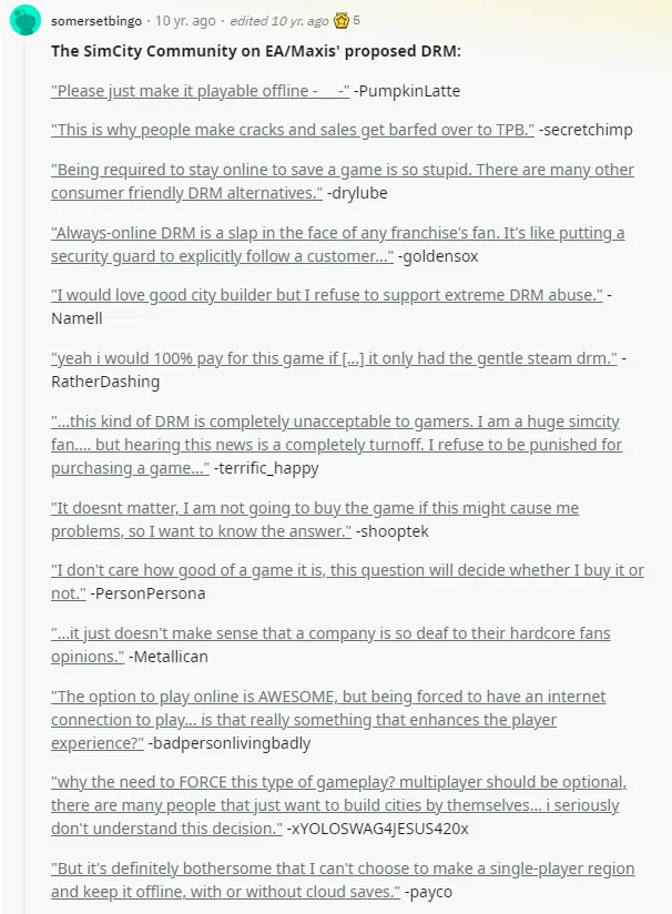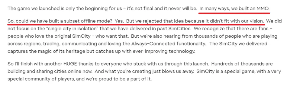 EA必要对此负责,但必要负责的不应该只有EA。 3月6日(北京时间3月7日),由芬兰工作室Colossal Order开辟的都会制作游戏续作《都会:天际线2》(Cities:Skylines 2)正式公布,预计将在2023年内发售。 不知是偶合照旧致敬,十年前的3月6日,恰好是《模仿都会》(Sim City)系列末了一部正统作品《模仿都会5》在欧洲发售的日子。 《模仿都会》由Maxis工作室所开辟,自1989年推出首部作品,开创了都会建立这一游戏范例。绝不浮夸地说,它是《都会:天际线》的祖师爷。 2016年,《都会:天际线》首席开辟职员卡罗琳娜·科尔波(Karoliina Korppoo)曾在外媒Pc Invasion的采访中表现,《都会:天际线》正是为了致敬《模仿都会》而生,确切地说,是旧版本的《模仿都会》。 “如果Maxis制作了更多雷同于传统《模仿都会》的新游戏,我们大概就根本不会制作《都会:天际线》”。 但汗青没有如果。《模仿都会2013》迎来了大张旗鼓的失败,害得整个系列宣告殒命。之后,Maxis总部彻底关闭,系列主创纷纷出走,玩家们无不把《模仿都会》和Maxis的死因,归咎于游戏发行商——EA,玩家们耳熟能详的“工作室杀手”。 1 2009年,Maxis和《模仿都会》系列的首创人之一威尔·赖特(Will Wright)脱离了工作室。他临走前给工作室留下的末了一部游戏,是劳绩广泛好评的《孢子》。 同年,Maxis推出了《模仿人生3》,在第一周就卖出了140万份,被EA评为“迄今为止最乐成的PC游戏”。 这两部作品的光辉结果,使得Maxis的员工们得到了富足的空闲,可以去忙一些不太急的项目。此中一位是欧尚·奎格利(Ocean Quigley),在Maxis谨小慎微工作14年,除了最早的那一部,他到场了险些每一代《模仿都会》的开辟工作。 上一部正传作品《模仿都会4》已经是2003年的事变了,其2D视觉效果早就无法和数年后的3A大作相提并论。受到已经3D化的《模仿人生》系列的启发,奎格利等人盼望给《模仿都会》也打造一款3D化的新引擎,厥后被称作“玻璃盒”(GlassBox)。 EA立即决定投入款子和时间本钱,将这个新引擎直接转化为《模仿都会》新作。奎格利很快就任这部作品的创意总监,Maxis的其他员工也被变更起来。 新《模仿都会》的总筹划师是斯通·利布兰德(Stone Librande)。他有满腹的雄心勃勃,等待新引擎和新游戏去实现。据他在2023年PCGamer采访中的回想,他曾盼望新的引擎可以大概“更灵敏地可视化都会住民的互动”,“对个人、汽车和企业的活动举行建模,以更有机、更真实的方式复制都会生存”。 当时利布兰德的办公桌上也贴着如许的标语:都会是人,而不是修建物。“你不应把一座都会想象成是修建物和街道的聚集。你该想象人类在都会的体系中移动,从一个地方到另一个地方。” EA的高管们难过没有在游戏开辟过程中参加,仅仅提出了一个要求:新《模仿都会》,必须是一部实时在线的多人游戏。 游戏发售前,Maxis团队成员根本都乐于继承这个要求。2010年前后,多人联机游戏属于局面所趋,市面上的大部门游戏,都筹划了多人联机模式,大概干脆做成纯联机游戏。将《模仿都会》投入盛行海潮,实在也是一个比力现实的筹划。 别的,利布兰德也有本身的私心:他有两个儿子,盼望和他们一起玩到最新的《模仿都会》。 2 多人游戏成了《模仿都会》新作的开辟焦点,整部游戏都牢牢围绕这个焦点构建起来。 理论上,新《模仿都会》支持4-10名玩家在同一片地区里管理各自的都会,都会之间互通有无,互换物产和电力,共享公共办法、教诲资源、污染和罪犯。 为了做出玩家和都会之间的资源差异,新作的都碰面积缩小到了前作的四分之一,都会运营稍有转机,就会受到面积和资源上的发展限定,逼迫玩家互助。难听逆耳点说,《模仿都会》酿成了《模仿墟落》。 作为多人游戏,新《模仿都会》还需维持稳固的互联网毗连。都会制作实时举行,没有筹划打消功能,也不答应回档,只有云端单一存档可用。联合都会空间狭窄的特性,一旦改错地形、盖错修建,玩家就与完满的都会规划无缘,没有悔恨药吃。 2012年3月,EA官宣《模仿都会》新作,明确该作必要连续联网。但在两个月后,暴雪的《暗黑粉碎神3》发售了,同样必要全程联网,海量玩家涌入服务器,却没几个人进得去游戏。随着暴雪增设服务器,且玩家数量趋于稳固,题目才得到办理。 自那以后,社区的质疑声音从未克制。多数玩家认定,EA忽然为一个单机系列强推全程联网和多人互助,只是在变相应用一种数字版权管理的计谋(DRM);简言之,反盗版本领。 据利布兰德证实,全程联网简直是一种DRM。“此中一种方法是将大量数据生存在服务器上,如许就没有什么可以真正破解的东西了。即便你破解了本身的游戏,照旧必须得到服务器的验证。” 同年12月,Maxis的新《模仿都会》开辟团队在Reddit上发帖向玩家问好。可他们收到的大部门复兴,都是针对游戏欺凌玩家联网的抗议。某位爱抖机灵的网友将81条复兴里的反对意见汇总到了1条复兴里,迄今为止,该复兴收到了凌驾7300次点赞。 EA不得不在自家官网发篇博客辩护。博客声称,新引擎“玻璃盒”可以大概“跟踪每个都会内多达10万名模仿市民的数据”。这个过程必要大量盘算,而“玻璃盒”的工作原理,就是将部门盘算分配给EA的云端服务器,因此游戏必须联网。这篇博客的署名,是Maxis总司理露西·布拉德肖(Lucy Bradshaw)。 接下来的日子里,Maxis我行我素,开展了反复小规模