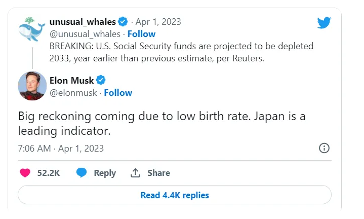 财联社4月3日讯(编辑 卞纯)特斯拉CEO、现在的天下第二豪富豪埃隆·马斯克不停以来为环球生齿标题操碎了心,日前他又发出了最新告诫,这一次被“催生”的是美国。 马斯克上周五在推特上表现,美国将尝到出生率降落的苦果,而日本就是前车可鉴。“由于低出生率,大整理即将到来。日本是一个领先指标。” 马斯克此番言论是在回应一篇关于美国社会保障基金预计将于2033年耗尽的报道。该报道称,美国社会保障体系的中央信托基金储备,将在2033年耗尽,比预期提前一年,而国家医疗保险操持的财务状态仅略有改善。 根据美国疾控中央(CDC)部属机构国家卫生统计中央(NCHS)的数据,2021年美国约有370万名婴儿出生,较2020年多出约4.6万名,但只管云云,2021年的新生儿仍低于2019年的程度。 自2014年以来,美国的新生儿数量均匀每年降落2%,此中2019年至2020年期间的降幅是这一数字的两倍。 日本是前车可鉴 已往几年,马斯克反复就环球生齿危急发出告诫,并多次将日本作为范例。 本年3月,马斯克在一条推文中写道:“客岁日本殒命人数是出生人数的两倍。生齿自由落体。”他进一步告诫称,“天下其他地方有效仿的趋势。” 客岁5月,他发推称:“除非出现变革导致出生率高出殒命率,否则日本终极会不复存在。 上个月,日本宰衡表现,由于出生率急剧降落,该国正处于无法正常运转的边沿。据媒体报道,2021年,日本的登记生齿为1.255亿。 出生率淘汰将带来一系列社会标题,如劳动力规模淘汰以及养老金缺口加大。日本就是一个光显的例子。 为了办理少子高龄化造成的劳动力不敷,并淘汰社会保障费的付出,日本当局客岁已经把老年人最晚领取养老金的起始年事从原来的70岁调高到了75岁。日本领取养老金的起始年事原则上是65岁,但也可以按照本人意愿提前或推后。假如选择提前领取,每月发放金额就会淘汰,反之则增长。 据日本瑞可利职业研究所上周发布的一份推测,到2040年,日本劳动力供应缺口预计将高出1100万人。这一推测凸显出,随着生齿快速老龄化,日本经济所面对的寻衅加大。 (财联社 卞纯) |