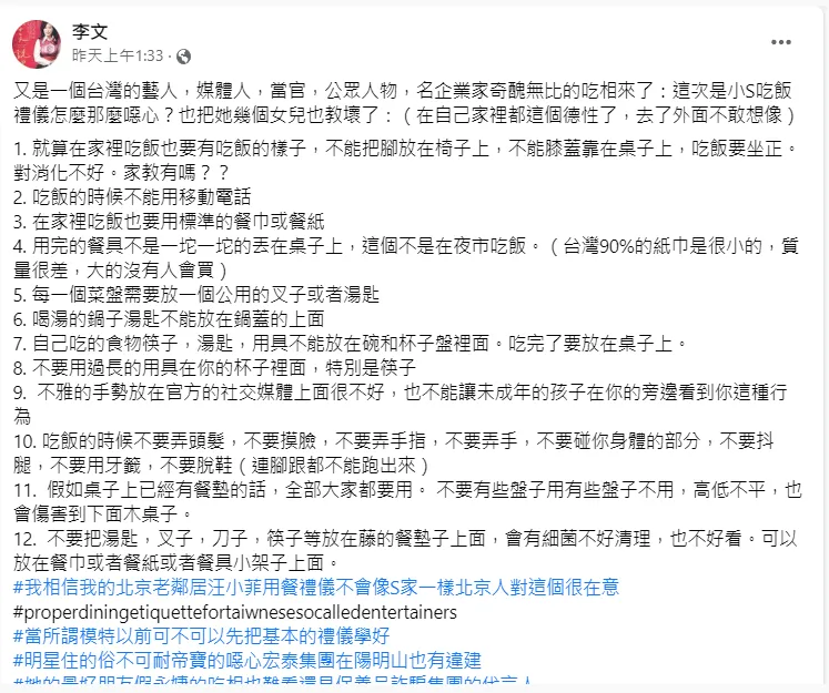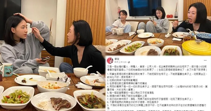 台湾省女星小S经常在网络上分享女儿的生存照,母女互动有爱让网友们争相点赞。克日,她又在个人交际账号晒本身和女儿们在家用餐的照片,却惹来做节李敖女儿李文发文狠批,整整列出12条用餐礼仪引网友热议。 李文狠批小S,称其作为一个艺人、媒体人、公众人物,用饭也太“恶心了”,把几个女儿都教坏了,在家都如许,去了表面不敢想象。 她还列出12条罪状,起首不能把脚放在椅子上、然后用饭时间不要打电话、用完的餐具不要一坨一坨丢在桌子上等等。 通过小S晒出的照片可以看出,李文列出的“罪状”并非无中生有,小S和女儿用饭时简直非常恣意,她和女儿的腿都放在凳子上,大女儿还椅坐在凳子上玩手机,她本身则伸开大口享受美食,整个人靠在餐桌边。 席间小S和女儿交换着什么摸对方脸,餐桌上的餐具摆放紊乱,用过的卫生纸和汤匙碗筷堆在一起,食品残渣散布在桌子和碟子中。 不外通过照片也能看出小S和女儿们的感情非常要好,相处更像姐妹不像母女。 对此,有部门网友以为李文提出的观点是在找茬,留言称:“吃个饭那么累,又不是在餐厅吃给你看”,更有人表现:“干涉别人家事更没修养”。 究竟上这并非小S女儿修养题目第一次引争议。 此前小S晒出姐夫具俊晔在家做饭的视频时,就不测曝光她女儿在家用餐时蹲坐在椅子上,而且还在滑手机。 效果被吐槽“没修养”。 小S和大S都是华冈艺校毕业的门生,十几岁便入行做艺人,两姐妹一个走优雅蹊径,一个走谐星蹊径。 2004年小S主持《康熙来了》,由于大胆旷达的提问促成搞笑的节目效果,令其一炮而红,至今都是不少民气目中最佳娱乐女主持。 不造作超接地气是她的名牌,但同时也为她招致了不少争议。 为了节目效果,她曾在节目上吃女星的脚丫子、和男星贴身互动吃豆腐等等。 固然让不少人感到不适,也有大部门观众以为只是为了“节目效果”而已,没须要这么认真。 小S的几个女儿如今都进军娱乐圈,在镜头前几个女儿表现得都相称淑女,特殊是二女儿被以为是翻版林志玲,举动举止温柔大方。 大概这只是小S和几个女儿的相处方式,由于放松以是毫无顾忌。 那么对此各人又有何见解呢?欢迎在批评区留言讨论。 #小S#、#小S女儿引争议#、#小S没修养# 作者:天天都想吃榴莲 责编:天天都想吃榴莲 本文由盖饭娱乐原创,欢迎关注,带你一起长知识! |