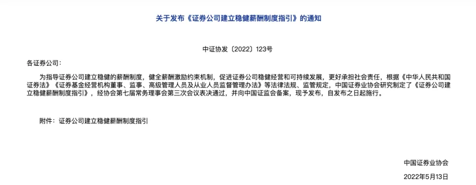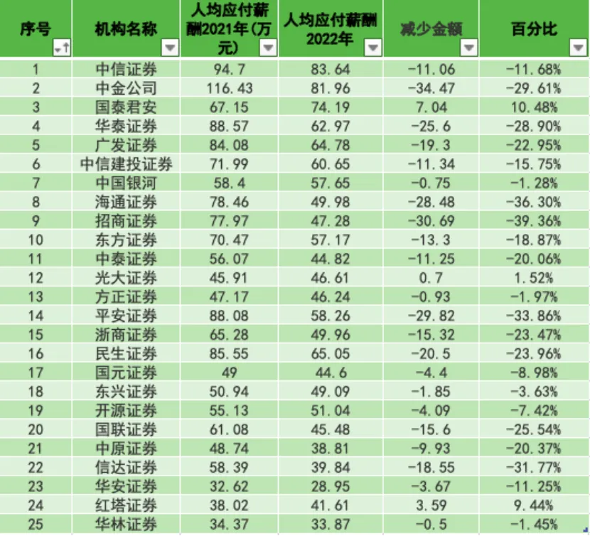 克制4月5日,已有25家上市券商披露2022年年报。红星资源局注意到,随着年报的披露,券商员工的薪酬变革再次成为市场焦点。 “高薪”不绝是证券行业的代名词。但从客岁中开始,“券商降薪”的消息不停传出,如本年报出炉,“券商降薪”似乎已成了行业趋势。 红星资源局统计发现,有22家券商均有差异水平的降薪,降薪券商数目占比高达88%,有6家券贩子均降薪金额凌驾20万元,招商证券员工人均薪酬镌汰近4成。 不外,此轮“降薪潮”中,券商高管的薪酬降幅更为显着。 券商麋集交出年度“结果单”,8成券商员工薪酬降落 从已公布年报的25家上市券商数据来看,有13家券商2022年业务收入超百亿元,占比超五成。 此中,中信证券暂居榜首,营收为651.09亿元;国泰君安、中国银河元、华泰证券分别位列二、三、四名,均超300亿;中信建投、中金公司、海通证券、广发证券紧随厥后,2022年营收超250亿元。 克制现在,2022年净利润凌驾百亿元的券商有3家,中信证券、国泰君安和华泰证券,分别为213.17亿元、115.07亿元和110.53亿元。 除了已往一年的“结果单”,备受市场关注的另有券商员工的薪酬变革。 “高薪”不绝是证券行业的代名词,反复引发社会热议,但从客岁中开始,“券商降薪”的消息不停传出。红星资源局注意到,随着2022年年报的披露,“券商降薪”似乎已成了行业趋势, 红星资源局统计发现,对比2021年,只有3家券商涨薪,别的22家券商均有差异水平的降薪,降薪券商数目占比高达88%。 可以看出,降薪是券商行业的大趋势。红星资源局注意到,从绝对金额来看,有6家券贩子均降薪金额凌驾20万元,如招商证券的人均薪酬从77.97万元降落至47.27万元、安全证券的人均薪酬从88.08万元降落到58.26万元、海通证券则从78.46万元降落到49.98万元等等。 而降薪金额在10-20万的有8家,如广发证券人均薪酬降落了19.3万、信达证券人均薪酬降落了18.33万、国联证券人均薪酬降落了15.6万等等。降薪金额10万以内的也有8家,如中原证券、国元证券等。 从比例来看,有12家券商降薪比例凌驾20%。此中招商证券人均薪酬降幅近4成,为现在披露中降幅最高;海通证券、安全证券、信达证券降薪比例也到达39.37%、36.30%、33.86%和31.77%。 不外也有券商逆势涨薪,如国泰君安2022年员工人均薪酬为74.19万元,同比增长10.49%,涨幅最高。红塔证券和光大证券的员工人均薪酬也均有涨幅,分别同比上涨9.4%、1.52%。 降薪先降高管,有高管年薪少了500万 在降薪的大趋势下,红星资源局发现,券商高管的薪酬降幅更为显着。 如东兴证券,2022年高管年度薪酬总额为1435.38万元,2021年为3702.81万元,同比镌汰61.24%,也是披露数据中降幅最大的券商。 别的,中金公司的高管也出现了大幅降薪的情况。2022年董监高年度薪酬总额为4126.20万元,2021年为9441.6万元,缩水超一半,同比下滑56.30%。红星资源局注意到,紧随厥后的是海通证券,其高管年度薪酬总额降落了41.84%。 被称为“券商一哥”的中信证券,其高管薪酬总额从2021年的1.66亿元,镌汰至2022年的1.04亿元,同比镌汰37.51%。比方,中信证券总司理杨明辉与投资银行管理委员会主任马尧2022年薪酬分别为469.35万元和596.16万元,较2021年分别降落了529.33万元和566.47万元。 另有华泰证券、方正证券、中国银河、中信建投证券、中泰证券、高管年度薪酬总额也在降落,分别镌汰20.09%、26.32%、27.00%、34.74%、38.22%。 有业内人士表现,券商行业此轮“降薪潮”,高管降薪显着,下层员工变革幅度较小,今后,券商高管“年薪千万”的征象已不复存在,薪酬在500万元以上的高管数目也会镌汰。 对于降薪一事,3月30日,中信证券董事长张佑君在公司业绩分析会上表现,公司的薪酬以及鼓励严酷按照公司管理布局的相干规定,由董事会、薪酬委员会、职工代表大会共同研究订定薪酬体系,也会思量按照主管机构的薪酬指引和引导意见来设定薪酬管理办法。 券商限薪早已靴子落地,业内人:符合行业趋势,利于长期服务 红星资源局注意到,比年来,证券行业的薪酬话题曾反复引发社会热议。 2022年1月,中泰证券被曝出其非银首席分析师在小红书上晒出税前224万年薪、申报税额62万的截图,只管当事人随后否认了此事,但仍然将中泰证券推向舆论的风口浪尖。 紧接着1月13日,网上传播出一份来自某券商的内部文件《固定收益融资部员工社会举动准则(试行版)》,对其员工在多方面提出要求,要克制炫富等举动给公司及行业带来负面影响。此中包罗:“不答应开豪华车(100万以上)、戴高档手表(15万以上)、利用高档包(5万以上),以及其他不适时宜、奢华定制的物品。” 上述事故引发了社会对证券行业高薪酬的关注,武汉科技大学金融证券研究所所长董登新曾担当红星资源局的采访时表现,假如整个券商行业薪酬高得离谱,羁系层大概会对券商接纳限薪步伐。 2022年5月,券商限薪靴子落地。5月13日,中国证券业协会发布《证券公司创建妥当薪酬制度指引》(以下简称《指引》),对券商内部薪酬制度做出了详细规范。 中证协指出,该指引是为引导证券公司创建妥当的薪酬制度,健全薪酬鼓励束缚机制,促进证券公司妥当谋划和可连续发展,更好负担社会责任。 “削峰填谷”,一位不乐意透露姓名的某头部券商首席分析师对上述的调解形容到。他提到,从前券贩子的工资是十年不开张,开张吃十年,颠簸很大,如今调解后,会导致研究所和投