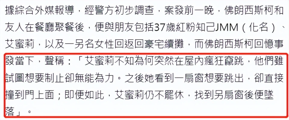 根据港台媒体报道,近来阿根廷当地发生了一起网红模特坠楼身亡案件,由于疑点重重引发关注,特别是相识了案件细节之后,很容易就让人遐想到2017年发生在本地娱乐圈的女星任娇坠楼案。 26岁的艾米莉(Emily Rodrigues )是一位网红模特,原来是巴西人,到阿根廷发展多年,拥有不少粉丝,2023年3月尾,她被发现从一豪宅高处坠下,当场身亡,去世时间和任娇是同样的状态,身上的衣服都不见了。 颠末警方观察,豪宅全部者富商Francisco成为了猜疑对象,于2023年4月遭到逮捕,被控告涉嫌行刺,根据富商邻人和眼见证人的报告,富商自己就很喜欢在家开派对,险些每天都有,艾米莉在坠楼前一夜就是去豪宅到场派对的,来了一场彻夜狂欢。 结果就在隔天一早,就有眼见者看到艾米莉心乱如麻从大楼坠下,直接摔落到了地面,当场没了声气,邻人也声称,听到了艾米莉发出挣扎的声音,之前还听过一个女生在痛楚嚎叫。 根据证词和现场状态,提供派对场所的富商成为了犯罪怀疑人,但他辩解称是艾米莉自己忽然失控,不知道为什么在屋里疯狂蹦跳,他们试图制止但无能为力,中途艾米莉频频跳窗,还撞到了门上面,终极照旧找到了一扇窗户爬了出去,接着就坠楼身亡了。 和艾米莉偕行的女性挚友也和富商保持了同样的说辞,声称艾米莉精神瓦解了,但是警方从这位挚友身上查抄到了擦伤,猜疑他们与艾米莉有过屠杀,为此正在征询专家意见。 除此之外,警方还查抄了艾米莉坠亡的豪宅,发现了许多酒瓶,暂时还没有检测出非法药物,但有一点很希奇,那就是豪宅全部房间的床都有使用陈迹…… 如今整个坠楼案件已经已往近一周时间了,阿根廷警方仍然没有公布更多渴望。 ——艾米莉为什么会忽然精神瓦解?艾米莉挚友身上的伤到底是怎样造成的?艾米莉体内酒精含量怎样?艾米莉是否涉嫌吸D? 这些显着颠末简朴查验就能得到解答的标题,却不停没有反馈。 别的,另有一个最关键的疑点,那就是艾米莉的衣服为什么失落了,富商本人和挚友都没有提及这一点,他们还眼见着艾米莉跳楼,两个人都拉不住一个26岁的女模特? 遐想到任娇案,当初之以是引发争议,也是由于当晚与她一起聚会集会的男星杨旭文的反应让人很难明白——他没能及时发现任娇坠楼的来由竟然是喝多了,睡得特别沉。 固然,艾米莉大概确实和任娇一样,都是不测坠楼身亡的,并不涉及行刺,只是一想到她们去世之前,显着有被拯救的机遇,就照旧以为非常遗憾。 末了,也照旧渴望各人得当饮酒,这里也不是求全谴责受害者的意思,但是艾米莉和任娇二人坠楼前都有过喝酒的运动,不清除饮酒过量的大概——任娇案已经已往5年多时间了,也渴望艾米莉案能尽快查明本相,给她的家人亲朋一个答案。 本文未经授权严禁转载违者必究! |