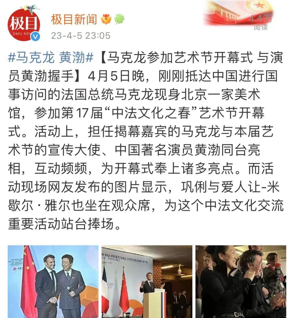 4月5日(周三),法国总统马克龙抵达北京,正式开启为期三天的访问。 闻名演员巩俐及其丈夫让·米歇尔·雅尔也出现在马克龙的随行代表团中,夫妻俩从总统的专机机舱内走出时,网友一片沸腾。 此前,就有消息指米歇尔会与马克龙一同访华,但各人并不确定巩俐会否现身。 据巩俐的老实粉丝透露,马克龙约请的着实是“巩皇”,米歇尔老师只是“妇唱夫随”。 究竟上,74岁的米歇尔在前年6月得到法国荣誉军团勋章最高等骑士勋位,他是法国“国宝级”音乐各人,是受邀随行访华的20多位法国文化界重磅人物之一。 巩俐夫妇下飞机时,外媒拍到了二人的高清照片,57岁的巩俐履历了长途飞行,脸上没有一丝疲惫感,漂亮得令人倾慕。 巩俐与丈夫不时攀谈,他们四目交投,眼里满满都是爱,完婚四年,照旧像初恋一样甜蜜。 另有网友发现,米歇尔对妻子体贴入微,完全不消巩俐拿行李,自己双手提着两个大箱子,步履妥当,没有老态。 期待期间,众人围在一起攀谈,米歇尔与马克龙对视,巩俐则仔细凝听。 马克龙的行程非常紧凑,抵达北京当天,就带着团队出席第十七届“中法文化之春”艺术节开幕式。 开幕式上,马克龙发言,巩俐夫妇低调坐在台下支持。 不少受邀高朋在现场发现“巩皇”夫妇,都不由得将镜头对准她跟米歇尔。 巩俐夫妇看得投入,一时暴露严厉心情,一时开怀大笑,被马克龙跟黄渤逗乐了。 这是不是夫妻相?二人不谋而合笑出了双下巴,哈哈! 比及艺术节宣传大使黄渤公布“中法文化之春”正式开幕,现场高朋纷纷找巩俐合影,米歇尔老师坐在妻子旁边,成了活的背景板。 不盛意思,米歇尔老师,在中国,照旧“巩皇”比力受接待!! 这次的开幕式除了巩俐夫妇之外,负责在台上与马克龙互动的演员黄渤,也是亮点之一。 看图就知道,黄渤的体现有多可爱。 黄渤端庄往台中心一站,正式公布第十七届“中法文化之春”艺术节开幕,说完平凡话就要说法语,他只说了一个单词就不由得偷瞄暗藏在手掌心的“法语秘笈”,乐成逗笑现场高朋。 就连马克龙也高兴了,笑着走到黄渤身边,跟他握手,两人天然攀谈起来。 原来,黄渤说的是“C'est parti”,在法语内里是“开始”“出发”之意,马克龙听完黄渤的话,自己重复了一遍,说出了精确发音。 最可笑的是,马克龙着实太热情,双手握着黄渤的手不放,二人“过招”再次让观众乐开怀。 关于巩俐夫妇随马克龙访华,除了感叹“巩皇”太有排面之外,也引来了部门网友争议。 这些网友将焦点放在了巩俐的国籍上,吐槽她是新加坡人。 跟随巩俐多年的粉丝找了很多资料,力证“巩皇”爱国。 比方,她多次在访问中夸大自己是中国人,是一名中国演员。 别的,巩俐第一任丈夫黄和祥告诉记者,巩俐其时更换国籍是为了方便出国,为影戏在环球奔忙,他更大赞巩俐有一颗爱国心。 正如杨澜所说,无论巩俐持有什么护照,她和中国影戏血缘上的接洽无法割舍,她曾经是也仍然是中国影戏的自满。 |