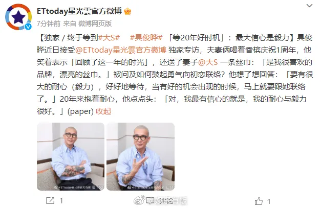 大S上个月迎来完婚一周年吊唁日,具俊晔终于硬了起来,称将会在台湾守卫大S一辈子,不惧飞短流长。 4月1日,“前夫哥”汪小菲正式抵台,在网络上重拳出击的他,现实中没有和大S撕破脸皮,当天被狗仔拍到与大S妈妈及后代见面,过大S家门不入,懒理网友拱火。 固然,汪小菲此次抵台没有直面具俊晔和大S,却讨得到大S妈妈很开心,指他们照旧一家人,S妈还替汪小菲讨情,让台媒别再缠着前半子,态度发生一百八十度变化。 4月6日,正直半子具俊晔高调出门担当台媒采访,并宣誓主权。 具俊晔大方透露与大S怎样相处细节,指本身可以或许接下医美代言满是大S的功劳,大S除给他信心之外,天天晚上都会帮他涂许多东西,以是皮肤变得很好,他本人寻常也勤于保养。 采访中,具俊晔交代与大S怎样度过一周年吊唁日,两人喝了香槟共度韶光,他送了大S一条美丽的丝巾,公开当初怎样向大S表明底细:“要有很大的耐烦,好好地期待,当有好的时机出现时,立刻就要跟她联结了。” 20年来,具俊晔都抱着耐烦:“对,我最有信心的就是,我的耐烦与毅力很好。” 具俊晔这些似乎话里有话,反正与这几天的消息对上号了。 4月4日,S妈曾透露大S和汪小菲息争的最大停滞,那便是大S已再婚,很难让汪小菲息争。她劝汪小菲息争,对方只回应“再说”。 另一边厢,大S妈妈也劝女儿息争,以致体现不如把状师费给她,让她去和汪小菲沟通,但大S根本不鸟妈妈。 由于这一番话,大S妈妈又遭到网友讽刺贪钱。 不外,无论外界怎样说,具俊晔和大S都没有动摇,他如今不但劳绩爱情,奇迹也迎来第二春,公布接下来会推出音乐和艺术方面的作品回馈粉丝。 |