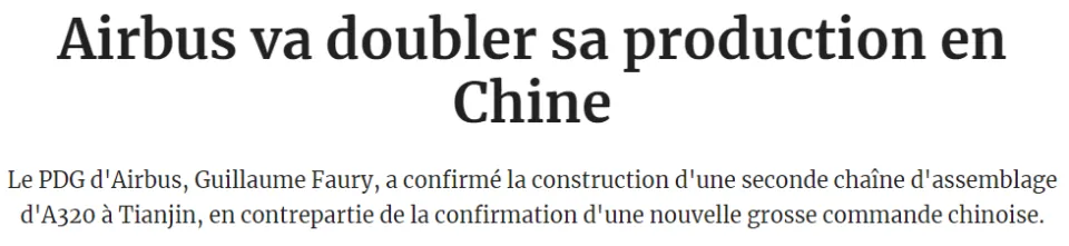 法国《回声报》4月6日消息,根据空客CEO纪尧姆·福里陪同法国总统马克龙访华期间告竣的协议,空客将向中国航空东西团体有限公司提供160架单通道窄体飞机。别的,南华早报记者Finbarr Bermingham在推特发文称,空客将向中国航材提供160架飞机。 纪尧姆·福里别的表现,空客将在天津开设第二条总装线,使在华A320产能进步一倍。据《回声报》报道,天津将成为空客A320系列的第二大生产基地,仅次于拥有4条装配线的德国汉堡,与法国图卢兹和美国莫比尔相当。 |