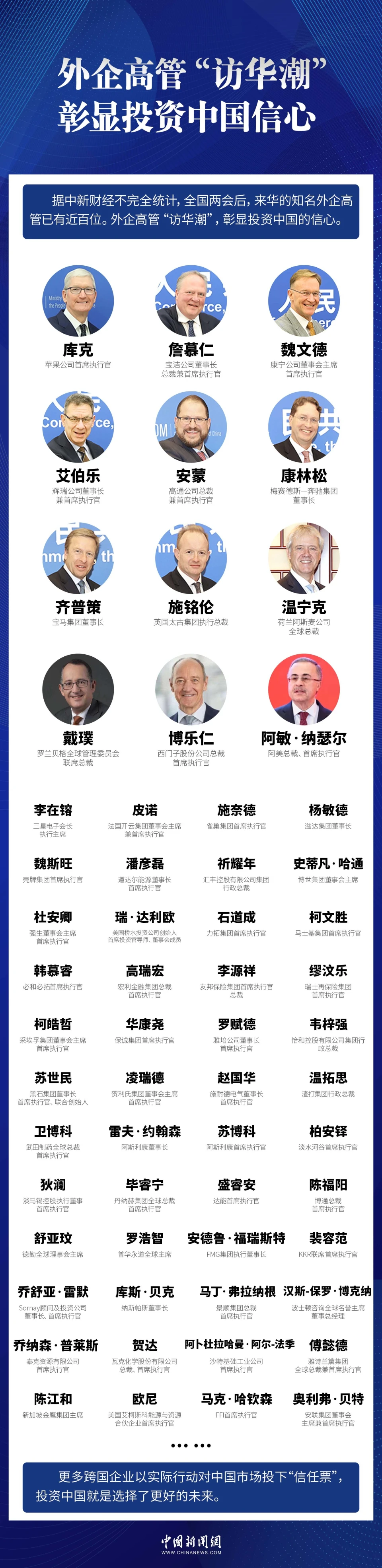 中新网北京4月7日电 (记者 李金磊)时下,外企高管正掀起“访华潮”。据中新财经不完全统计,天下两会后,来华的着名外企高管已有近百位。 从中国发展高层论坛到博鳌亚洲论坛,再到风起云涌举行的“投资中国年”,纷至沓来的外企高管们紧锣密鼓参会、观察、受访,谈相助、走市场,以现实办法看好中国、加码中国。 外企高管掀起“访华潮” 春意盎然的中国,正吸引更多来宾。浩繁跨国企业高管麋集来到中国,而这一名单还在不绝拉长。 从北京垂纶台国宾馆到海南博鳌,由北及南,外企高管们奔走在中华大地上,生动在各大经贸论坛、工厂园区。在这个春天里来中国,已然成为一股潮水。 “有朋自远方来,不亦乐乎?”中国的部长、省委书记、省长们很忙,忙着访问这些外企高管。 国家发改委、商务部、工信部、中国银保监会、国家市场监视管理总局、国务院国资委等部门近期披露了重要负责人访问外企高管的消息。此中,在3月23日至3月28日6天内,商务部部长王文涛至少访问了12位跨国企业高管,包罗苹果公司首席实行官库克,宝洁公司董事长、总裁兼首席实行官詹慕仁,高通公司总裁兼首席实行官安蒙,荷兰阿斯麦公司环球总裁温宁克,等等。 再来看地方,北京市委书记尹力近期访问了美国强生公司董事长兼首席实行官杜安卿、新加坡淡马锡首席实行官狄澜、法国施耐德电气团体董事长兼首席实行官赵国华等外企高管。北京市市长殷勇访问了德国宝马团体董事长齐普策和宝洁公司董事长、总裁兼首席实行官詹慕仁等外企高管。 海南省委书记冯飞近期访问了沙特根本工业公司首席实行官阿卜杜拉哈曼阿尔-法季、雅诗兰黛团体环球总裁兼首席实行官傅懿德、丰田汽车(中国)投资有限公司董事长上田达郎、英国阿斯利康董事长雷夫约翰森等外企高管。 “中国是令人奋发的投资热土” “中国市场对我们来说很告急”“中国市场蕴含巨大发展机会”……再次来到中国的外企高管们,纷纷表达了对投资中国的器重和信心。 安利环球首席实行官潘睦邻体现:“中国是令人奋发的投资热土,也是环球经济摆脱低迷的强劲引擎。” “新的、高质量的发展机遇让我们感到奋发。”英国太古团体实行总裁施铭伦体现,中国的今世化意味着中国人民对精美生存不绝增长的向往,这为可以或许提供更高质量产物与服务的跨国企业提供了巨大的发展空间,也是太古对峙恒久投资中国的信心所在。 安联团体董事会主席兼首席实行官奥利弗贝特体现,安联团体和浩繁国际企业积极拥抱中国对外开放所带来的巨大机会,在这个环球经济增长最为敏捷的市场实现一连发展。 梅赛德斯-疾驰团体股份公司董事会主席康林松说:“除了北京,我还会去上海、香港、杭州等都会。我们会继续全方位投资中国,中国的高质量发展和对外开放,为我们提供了难过的机会。” 浩繁跨国企业不但显现出深耕中国市场的信心,还以加码投资的现实办法对中国市场投下“信托票”。 阿斯利康在山东青岛投资新建工厂,总投资额约4.5亿美元。安利公布增投6亿元人民币对广州生产基地实行升级改造、创建促举行业间研发相助及效果转化的大康健共享平台…… 投资中国就是选择了更好的将来 “外国企业对投资中国依然有浓重的爱好。”《胡润百富》创刊人和首席研究员胡润此前担当中新社采访时体现,中国对它们来说是一个告急的市场。它们可以在这里增长代价,也可以作出贡献。 中国贸促会2022年底对160多家在华外资企业和外国商协会举行快速调研的效果体现,99.4%的受访外资企业对2023年中国经济发展远景更有信心,体现将继续在中国投资兴业,分享中国的发展红利。98.7%的受访外资企业体现将维持和扩大在华投资。 外资企业扩大对华投资恰逢其时。 当前中国经济显着企稳回升,各方面积极性正在不绝引发。数据体现,本年以来,中国经济企稳回升,1至2月份现实利用外资近400亿美元,继续保持增长势头,再次彰显中国对外商投资强大的“磁吸力”。 国际货币基金构造总裁格奥尔基耶娃克日指出,中国经济发展势头精良,本年对天下经济增长的贡献率预计将高出三分之一,将为其他国家提供告急机会。 “很多外资企业告诉我们中国这个市场不是可选项,而是必选项!”商务部部长王文涛体现,中国的市场是一个快速发展的市场,开放的市场,更是一个共享的市场。 2023年当局工作陈诉提出,更鼎力大肆度吸引和利用外资。国家发展改革委主任郑栅洁在中国发展高层论坛2023年年会上体现,与中国偕行就是与机会偕行,投资中国就是投资将来。(完) |