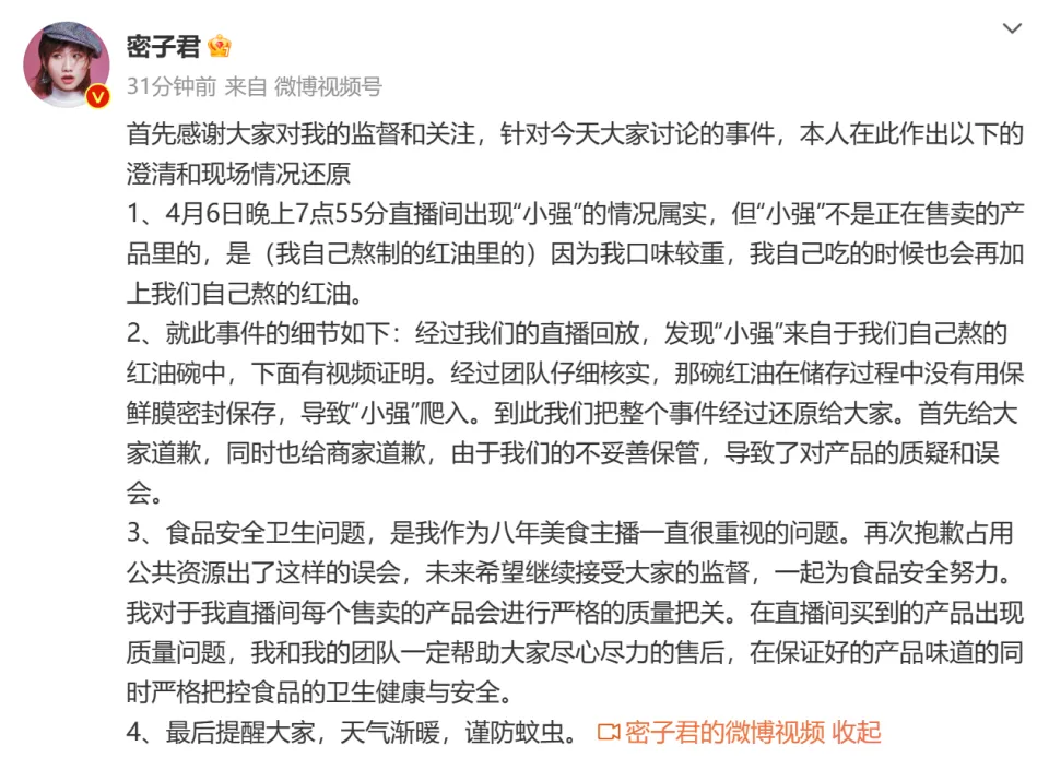 密子君发文致歉了! 4月7日,密子君针对直播中买的一款凤爪里出现“小强”一事举行了致歉。密子君一共回应了四点,并还原了现场颠末。 密子君称,当天晚上的直播出现“小强”一事属实,但并不是售卖的产物里带的,而是自己添加了自制的红油,内里带了小强。由于寻常自己口胃较重,吃的时间也会再加上自己熬的红油,但由于没有用保鲜膜密封生存,导致“小强”爬入,于是才出现了直播中的一幕。 密子君同时公布了干系直播画面,可以从视频中看出,其时密子君参加自己做的红油,小强就是这时到了凤爪里。 火线画面比力恶心,各人做盛情理预备———————— 视频末了干系检测陈诉也一并公布,力证产物自己没有任何题目。 对于这件事,密子君也向商家举行了致歉,体现由于他们的不当善保管,导致了对产物的质疑和误会。密子君称,食品安全卫生题目,是她作为八年美食主播不停很器重的题目。再次歉仄占用公共资源出了如许的误会,将来盼望继承担当各人的监视,一起为食品安全积极。 不得不说,密子君这份回应还是挺及时的。 起首她承认了“小强”属实,并没有强辩大概冷处理处罚,其次她还原了颠末,没有藏着掖着,再来她向大众和商家致歉,直言责任在自己。 不外网友对此的见解也差异,有网友以为密子君在强洗,效果这条批评已经被删除,也有网友体现明白,由于确实是红油里带的,乃至有网友以为密子君在避重就轻。 说密子君避重就轻的缘由,是她在直播过程中的做法。有弹幕不停提示她有“小强”之后,密子君选择了视而不见,乃至没有吃这一盘,而是跟各人讲这一盘只是样品,他们不会吃,接着就又新开了一包吃,因此网友对她的态度产生质疑,以为如果舆论没有发酵,她大概会继承装没事发生。 而对于密子君说红油是自己做的,网友也体现质疑,由于根据带货直播的内容,凤爪也会赠送辣椒油,以为密子君说法存疑。 也有网友以为,她倒的红油是从碗里出来的,应该是自己做的。 无论怎样,密子君此事还是阐明白她直播情况不佳,如果有一只“小强”出现,那阐明暗处已经有很多,不少网友发起密子君做好把关,注意后厨情况卫生,克制再次翻车。 着实提及来,直播带货确实有很多弊端和风险,密子君此事的发生不但是情况题目,尚有他们团队团体的管理,根本没有做好食品生存,才导致直播中出现如许一幕。 也盼望网红们在做直播时,除了认真倾销产物卖货,也多关注一下情况题目吧,一旦翻车很大概百口莫辩,被反噬的还是自身。 |
