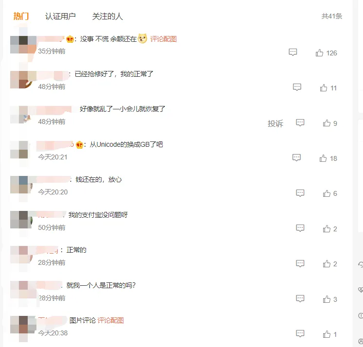 每经编辑:张锦河 4月7日晚间八点左右,不少网友反映其付出宝余额宝界面体现乱码。 据第一财经,对此付出宝客服职员对记者体现,已经发现这个题目,相干情况体系已经反馈给公司相干部分同事,现在正在修复中,不会影响用户资金安全和收益。详细何时修复好尚不确定,发起后续再登岸关注。据记者相识,上述乱码情况在部分付出宝用户中出现,未出现乱码用户仍可正常转账。 据钱江晚报微博21点10分发布,蚂蚁回应付出宝乱码:已根本规复。 对此,网友体现:“没事,不慌,余额还在”“已经抢修睦了,我的正常了”“似乎就乱了一小会儿就规复了”...... 余额宝是蚂蚁金服旗下的余额增值服务和活期资金管理服务产物,于2013年6月推出。天弘基金是余额宝的基金管理人。 逐日经济消息综合自第一财经、钱江晚报、公开资料 |