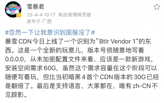 只管我们都知道暴雪CEO迈克·伊巴拉,对于上线新项目《奥德赛》这件事不停都挺心急的,但没想到的是,这项目提前在暴雪的CDN服务器摆设上了一个叫“Btlr Vendor 1”的东西,已经在琢磨给《奥德赛》上战网的事变了。 根据外服数据大神发掘出来的更新信息来看,现在暴雪CDN服务器内部已经上线了一个叫Btlr Vendor 1的文件,版本号为0.0.0.0,安装预留空间为60G。根据暴雪不停的风俗来看,这估计是要给新游《奥德赛》腾位置了,但让人无语的在这个游戏的语言与服务器支持选项中,我们无法找到zh-CN的踪迹,也就是说暴雪没有思量要在国服同步上线,与实装简体中文这件事。 与此同时,暴雪也急迫火燎地公布了魔兽10.1新版本将会在5月2日环球上线的事变,除了有新团队副本、新舆图之外,还上线一项震撼民气的新功能,即跨阵营公会。同盟,部落玩家可以自由选择差异阵营的公会到场。在到场跨阵营公会之后,同盟部落玩家就可以在公会频道自由谈天,也可以自由组队下本。而这一项冲动民气的改动,也不会同步到国服,究竟现在还没有公司来接办暴雪国服的新署理。 团结这两件事来看,我们不得不承认,暴雪在推进新项目与老游戏的新版本更新时,已经把国服给扫除在外,暴雪国服现在仅存在于暴白的抱负之中。顺带一提,在客岁还没爆出署理危急之前,暴雪在CDN上线暗黑4的时间,就没有zh-CN踪迹,以是这个《奥德赛》不加zh-CN的缘故也有大概是由于国服的版号申叨教题。 不知道面对现在的逆境,各人是会选择等国服上线,还是会选择去外服玩争先版本呢? |