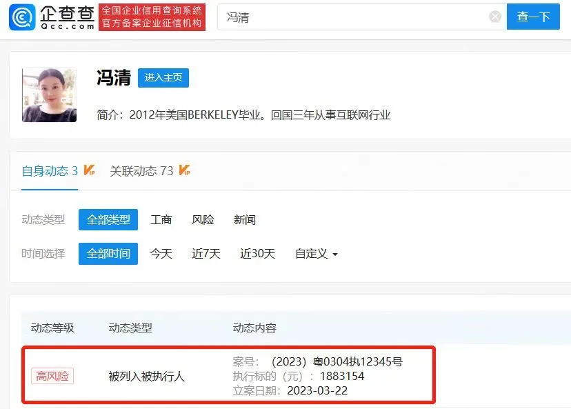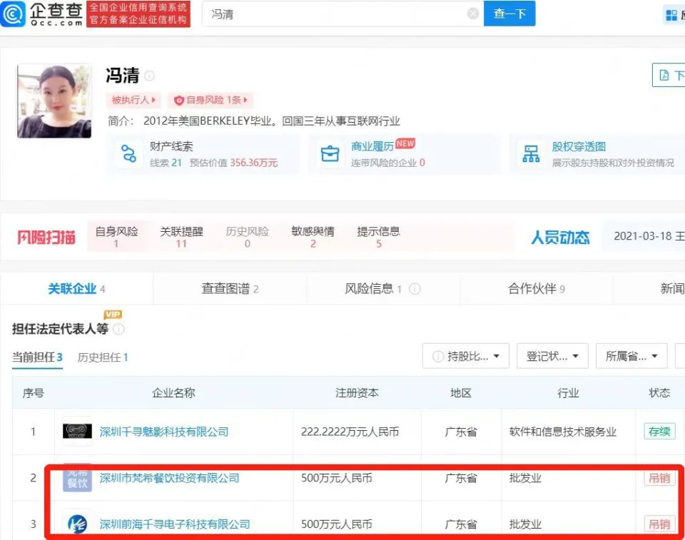 企查查APP表现,克日,深圳千寻魅影科技有限公司法定代表人冯清成被实行人,实行标的超188万元,实行法院为广东省深圳市福田区人民法院,备案日期为2023年3月22日。企查查信息表现,冯清如今关联有4家公司,除深圳千寻魅影科技有限公司为存续状态外,别的3家公司均被吊销。公开资料表现,冯清1987年出生于山东,曾获天下小姐中国区总决赛泳装单项赛亚军,而她另一个广为人知的身份则是明星王宝强现任女友。 |
