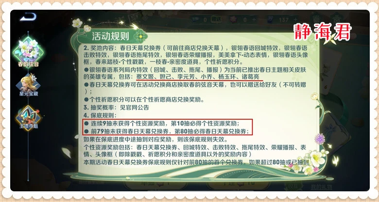 文/静海君 新一期的个性祈愿正式开启,保底4800点券可以抽出春日限定天幕,这个运动值不值加入呢?让我们来盘算一下。 春韵弦音个性祈愿的根本规则让我们来看一下这一期个性祈愿的根本规则。 ⑴底子规则 春韵弦音个性祈愿的玩法非常简朴,单抽必要一个许愿币,10连抽必要十个许愿币(许愿币一个是60点券)。 通过抽奖,玩家不光可以得到限定天幕、回城击败、拖尾、光彩播报、个性戳戳等局内道具,还能得到春日天幕祈愿积分,玩家可以用这个积分兑换很多有数道具(等会详细先容)。 ⑵详细的抽奖概率 通过抽奖玩家一共可以抽到10种嘉奖,它们的详细概率是: 抽中春日天幕兑换券→1%的概率。 抽中春语回城殊效→1.15%的概率。 抽中春语击败殊效→1.25%的概率。 抽中春语拖尾殊效→1.4%的概率。 抽中春语光彩播报→1.5%的概率。 抽中“美美拿下”动态心情→4%的概率。 抽中春语头像框→3%的概率。 抽中密切度道具→1%的概率。 抽中春来踏枝戳戳→23.5%的概率。 抽中个性祈愿积分6/15/30→62.2%的概率。 直接抽中关键道具的概率一共是9.3%,加上另有62.2%的概率抽到个性祈愿积分,这么一看还可以。 按照这个概率,假如抽100次,玩家不光可以得到全部的关键道具,还可以得到1057点个性祈愿积分以及一些不算告急的嘉奖(个性心情、个性戳戳等)。 对了,差点忘了,在抽到重复关键道具的时间,体系是会自动接纳并补发积分的,按照概率来看,最最少玩家可以得到120+300左右的积分,如许算起来就是1500左右的个性祈愿积分。 ⑶增补 对了,关于规则另有两个地方必要增补: 第一,本次抽到的全部局内道具均会由蔡文姬、妲己、李元芳、小乔、杨玉环和诸葛亮共享。 第二,一连9次未抽到关键道具的话,肯定会在第10次抽到;一连79次未抽到春日天幕的话,肯定会在第80次抽到天幕(两个保底)。 在相识完全部的规则后,我们再来看一下这一期的个性祈愿性价比怎样。 这一期的个性祈愿运动性价比怎样呢这一期个性祈愿运动的性价比怎样呢?让我们来对比一下。 ⑴兑换市肆 还是假设我们抽100次,就还会有1500点左右的祈愿积分可以用来兑换。1500点积分可以兑换什么呢?我们来看一下兑换市肆。 选择一:5个积分夺宝券(一个必要60积分)+返场的回城/拖尾。 选择二:挚爱童话天幕(1500积分)。 假如这么看的话就是6000点券可以抽到2个限定天幕+限定回城+限定击败+限定拖尾+限定光彩播报+头像框,这个值不值呢?让我们找个例子来对比一下。 韩信的这个国士无双礼包于3月30日上线,抽一次是20点券,225次可以保底得到专属回城+击败+拖尾。 对比一下,韩信的3个局内道具必要4500点券,而这次的6个好汉都可以使用的4个局内道具+2个限定天幕“才”必要6000点券,也就是说2个限定天幕才要1500点券,看其里确实不贵。 对了,大概有小同伴忘了之前个性天幕的抽奖环境了。在之前个性天幕抽一次是30点券,125次保底,玩家花3750点券可以确保得到一个传说风致的天幕。 固然了,不管是抽天幕,还是抽韩信的局内道具,都会同时得到很多性价比很高的道具(光彩积分、皮肤碎片等等)。 别的,玩家在购买许愿币的时间还肯定得到暴击结果,我测试了三个号,一个额外给了2个,一个额外给了1个,一个额外给了3个,均匀是送了2个,也就是120点券。 关键题目来了:花5880点券买7个个性道具究竟值不值呢? ⑵这个运动值不值呢 在说这一期的个性祈愿值不值之前,我觉着可以先看一下上一期的个性祈愿的嘉奖: 除了有各种局内道具外,上一期的个性祈愿中另有各个皮肤的个性行走动作。 也正是由于这个个性行走动作,我当时才发起各人可以加入一下抽奖。同春节期间的个性祈愿相比,这一期的个性祈愿嘉奖就差多了,以是我的发起是: 假如你确实喜欢各种花里胡哨的,喜欢拥有别人没有的道具,那么这一次的个性祈愿也还行(对比之前的各种抽奖)。 假如你就是喜欢玩游戏,那这个运动我不发起你加入,看都不要看。 以上就是本期的全部内容了,我是静海君,喜欢的小同伴记得点个赞哦,谢谢各人。 |