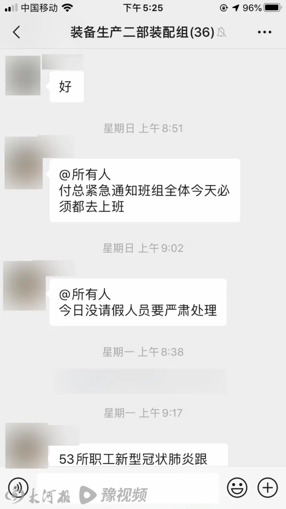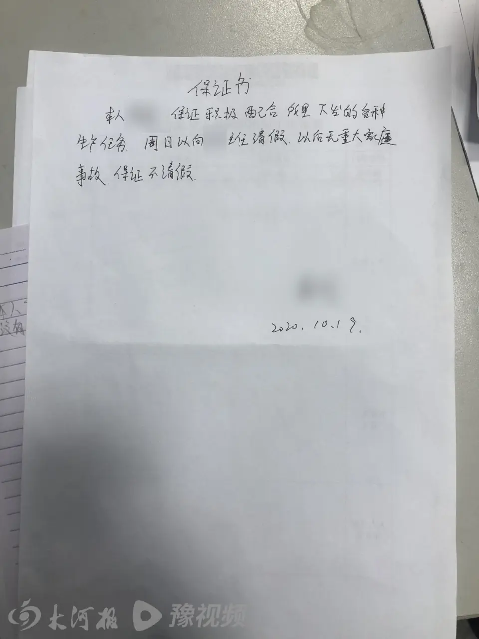 大河报·豫视频记者 刘永恒 4月7日,一名自称是中国电科光电研究院(以下简称研究院)职工的爆料人向大河报豫视频反映,研究院存在逼迫职工周末加班的征象,曾有职工被逼迫写下周末不告假的包管书。 这名爆料人向记者提供了4份上述包管书照片和1张微信群谈天记载截图,同时提供了自己在该研究院的工牌、工资条截图等工作证实。 截图表现,在一个名为“装备生产二部装配组”的谈天群中,一名成员称“付总告急关照班组全体本日必须都去上班”,及“本日没告假职员要严厉处置处罚”,事发日期为“星期日”。 4份包管书内容分别为“本人某某(因涉及隐私故隐去姓名,下同)包管积极共同所里下发的各种生产任务,周日以(已)向某主任告假,以后无重各人庭事故,包管不告假。” “本人某某包管积极完全共同所里安排的生产任务,会无条件共同领导安排的各项任务,周日已向某某主任告假已允许,以后无特殊庞大事故不会告假。” “本人某某包管积极完全共同所里安排的各项生产任务,无重各人庭事故,会无条件的(地)共同领导安排的各种生产工作,上周末确实已向某某主任报知家里环境,盼望在接下来的时间里没有庞大的题目,不会告假。” “本人在以后工作中共同工作,不请没有须要(的)假,无私奉献。” 包管书内容并未注明工作单元,此中两份包管书落款时间为2020年10月19日(周一),别的两份无落款时间。该名爆料人告诉记者,包管书与谈天记载中逼迫加班的关照,系发生同一时期内。 记者注意到,该爆料人自2021年起就多次向干系部门投诉上述题目。另据相识,其也向干系部门多次投诉过涉及该企业的其他事项。 据爆料人提供的一段发生在2023年3月31日,其与锦州劳动监察工作职员的通话灌音表现,锦州劳动监察就其反映的研究院逼迫职工周末加班题目,向研究院干系部门举行相识,研究院也已经递交了干系质料,并请爆料人近期前往劳动监察部门,填写投诉举报登记表,便于劳动监察部门举行存案。 记者于4月7日下战书、8日上午多次致电锦州劳动监察支队电话,均无人接听。 4月6日,微博认证为辽宁雄志能源公司舆情顾问的博主“锦州C老师”转发了上述爆料者发布在网络上的包管书照片和微信谈天记载截图,克制4月7日,已有数百条批评。 4月7日,大河报·豫视频《望见》记者就此事致电中国电科光电研究院,该院党委办公室一名工作职员回应称,会对此事举行核实。 该研究院工会的一名干系负责人在电话中向记者证实,爆料者确系研究院职工,曾多次来反映干涉题。 这名负责人回应称,该职工及上述微博博主在网络上发布的研究院欺压加班的信息不属实,只是截取了片断,“比如一个很长的句子,他截取了中心的一段话,那不就曲解了这句话的意义(意思)了。” 这名负责人向记者表现“我们这个加班是志愿的,不是我们欺压加班的”,并称4份包管书是个人志愿写下的,“都是志愿的。哪能逼迫,现在啥社会了,还欺压人写什么东西?” 对于爆料人提供的谈天记载截图的真伪,该负责人表现不能确定,“得核实”。 末了,该负责人称,正在核实上述环境,现在还没有处置处罚效果,“我们写包管书肯定都志愿的,肯定不能说是谁逼迫的,而且这个包管书是不是这个职工本人所写,现在有待核实,由于处置处罚效果还没有出来,以是现在我不能告诉你。” 7日晚间,记者注意到,干系博主发布的帖子已被删除。同日,大河报·豫视频《望见》记者向天津总工会问询此事,一名接线员称已记载干系环境并会反馈给干系部门处置处罚。 7日下战书,天津市人力资源和社会保障局热线工作职员告诉记者,暂未接到干系投诉,如上述爆料者单元存在欺压加班题目,可向劳动监察大队反映或申请劳动仲裁等。 (泉源:大河报·豫视频) |