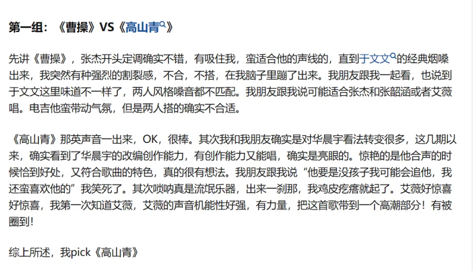 #声生不息宝岛季# 《声生不息宝岛季》第四期节目播出后就掀起不少网友热议,除了剪辑事故就是舞台歌曲的出现对比。这一期团体舞台出现丝绝不输给港乐季的舞美,歌曲选择也都有一半以上是耳熟能详的音乐。收视率上来看,仍然热度不减,成为即港乐季之后的又一档征象级别音综。 宝岛季的前三期收视率为:0.45%、0.51%、0.52%。 第四期的收视率为:0.52%,以如今的收视趋势来看,收视率只有大概上涨,不太大概下滑太多。 如今到第四期也是开始维持在0.52%这个程度,凌驾其他的卫视音综收视。而且这个收视还只统计了电视播放端,没有包罗网络播放软件端。 如许高的收视率也是由于该节目本身舞台舞美计划、歌手分组、歌曲选择、歌曲改编几个告急的因素而影响的。 第四期有如许三首歌曲舞台广泛受到网友们的喜好,在部门交际平台、视频平台点赞量和批评数都非常高。 第一个歌曲舞台是 :那英、华晨宇、艾薇 的《高山青》。 这个舞台视频还在短视频平台成为娱乐热榜。 三位的和声非常好听,那英的开场属于娓娓道来,随着艾薇、华晨宇的到场,歌曲满满递进,在副歌过渡到第二段主歌部门的间奏,唢呐到场听的人可以起一身的鸡皮疙瘩。 整首歌曲的改编生存了歌曲原有的旋律和大抵节奏,歌曲做了加法,高音、唢呐、和民族特色融为一体,让这首歌赢的很轻松。 三个人的声音非常和谐,华晨宇扮演了更多幕后和声,重要突出了飞行歌手艾薇的音色部门,让节目播出后许多观众喜好上了这位宝岛飞行歌手。 第二个舞台是:蔡旻佑的《我可以》 这首歌曲在短视频平台的点赞数和批评数高于其他歌曲许多,只能说许多人的芳华又返来了。 蔡旻佑选择的是钢琴启奏,悄悄的表达这首歌曲。 只管没有任何花音,以致舞台也非常简朴,但歌曲播出后,视频平台的批评数就可以证明这首歌曲各人有多爱了。 第三个舞台是:马嘉祺的《在水一方》 马嘉祺在节目预告阵容之前,是不被许多网友看好的。 一来他年事轻轻,二来又是偶像团体组合成员。于较为年长的观众群体来说,他只能是偶像,并不能成为气力歌手。 但在节目播出后,马嘉祺的《你的样子》受到不少乐评人的承认,这一期的《在水一方》再次褪去偶像的标签,成为了一个青涩但气力被低估的歌手。 他的音色清亮,很干净的嗓音,温柔的诉说《在水一方》,引得不少网友爱评。在节目中也能一个人独唱好一首具有年代感的音乐,比在《我们的歌》节目合唱体现更出色。是一位进步发展都很快的歌手。 这一期节目也出现一个和《舞娘》一样颇具争议的歌曲《曹操》。 之前在预告中看到于文文和张杰的剪辑片断,对这首歌曲等候非常高。于文文的乐器天赋加上张杰的高音肯定会把这首歌曲演绎的更有味道。 然节目播出后,网友们并不买单,有的网友评价两个人的音色不搭,尚有改编的旋律题目。 歌曲原来在分组是有陈立农的,于文文盼望能和张杰合唱,陈立农又被另一组挖走,使得歌曲终极演唱是张杰和于文文。 作为张杰和于文文的粉丝来说,是很爱这首歌曲的。但作为非粉丝的观众来说,《曹操》的改编舞台确实光炸但不好听。 网友们探究出来的缘故因由重要是两个人的音色不搭,但个人的听感则是旋律改编过大,歌曲变调,让先入为主的曹操变味了。 这首歌曲和《第一天》一样,原来两首歌曲就分别是林豪杰和孙燕姿的代表作之一。属于全民皆会唱皆听过的歌曲,旋律和节奏的改编幅度过大,使得歌曲有点焕然一新。 抛开歌曲听感不谈,光从视觉效果来说,这首歌曲看起来还不错。 团体二公的选曲是能满意大部门观众喜好的,第四期舞台也都非常出色。 关于这一期的舞台,你们最喜好哪个呢? 更多音乐、歌手内容更新,感谢各人关注。 |