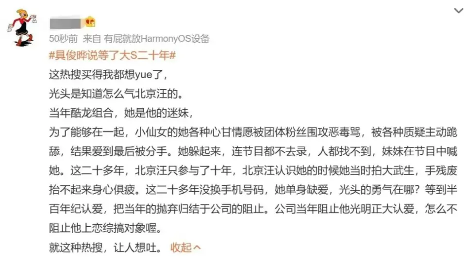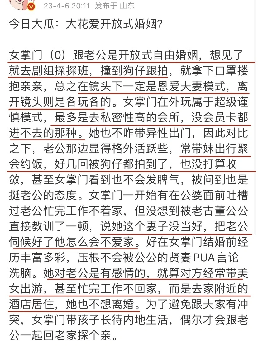 点击右方关注,每天都有圈内大瓜奉上。这几天娱乐圈里相当不清静,每天都有大瓜传来,仅4月7日一天就曝出多个大瓜。 01、高圆圆赵又廷被曝婚变高圆圆和赵又廷是圈内少有的恩爱夫妻,但是却被娱记爆料两人是开放式婚姻,换句话说就是各玩各的,互不打搅,但是不仳离。 据娱记透露,镜头前两人肯定会维持好恩爱夫妻的人设,但是脱离了镜头,女方会去私密性很好的会所,没有会员卡进不去的那种,在外和异性保持隔断。 赵又廷在活泼许多,根本不在意被拍,和玉人约会这种变乱被拍也不是一次两次了。高圆圆对此绝不在意。 与此同时,娱记还透露,高圆圆在婆家还被刻板守旧的公公教导不敷贤惠,不是好老婆,高圆圆为了克制家里抵牾,选择带着孩子久居本地,偶然归去探亲。 对于娱记的爆料也并非空穴来风。 高圆圆和赵又廷简直多次被拍在公众场合秀恩爱,而且角度和机遇都刚刚好,总能被狗仔拍到。 别的,赵又廷私下也简直和助理关系密切,前几天还被拍到和多位女性友人私下聚餐,身边没有高圆圆的身影。 看来娱记的爆料并非空穴来风,只能说圈内人真会玩,让人看不透,不知道高圆圆赵又廷这对恩爱夫妻什么时间翻车。 02、张某科被带走观察张某科一事在网上引起了热议。 4月7日,娱记懂瓜呱透露这件事迎来了最新盼望,张某科被带走观察,毕竟立即会水落石出。 着实在前一天夜里的时间,就有多个娱记爆料张继科被带走了,而且是悄悄带走。 值得一提的是张某科一事扳连多位明星,除了国家队的同事借给他钱之外,尚有邓莎、袁姗姗、田亮等人都有过经济纠纷。 与此同时张某科之前的几任女友都和其有关系,不免被其牵连。 有专业人士表现向他人出售或提供个人信息,情节恶劣的会处3年以上刑期,情节严峻的三年以上七年以下,张某科这一次或将面对监狱之灾。 除此之外,张某科的粉丝们也在网上甩卖他的星官周边,最低代价一分钱,现在的情况是搭钱都没人买,批评区都表现“不利”。 张某科混到这个份上,也算是咎由自取了,坐等观察结果出炉。 03、景甜被曝烦闷症复发张某科不管落得什么了局,都不令民气疼,受害者景甜的现状才是令人担心。 4月7日,据娱记透露景甜的状态非常不好,变乱在网上放肆宣扬,导致景甜的烦闷症复发了,身边的工作职员全天伴随,而且停息了手头的全部工作。 除此之外,景甜入圈初期资源咖一事也被翻出来,据悉张某科还在网上买水军带节奏,试图转移大众的视线,可以说是相当渣了。 值得一提的是,景甜昨天在风波后初次露面,整个人的状态非常不好,包裹的严严实实,脚步极重,眼神躲避镜头,整个民气事重重的,可想而知这件事对景甜的打击有多大。 只盼望早点水落石出,暴徒得到处罚,景甜可以或许早日走出阴霾。 04、小S和异性大尺度合照小S在圈内的作风是相当外放的,节目中公然对异性动手动脚,就连两任姐夫都没有躲过小S的揩油。 近期,小S和一位男性友人的大尺度同框合照流出。 图中小S身穿灰色卫衣,一手叉腰,而身旁的男友人则一丝不挂,就连告急部位都没有布料遮挡,即便打码处理处罚了,但照旧能看到尺度有多大。 不得不感慨小S真的玩得开。 小S出道多年,已经不是第一次有这种大尺度的合影了,此前小S在运动演出的时间和肌肉男现场热舞,画面香艳没眼看。 小S却在台上一脸享受的心情。 许雅钧在台下和玉人约会,小S在公众场合和肌肉男密切互动,这两夫妻简直是“绝配”。 05、具俊晔秀恩爱翻车4月7日,具俊晔又在大众面前秀恩爱了,但是这一次劳绩的不是歌颂,而是全网嘲。 变乱的因由是具俊晔表现本身期待了大S二十年,终于比及了两人的再次相遇,还表现本身很有耐心,当有好的时机出现的时间,立即就跟她联结了。 具俊晔本想立情根深种人设,没想到被扒出从前扬弃大S,上节目相亲的变乱。 具俊晔顶峰时期,劳绩了一众迷妹,大S就是此中一位,但是两人短暂相恋,恋情刚一曝光就分手了,大S被众人讽刺,小S还在节目中为姐姐行侠仗义。 别的,大S没有和汪小菲仳离的时间,具俊晔但是带着本身妈妈上相亲节目为本身找老婆,现在怎么全忘记了。 具俊晔的采访一出,遭到了网友的无情讽刺,网友纷纷表现想吐。 贫困下次具俊晔想要秀恩爱的时间好好预备一下故事和台词,当众打脸着实是太尴尬了。 【发展路上,感谢关注】 |