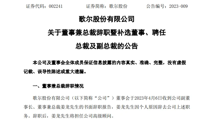 中国基金报 安曼 4月7日晚,歌尔股份公告,董事会于2023年4月6日收到公司副董事长、董事兼总裁姜龙的书面辞职陈诉,姜龙因个因缘故原由辞去公司上述职务。辞职后,姜龙将继承公司高级顾问。 制止公告日,姜龙直接持有歌尔股份约2.5亿股,离任后,其所持公司股份将按照相干法律、法规的规定举行处置处罚。 有知恋人士爆料称,这一办法是由于姜龙的个人身材缘故原由所致。 根据公开资料体现,姜龙出生于1974年2月,中国国籍,无境外居留权,美国马里兰大学战略管理专业博士、中国人民大学管理科学专业硕士、清华大学质料科学与工程专业学士。 姜龙于2004年参加歌尔股份,历任歌尔股份副总裁、高级副总裁、实行副总裁,兼任中国电子音响行业协会副会长,中国电子元件行业协会电声分会理事长。 公告体现,姜龙辞职后,在总裁空缺期间,由董事长姜滨代行总裁职责。而姜滨是姜龙的哥哥,于2001年建立了歌尔声学。 副总裁一个月前刚去职 就在总裁姜龙去职前不久,3月7日晚,歌尔股份公告称,当日董事会收到公司副总裁吉永和良的书面辞职陈诉,吉永和良因个因缘故原由辞去公司副总裁职务,辞职后,吉永和良不再继承歌尔股份及其子公司其他任何职务。 据歌尔股份此前公告,吉永和良,日籍,美国华盛顿大学工商管理硕士、同济大学机器专业学士,曾任IBM副合资人,在战略与厘革管理范畴具有丰富履历,兼任中国捏造实际产业同盟副秘书长。 新任总裁、副总裁简历曝光 4月7日晚,歌尔股份另有多份公告披露,此中董事会同等同意提名原副总裁李友波老师为歌尔股份总裁,饶轶老师为副总裁,刘耀诚老师为第六届董事会非独立董事。 简历体现,李友波,男,中国国籍,无境外居留权,1977年12月出生,大连理工大学主动化专业学士,现任歌尔股份董事,2003年参加歌尔股份,历任歌尔股份副总裁、工程师、技能司理、古迹部负责人等职务。 歌尔股份称,李友波拥有近二十年电声零组件/整机研发、制造范畴的履历,李友波未直接持有公司股份,与持有公司5%以上股份的股东、实际控制人、公司其他董高监不存在关联关系。 别的,饶轶,男,中国国籍,拥有美国永世居留权,1983年6月出生,清华大学电子科学与技能专业和北京大学经济学专业双学士,清华大学电子科学与技能专业硕士,美国加州大学伯克利分校光电子专业博士,现任歌尔股份光学业务负责人,2019年10月参加歌尔股份,曾在美国 Bandiwith10 Corporation、Rokid US 任职。 据公开资料,饶轶除向导团队实现多项技能创新外,还突破了多个头部大客户,跟客户创建妥当相助关系。 饶轶先后得到山东省科学技能青年奖、天津市科学技能发明特等奖等荣誉称谓,在捏造实际/增强实际光学范畴拥有丰富的履历,未持有歌尔股份股份,亦不与歌尔股份高管存在关联关系。 基金君在查询资料的时间还发现,饶轶还作为2023年山东省政协委员担当记者采访,饶轶体现,“支持潍坊建立元宇宙产业园”写入山东省政府工作陈诉,将会吸引更多企业来美满元宇宙产业链,信任政府相干部分很快会订定出台元宇宙产业发展专项规划,集全省之力共同打造元宇宙产业集群。 积极推动元宇宙产业链在山东的鼎力大举布局和发展,这一点和歌尔股份董事长姜滨3月29日在山东儒商大会上发表的观点,不谋而合。 刘耀诚,男,中国国籍,拥有美国永世居留权,1973年10月出生,美国斯坦福大学质料科学与工程博士、电子工程硕士、清华大学质料科学与工程硕士、学士。2019年参加公司,历任公司战略、投资、研究院负责人等职务。 刘耀诚老师曾在IBM半导体研发中央、McKinsey & Company(麦肯锡咨询公司)、Silex Microsystems AB等机构任职,在技能研发、战略规划、投资并购方面拥有丰富的履历。 上述提名士选将在董事会审议通过之后开始履新。 800亿果链巨头押注元宇宙 客岁“被踢出果链”的听说,让歌尔股份连续跌停。毕竟上,歌尔股份早就想扬弃“苹果代工厂”的身份。 据相识,2016年起,歌尔开始同时布局增强实际范畴的研究开辟工作。每年拿出营收的6%-8%投入研发,近5年累计投入已高出150亿元,连续6年夺得中国电子元件百强研发力气榜单冠军。捏造实际头戴产物进入“国家级制造业单项冠军产物”名单;“全主动VR产物智能生产线”斩获中国精良工业筹划奖银奖。 歌尔股份有限公司董事长姜滨曾体现,歌尔做的VR、AR相干产物是元宇宙的入口硬件,发展远景非常好。颠末10年左右的储备,在未来3-5年应该处于一个发作期。 现在,元宇宙已成为歌尔刚强的布局方向。客岁前三季度,歌尔智能硬件业务营收435.52亿元,同比增长95.87%,占总营收比例近60%。 但是从行业角度来看,2022年为环球智能手机市场近十年最差年份,整年出货量同比下滑11%,此中中国市场销量同比降落19%,8年内初次跌破3亿部。 另据Canalys数据,2022年第四序度,环球个人智能音频装备出货量降落 26%,跌至1.1亿部。 别的,IDC数据体现,2022年环球AR/VR头戴装备出货量880万台,同比降落了20.9%。 需求不振,对于歌尔股份的影响也黑白常明显的。根据此前歌尔股份业绩预告体现,经调解后的2022年度净利润17.1亿元~21.37亿元,同比低沉50%~60%,较前次业绩预告的净利润40.61亿元~47.02亿元已大幅下调。 此中,被大客户关照停产的产物预计在2022年度内无法规复正常生产发货。受此影响,公司本年度业务收入淘汰不高出33亿元,与之相干的直接丧