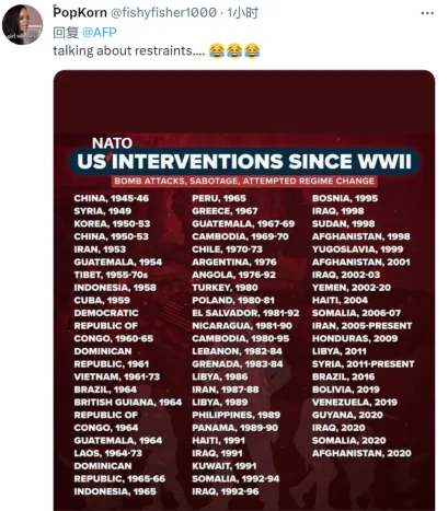 【环球网报道记者 张晓雅】中国人民解放军东部战区按操持于4月8日至10日在台湾海峡和台岛北部、南部、台岛以东海空域构造环台岛战备警巡和“团结利剑”练习。法新社声称,练习开展之际,美国国务院本地时间8日“敦促”中国“保持克制”,并称华盛顿已准备好推行美国在亚洲的安全允许。美方这番亮相引发网友讽刺,有人体现,“真是太故意思了。美国战役呆板不懂得克制,却要求别的国家克制。” 据法新社报道,美国国务院发言人8日声称,“我们与中华人民共和国的沟通渠道仍然是开放的,我们不绝敦促保持克制,不要改变现状。” 对于美国国务院发言人“敦促克制”的说法,有人@法新社说,“真是太故意思了。美国战役呆板不懂得克制,却要求其他国家克制。”↓ “既然要说克制……”一名网友在推特上如许留言,然后配图中摆列了二战以来以美国为首的北约在全天下范围内举行的干预、炸弹打击、粉碎以及试图改变政权等一长串清单。↓ “美国敦促克制?你在开打趣吧”。↓ “‘敦促’,‘严厉关切’ ,这届政府就是个笑话。” ↓ 对于众议长麦卡锡等人掉臂中方猛烈反对和严正会商,执意访问“过境”窜美的蔡英文,中方已对此表达严正态度,此举严厉违反一个中国原则和中美三个团结公报规定,严厉违反国际法和国际关系根本准则,严厉侵害中方主权和国土完备。中方还采取反制步调,外交部发布关于对美国哈德逊研究所、里根图书馆及其负责人采取反制步调的决定,对上述两家机构和相干四名负责人采取限定我国境内机构与其生意业务互换、冻结其在我国境内产业、克制入境等。 有关东部战区构造环台岛战备警巡和“团结利剑”练习,东部战区消息发言人施毅陆军大校体现,这是对“台独”分裂权势与外部权势勾连寻衅的严厉告诫,是保卫国家主权和国土完备的须要办法。 |