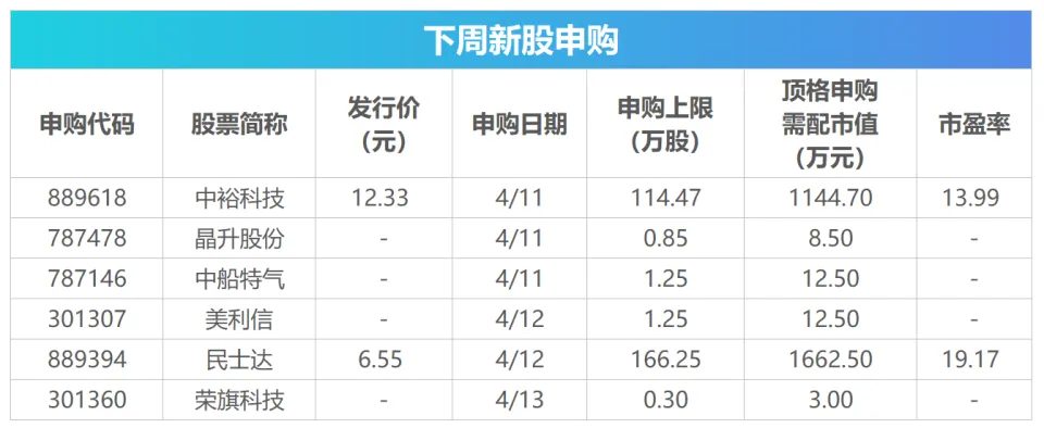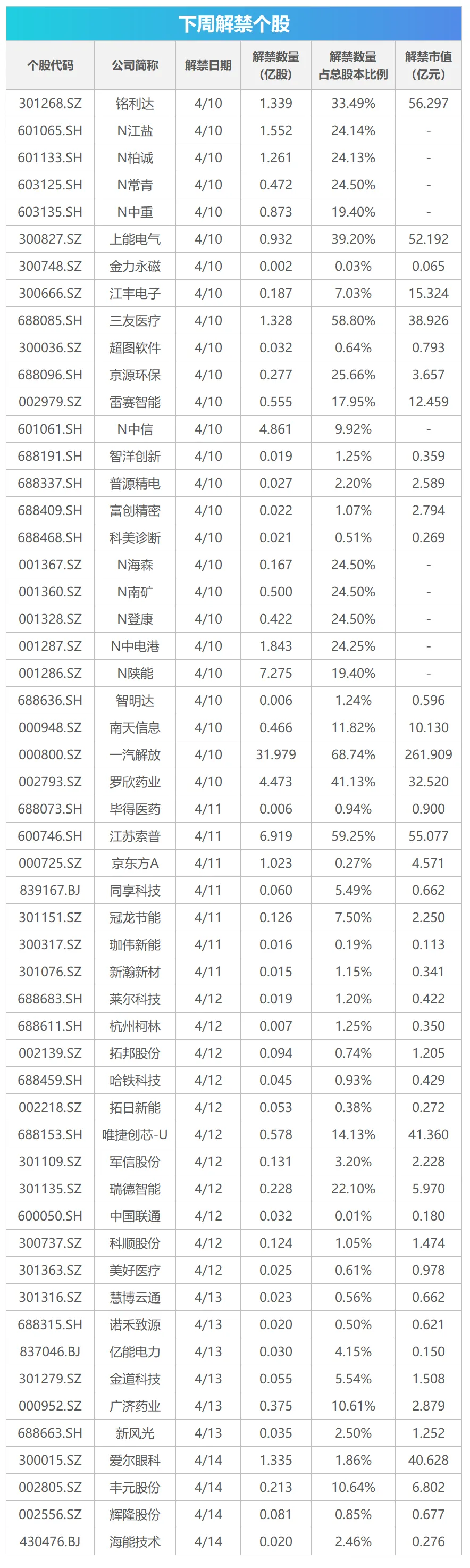 【重磅消息】 3月CPI、PPI等数据将公布 据国家统计局,4月11日,3月CPI、PPI数据将公布。中信证券此前研报指出,预计3月份开始,焦点CPI同比读数仍将在消耗需求的动员下继承回升。PPI环比预计将转正,但思量到客岁二季度的高基数,PPI同比的底部或将在23Q2出现。 除CPI、PPI外,3月新增贷款、M2、社会融资总规模等金融数据也将公布。此前中金公司预计,3月新增信贷有望继承保持同比多增,社融增速大要持平。 主板注册制首批10家企业将上市 4月4日晚,沪深买卖业务所公布,主板注册制首批企业上市买卖业务的各项预备工作已根本停当,上市机遇已经成熟,将于4月10日举行首批企业上市仪式。 主板注册制首批10家企业分别为中重科技、中信金属、常青科技、江盐团体、柏诚股份、中电港、海森药业、陕西能源、登康口腔、南矿团体。4月10日,该10家企业将在简称前加标识“N”,上市越日至第5个买卖业务日,将在简称前加“C”标识。 美联储将公布集会纪要 4月13日,美联储将公布钱币政策集会纪要。4月7日,美联储利率掉期表现,美国3月就业数据公布后,美联储5月加息的几率凌驾三分之二。 第133届广交会将举行 第133届广交会将于4月15日到5月5日在广州市线下举行。 此前,中国商务部国际贸易会商代表兼副部长王受文先容说,这届广交会是疫情防控实行“乙类乙管”政策后初次全面规复线下办展。王受文透露,第133届广交会按照惯例,线下展分为三期举行,每期举行时间为5天,总展览面积150万平方米。此中,出口展147万平方米,出口展展位有7万个,参展企业3.4万家。入口展3万平方米,共有来自美国、加拿大、意大利、德国、西班牙等40多个国家和地区的508家景外企业参展。 商汤、阿里将分享人工智能最新希望 4月7日,商汤科技在官微公布,将于4月10日下战书三时举行商汤技能交换日运动,交换日将聚焦范式厘革,原创技能突破。官微表现,商汤将在交换日上分享人工智能技能希望。 别的,据报道,2023阿里云峰会将于4月11日在北京召开,阿里巴巴董事局主席兼CEO张勇,阿里云智能首席技能官周靖人、阿里云智能环球贸易总裁蔡英华在内的重要负责人将出席主论坛。圈内人士提供了独家消息:“阿里11日推出大模子,18日推出行业应用类模子。”但从阿里云人士处得到的消息,满是“不知道”。一位阿里内部人士确认,大模子产物已在阿里内部各个产物线接入并举行了内测,表现很惊艳。 290亿元逆回购将到期 Wind数据表现,下周央行公开市场将有290亿元逆回购到期,此中周一至周五分别到期20亿、20亿元、0元、80亿元、170亿元。 下周665亿元市值限售股解禁,一汽解放解禁261.91亿元居首 4月10日至14日,撤消10只上市新股,A股市场将有44家上市公司迎来限售股解禁。以个股最新价盘算,44股解禁市值合计665.12亿元。 从解禁市值来看,从解禁市值来看,按4月7日收盘价盘算,解禁市值居前三位的是:一汽解放(261.91亿元)、铭利达(56.3亿元)、江苏索普(55.08亿元)。从个股的解禁量看,解禁股数居前三位的是:一汽解放(32亿股)、江苏索普(6.92亿股)、罗欣药业(4.47亿股)。 【新股机遇】 下周,A股将有6只新股申购,此中北交全部2只,科创板2只。此中,4月11日申购的是中裕科技、晶升股份、中船特气;4月12日申购的是美利信、民士达;4月13日申购的是荣旗科技。 |
