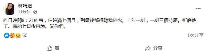 4月9日,台媒突然爆出爷孙恋音乐人李坤城病逝的消息,享年66岁,随后,小40岁女友林靖恩在交际网络发文证实李坤城因大肠癌离世,并在文中透露了李坤城离世的细节。 林靖恩在文中透露,李坤城是在昨晚8点21分去世的,整整在医院里住了7个月,离世时林靖恩不绝陪在他身边和他语言,林靖恩体现李坤城生命末了一刻都在听她在身旁碎碎念,“十年一刻,一刻三个时间”是林靖恩和李坤城在一起的时间,抱病这段时间,李坤城不绝饱受折磨,林靖恩非常心疼的写道:“折磨他了,愿能七日后再说,爱你们”。 早在林靖恩发文透露李坤城的死讯前,李坤城的儿子就在交际网络发文哀悼称:“愿天上的阿爸好悦目照阿爸”,早在3天前,李坤城的儿子还发文透露李坤城躺在病床上岌岌可危,儿子透露李坤城很歉仄没有什么遗产留给他,李坤城的儿子体现并不抱怨父亲,他称李坤城给他的已经许多了。 台媒记者曾接洽李坤城的儿子,他没有多说什么,不愿继承采访,之后便删除了这两条动态,又上传了一张李坤城年轻时的照片,照片中李坤城抱着一个孩子,照片中还配文:“多少次在爸之怀中,听着爸之哼着催眠曲,静之睡着”,以此哀悼父亲的离世。 台媒还致电了林靖恩的父亲,林父体现他和李坤城没有什么关系,两人更没有什么联结,他不知道李坤城发生了什么。 从前,李坤城和林父黑白常好的朋侪,之后李坤城和林靖恩走到了一起,由于两人年事相差很大,引起了巨大的争议,不满女儿林靖恩和李坤城的恋情,林父一气之下就和林靖恩断绝了关系。 李坤城和林靖恩上个月刚度过来往10周年吊唁日,早在客岁李坤城就传出病重的消息,其时他还发声透露过自己的身材状态,称自己的身材不绝很好,很康健,他要保持康健的身材,才气和女友林靖恩相处得久一点,两人此前曾操持完婚,现在李坤城却先走一步,独留林靖恩。 林靖恩由于和李坤城的恋情备受争议,现在李坤城离世,林靖恩的家人也和她断绝了关系,此时的她可以说是孤苦孤独,而且由于感情上的争议,她之后的感情也会备受关注,受到不小的影响。 不管怎么说,斯人已逝,李坤城,一起走好! |