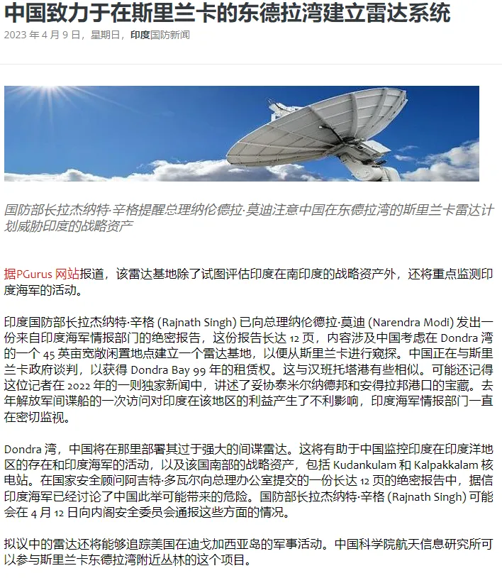 印度作为一个时常和中国发生领土辩论的国家,又作为美国主导的、用于遏制中国而设置的“四方安全对话”成员国,其消息是值得我们去关注的。从参加“四方安全对话”开始,印度就反复与美国共同,共同来打压中俄:据信,印度不光参加了对乌克兰举行军事救济,还要大力放肆创建水师。而创建水师的告急目的,无异于遏制巴基斯坦和中国在印度洋的海上活动,以制止中巴“双线打印”。 据印度国防消息克日报道,印度国防部长拉杰纳特·幸格已经向总理莫迪发出了一份来自印度水师谍报部分的“绝密陈诉”,这一份陈诉长达12页,内容告急是中国思量在斯里兰卡的Dondra湾设置一个雷达基地,以便“对斯里兰卡举行窥伺”。印度媒体的报道向来就黑白常奇异无比,报道的浮夸程度也是相当强的。 但是,好像还弄不明白谍报内容的印度媒体,后脚又夸大,中国在该处创建的雷达基地,有助于“监控印度在印度洋地域的存在以及印度水师的动向”,以及印度在南部的“战略资产”,比如两个核电站。而印度得到的谍报表现,中国计划设置的雷达还可以或许追踪美国在英属迪戈加西亚岛上的军事活动。 实际上,中国即便真的计划在Dondra湾设置一个雷达基地,那么无论怎样都是不大概监控到印度水师一举一动的。Dondra湾险些位于斯里兰卡最南端,而印度现在的告急军港分布在孟买、科钦等地,位于印度半岛西部,更加侧重于对巴基斯坦水师举行反应。那么,中国设置的雷达无论怎样也无法从Dondra湾隔着各种构筑、山地扫描到印度水师的举措。 在未来,印度还计划在金奈设置一个航母船埠,但从地理分布上也与Dondra湾完全相悖,更不大概出现印度媒体所称的“中国监控印度水师的动向”。更别提美国在英属迪戈加西亚岛上的活动也被中国监控,Dondra湾和迪戈加西亚岛之间的直线隔断就有至少1750公里,岂非中国要在斯里兰卡创建起一座光是有源相控阵天线阵列就高达40余米的P波段弹道导弹预警雷达? 大国之间的博弈,不大概以某一个雷达站的创建就能立刻分出胜负。印度此举完满是在骇人听闻,诽谤中国和斯里兰卡之间的战略相助关系。究竟,斯里兰卡是印度的“后花圃”,中国如果在此处创建了印媒恶意炒作中所称的“军用雷达站”,也就意味着与斯里兰卡的军事相助关系翻开了新的一页:汗青上,中国和斯里兰卡是曾经睁开过军事相助的,向斯里兰卡提供了SLC-2E炮兵定位雷达,并因此让斯里兰卡当局军精确定位了“猛虎构造”的火炮。 而如今斯里兰卡当局停业还没多久,也没有非常可靠的政权;中国若要往其上摆设军用雷达站,不光安全得不到包管,还轻易泄漏事关国防的告急军事机密。而如果说中国要向斯里兰卡设置雷达站,也根本不是近期的“绝密谍报”才华找到陈迹:早在2018年,斯里兰卡情形局就访问了中科院中层大气和环球情况探测重点实行室,并提出斯里兰卡急需中国的情形雷达。中方代表也予以回应,表现盼望在斯里兰卡建立大型情形雷达,用于办理科学标题,这是根据开源消息所得的资料,并没有藏着掖着。 而实际上,情形雷达无论是形状照旧波段,与军用雷达照旧有着不小区别的。可见,中国本偶尔在斯里兰卡设置军用雷达站,并用于“探测印度水师动向”等用途。中国根本偶尔加剧地域抵牾,以致是激起地域的军备比赛。如今印媒完满是在恶意炒作中国与斯里兰卡的民间相助,其用意相当邪恶。 印度怕的是什么?接洽到印度近来参加了对乌军事救济,意思也已经相当显着了:印度要在美俄之间选边站队,究竟如今的动作已经很明白;而印度又不绝将中国视为地缘政治上的对手,此时恶意炒作中国要在斯里兰卡设置雷达站,恐怕是为了印度要向美国求购MQ-9B大型察打一体无人机造势。 究竟,从2021年10月开始,印度就在哗闹要买无人机,并在“年底签订条约”;这事拖了这么久还没有端倪,想必美方也不满足印度在俄乌战争中的中立。炒作“中国在斯设立雷达基地”,也让印度求购MQ-9B无人机的变乱更加“公道”,来由更加充实,也就更能感动美国。而这批无人机的采购灰尘落定之后,印度的下一步动作将会怎样?我们有没有须要予以果断反制? |
