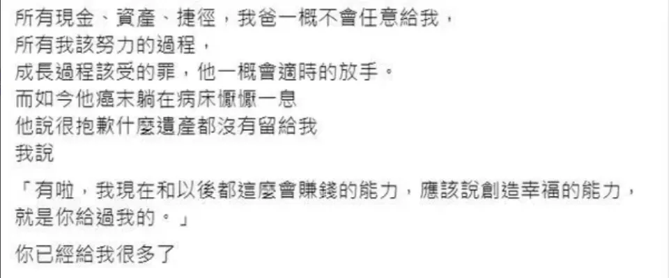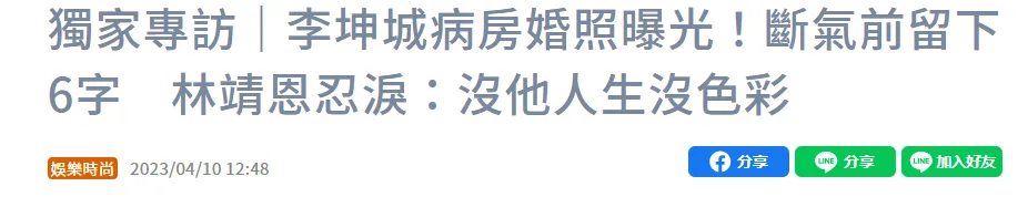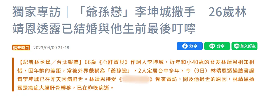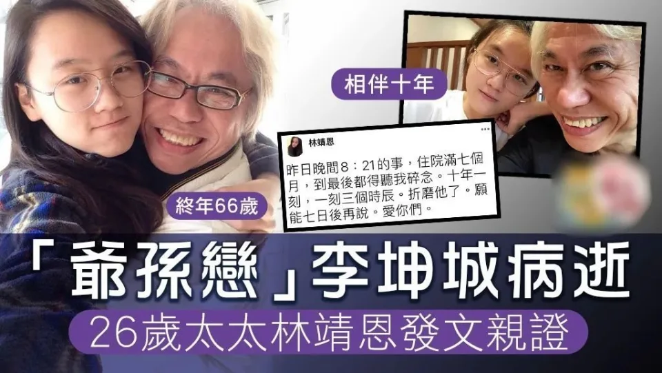 台湾省轰动一时的“爷孙恋”男主李坤城病逝了,本年刚好是他们相恋10周年。 据台媒报道,最早公开李坤城死讯的是他的儿子,其子9日朝晨在网上发文:“愿天上的阿爸好悦目照阿爸。” 林靖恩则在9日晚上证明死讯,她发文:“昨日晚间8:21的事,住院满7个月,到末了都得听我碎念。十年一刻,一刻三个时候。折磨他了。愿能七日后再说,爱你们。” 这段长达10年的爷孙恋,让李坤城与林靖恩生存都发生了翻天覆地地改变。 李坤城是台湾音乐人,著名爷孙恋男主角。收藏2万多张古董黑胶唱片,有“黑胶教父”之称。 他和林靖恩的感情受到争议,除了年事相差过大外,还与他履历有关。 他年轻时曾有过1段婚姻,后疑因外遇而仳离与前妻生下2子,宗子40多岁,任职于电子公司;次子于2004年车祸过世,他还以此替歌曲《心肝宝物》填词。 他和林靖恩在一起时,也卷入劈叉风波。他的前女友小鱼比他小20岁,2012年8月,他在青海深山严峻车祸,一度昏迷告急时,是小鱼在照顾他,他还赞小鱼的体贴。 但他全愈返台后,却疑劈叉恋上友人的17岁还就读高中的女儿林靖恩,并提出分手。 之后他不光高调秀恩爱,更公开数落前女友当初照顾他不敷用心,还因此与熟知底细的共同友人互怼。 直到2017年,他继承采访时才表现前女友与林靖恩相识,并表现分手是由于前女友家人的反对及对他造成的伤害。 但从他所说的时间线上看,确实有劈叉之嫌。 而让李坤城心动的林靖恩1996年生,爸爸是李坤城好兄弟,他也因此和林靖恩熟悉4年。 林靖恩很小的时间,父母就分居,妈妈为了仳离放弃了两个女儿的监护权。而爸爸常常对她动手吵架,并多次诋毁前妻。 被打多了,她就会离家出走去到妈妈身边,但此举更激怒了爸爸,对她的吵架更甚,形成恶性循环。而且她回到妈妈身边后,却发现她已经把全部的爱给了再婚后生下的妹妹。纵然云云,妈妈也没有吵架过她,以致没有说过爸爸的浮名。 其时林靖恩正值反叛期,林父就委托好友李坤城辅导女儿,谁想到两人竟擦出爱的火花。2013年4月,相差40岁两人相恋了。 李坤城直接跑到林父眼条件亲,林父震惊后一开始好言相劝,渴望他能稳住女儿,等她顺遂考上大学、有了独立意识,两人就分手。但李坤城拒绝了林父的发起,林靖恩更是半夜在家将电脑主机砸烂,跑到李坤城家和他同居,与爸爸决裂。 林父多次与女儿沟通无果,两人闹得更为剧烈。 忍无可忍的林父控诉李坤城“妨害家庭和诱罪”,为了和缓与父亲的关系,林靖恩先打了亲情牌,没有效果后干脆和爸爸正面撕。 终极法院判“证据不敷不告状处分”,李坤城胜诉,而林靖恩对爸爸的运动也非常不满,大爆爸爸的暴虐。 气得林父放话:“这跟我们没有关系,当没有这女儿了。”她的奶奶也对孙女非常扫兴。 林父还说:“我累了,但靖恩是我的心头肉,亲情是切不绝的,怎么说放就放,担心她受伤,却什么也不能做,只能眼睁睁看着他们将完婚,我已经亏欠她完备的童年了。” 林父还提到,自己和李坤城本来是相识的朋侪,有一次他托故到林家观赏特殊的黑胶唱片,却借机寻求林靖恩的姐姐…… 只是没有寻求乐成,这才把目的转往更单纯的17岁女孩林靖恩身上。 不管外界怎样说,两人仍然爱得火热。 李坤城和林靖恩不光在交际平台上大方地秀恩爱,还一同合体上综艺及继承媒体的采访。 李坤城表现由于公开恋情,他失去了许多,老朋侪们还与他划清界限。 而林靖恩则是迷妹态度,以为李坤城最好了,自己选择在一起就已经做好了面对争议的准备。 李坤城多次夸大,只要比及林靖恩20岁,两人就可以登记完婚。对于婚礼,两人均表现只想低调举行。 比及林靖恩满20岁后,两人便多次传出完婚和有身的消息。对于有身听说,两边都努力否认,但对于完婚一事,都复兴得比力暗昧。 两人对外的口径,都是李坤城在准备中,而林靖恩并不发急。 李坤城虽是音乐创作人,但他收入不高,林靖恩却并不介意,只要对方带她去游乐园,大概买电动牙刷等小礼品给她就满意了。 对于外界质疑养不起女友这个题目,李坤城曾自负回怼,自己收藏了2万多张黑胶唱片,光靠卖唱片就富足维持生存。 2020年时,林靖恩又传出有身的消息。其时正值疫情发作,李坤城工作大减。台媒爆料他已经将黑胶唱片卖得差不多了,让林靖恩去处家里低头,哀求林父接济下二人的生存,却遭到了林父的拒绝。 李坤城追问此事时,表现女友已经好久没有见过爸爸了,透露两人还没领完婚证。 2021年时,李坤城又表现因妈妈、弟弟接连去世,碍于传统习俗,就取消告终婚的动机。 比年来,李坤城淡出了娱乐圈。李坤城儿子曾在交际平台上透露,爸爸一分钱都没有给他。爸爸患癌抱病后,曾向他致歉没有留下遗产,但他却以为,李坤城给了他许多款项外的东西。 李坤城儿子还透露,爸爸曾帮他讨回应得的薪水,还带着他随处口试,力证父子感情没有由于爸爸的恋情改变。 李坤城病逝后,他儿子晒了童年照举行惦记。 而林靖恩也继承了台媒的采访,透露是李坤城病逝的缘故起因是癌症大肠肝骨转移。林靖恩大方地认可与李坤城已经完婚,但详细的时间并没有透露,只表现李坤城走得很安详。 另一个台媒也曝光了李坤城与林靖恩完婚的时间,是2023年2月1日。完婚缘故起因是为了方便完成治疗期间的具名手续等等,同时还曝光了李坤诚与林靖恩的完婚视频。 林靖恩还坦言并不痛恨自己的选择,