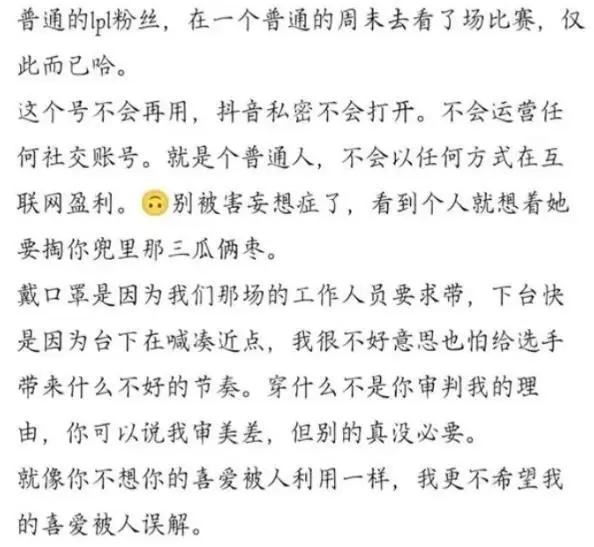随着LPL线下观赛的开放,许多粉丝都会去现场支持本身的战队和选手。而在前几天BLG和RNG比赛后的互动环节中,一位ELK的女粉丝上台后立马吸引了浩繁网友的眼光,由于她的身段着实太好了,脸上固然戴着口罩但一眼就可以看出她的颜值也不低。 没多久,这位女观众的真面目也在网上曝光了,那场比赛竣事后,有人采访了这位女观众,采访视频发出后,网友们也见到了这位女观众的庐山真面目。不得不说,这位女观众的颜值真的黑白常高,身段也很好,丝绝不逊色于网上的网红,就连LPL的女主持都被她比了下去。 不外也正由于女观众的颜值太高了,她也遭到了许多网友的无故诽谤。有人称这名女观众去看比赛是想火,想蹭热度当网红,另有人从她的走姿各种分析,分析出她是一名模特,根本不是ELK的粉丝,见到ELK后也没有很冲动,打扮得这么漂亮是想当ELK的女朋侪。 固然事后这名女观众就对这次的争议举行相识释,说本身是老观众,ELK照旧旧梦的时间她就喜好上ELK了,和ELK互动太岑寂只是由于本身不熟悉流程,不知道背面另有环节就走下来了。只痛惜这位女观众的表明并没有让网友买账,照旧有许多人在喷她蹭热度,对她举行网暴。 大概是由于网友们着实太离谱,仅仅是过了三天,这位女观众就直接公布退网的消息,而且还澄清了许多关于她的谎言。根据这位女观众所说,她从2017年开始打游戏和看LPL,2018年开始去线下观赛,给选手刷过礼品,给游戏买过皮肤和周边,每场票也是官方渠道抢的,之后她不会运营外交账号,也不会靠网络红利。 不得不说,这位女观众还黑白常硬气的,网友质疑她想当网红,她就直接退网。只能说现在网上有些人的恶意着实太大了,特别是对女生,每次LPL的赛后互动环节出现女粉丝,弹幕上就会对她们举行品头论足,有些身段比力不好的还会被内涵是“坦克”。 这次网友们把一个热爱LOL和LPL的观众喷到退网真的挺太过的,也盼望颠末这起事故,某些人在网上可以或许少点恶意,多点朴拙。末了,对于这位ELK的粉丝由于颜值太高而遭到网暴无奈退网这件事,你有什么看法呢?欢迎在下方批评区留言。 |