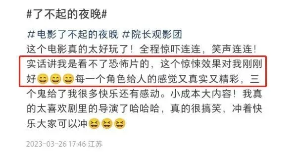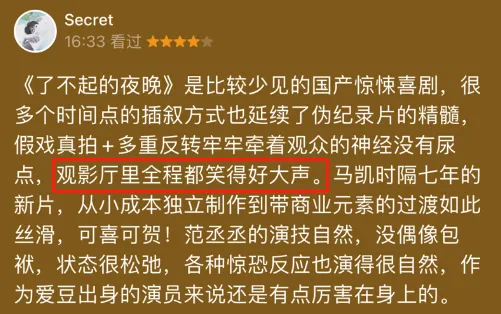 想象一下: 深夜,你独安闲公共茅厕办理人生大事,头顶的灯光一闪一闪,电流声滋啦滋啦,不免闻风丧胆。 忽然,隔壁传来一个低哑的男声问你借纸,有些猝不及防,但反倒让人松了口气。 你本着助人为乐的精神递已往几张纸,谁知对方还得寸进尺,要你送已往。 你有点火大,让对方本身过来拿。 对方似乎是妥协了,准备发迹—— 只见一只惨白、瘦骨嶙峋的手渐渐伸出…… 啊啊啊啊啊啊撞!鬼!啦! “鬼”手收回,用指甲撩开长发,暴露一张衰脸。 看着你与纸狂奔逃跑的方向,他长叹一口气,从下水道里捞出本身的手机,扯着公鸭嗓喊出一声:“歪?” 干嘛,没在横店见过cosplay啊! 笑得发癫! 看过惊悚片,看过笑剧片,但你看过将两者丝滑融合的“惊喜片”吗? 《了不得的夜晚》,有点新东西! 第一次,我见证了观影现场“七零八落”的盛况。观众前一秒被吓成心情包,下一秒就笑到打鸣,好不热闹! 友谊提示:本文略含剧透,但绝不影响您的刺激观影体验! 导演马凯,First影展身世,善于惊悚题材,童贞作《中邪》好评如潮。 监制易小星,代表作《万万没想到》《陈诉老板》《洗浴之王》,血液里流淌着搞笑因子。 两人相助,带来《了不得的夜晚》这个全网无代餐的惊喜。 起首打击我的是剧情结构:套娃式三重反转,aka十八线小演员横店惊魂夜。 一上来先整人吓人的硬活。 豹哥(范丞丞饰)、猴子(蒋易饰)、狗子(甘昀宸饰)开了一家三宝传媒公司,势要拍出点赞量过百万的网络视频。 痛惜,作品热度着实昏暗,三人决定干完末了一单拿钱遣散—— 到惊悚片拍摄现场,搞到独家幕后视频。 尚有比“惊悚片现场真有鬼”更劲爆的选题吗! 这边,豹哥和狗子带着扮成“鬼”的猴子来到片场,在屋内装神弄鬼。 那边,小山(蒋龙饰)、豆(孔连顺饰),直接上门找“鬼”。 两个名不见经传的小演员,好不容易得到了做惊悚片男主演的时机,分外爱惜。 小山想了个招,找自媒体狠狠炒作一把。 第一个反转,就藏在他这一样平常人想不到的脑洞里。 谁知,不消这群人多发挥,爆炸性消息主动到临—— 女主角“丽妃”在吊威亚时出现不测,告急送医。 这是出性命了?! 不等你做生理准备,立刻第二重反转发生——“鬼”吓人。 没过多久,“丽妃”竟重回片场,剧组众人惊奇一番后直夸她积极敬业。 反观小山、豆,人都不好了…… 他们明显刚得知消息,“丽妃”已经彻底没了啊!眷属都哭成一片了啊! 两人对视一眼,颤动着双腿意识到:假“鬼”走了,真“鬼”来了。 哪还敢高声语言?能用尽满身力气、痛心疾首地提示剧组其他人大事不好,快跑! 然而,根本无人在意他俩的说辞。 只听导演一声action,一场人与“鬼”的密切打仗立刻上演。 你猜,二人表现怎样? 不浮夸—— 惊艳导演,震动剧组,笑翻观众。 原来,这才是真·沉醉式演出的力气…… 至此,三宝兄弟、小山&豆、剧组三拨差别视角的人马汇聚成一条线。 但故事的反转并未竣事,反而走向愈加古怪——人吓“鬼”,你敢信?!(我是好人,我不剧透)…… 局中局、戏中戏、套中套,随处意想不到,如过山车般刺激的观影体验贯穿全程。 每当观众以为本身要被吓到时,画风陡然一转,走向爆笑时候。 显然,导演早已稳稳拿捏,把观众的反应也酿成了“反转”的一部分。 比如,“踹女鬼”: 上一秒,月黑风高,“女鬼”丽妃在路上飘得阴气森森,让本唯物主义人士都提心吊胆。 下一秒,豹哥以为这是本身兄弟猴子的扮相,上去就是一记飞踢,把“鬼”踹出三米远。 大爆笑,原来鬼也怕物理伤害! 笑料不光足,更猛。 辛辣讽刺披着搞笑的外衣,没有消解一丝犀利,反而有了举重若轻的力度。 问:小演员怎样形容本身0片酬出演? 高情商:我用本身的片酬投资了这部片。 低情商:我免费了。 问:为何要在古装惊悚片里加上摩托车戏? 高情商:古装片参加赛博朋克元素实现超实际主义映射,突破第四堵墙,留下疑点引人思考,看似是bug实际是破格传奇…… 低情商:制片人灵光一闪。 一个是最无人在意的十八线小演员,只能免费打工赚一个露脸的时机;一个是最有话语权的制片人,提什么离谱要求也有人上赶着去实现。 三两处闲笔,轻松扒皮圈内潜规则,妙啊! 不光包袱有新意,伏笔有call back,看影戏时尚有在大银幕和“熟人”认亲的快乐。 谁懂? 当院长看到蒋龙、蒋易、蒋诗萌、梦涵……逐一进场,不由得在心田疯狂喊话: 确定不是“一喜”演员们在搞团建吗? 我们“蒋立方”是真的前程了! 不得不说,蒋龙惊艳全场。 他演一个没有演技的演员,硬是把不会演戏这件事演得格式百出,突破想象。 一开始,他师从汤姆。 嘿嘿,不是影帝汤姆·汉克斯,而是这只汤姆猫 机动运用“舌颤”式演技来表达恐惊与震撼。 竟然从一个三次元人类的面部心情里,看到了二次元才有的张力。 蒋龙,真有你的! 嫌这不敷写实,那就再来条牛的—— 他又偷师孙楠,把“你快返来~”这句台词肝肠寸断地唱了出来。 高音九转十八弯,几头牛都拉不返来…… 笑剧结果与剧情、演出奇妙融合在一起,让“演”这件事成了最大的笑点,给足了笑剧人演出发挥的空间。 演技“反向升级”,“笑果”不停上翻。 他演得越浮夸,观众就笑得越高声。 不外,有一场戏,我是实打实地被蒋龙的演技感动了: 被“丽妃”吓到时,小山冷汗直冒,瘫软在地震弹不得。 仅仅用一双沉寂堕泪的眼睛,通报出他发自心田的恐惊。 这眼泪无关感情,美满是