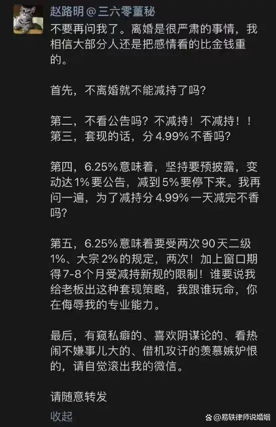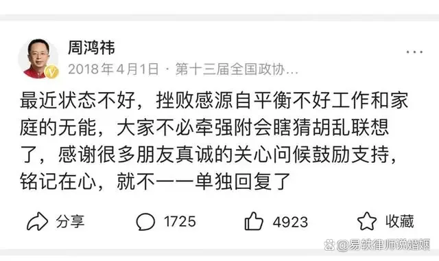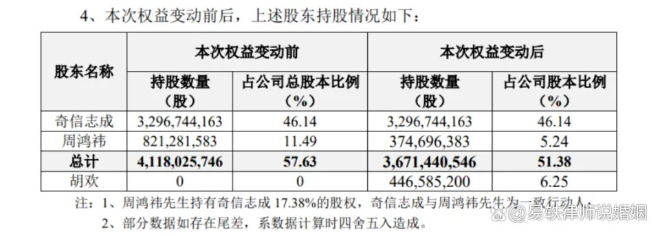 “质数不能分解”这个定律被周鸿祎冲破了。#360首创人周鸿祎仳离前妻分90亿# 周鸿祎与胡欢的完婚吊唁日是3月17日,周鸿祎曾给出颇为浪漫的解读——这是一个质数,不可分解。言外之意自己的婚姻牢不可破。 公开资料截图 宣告两人仳离是在4月4日,恰如数字背后的互联网语言——“页面丢失”,周鸿祎与胡欢也“丢失”了他们的婚姻。 三六零公告体现,根据仳离协议,周鸿祎拟将其直接持有的公司约4.47亿股股份(占公司总股份的6.25%)分割至胡欢名下。以三六零4月4日收盘价20.08元/股计,此次分割的股份市值到达近90亿元。 一时间,这场天价仳离事故成为资源市场的头条。 01 感情牢固的两人分道扬镳 究竟上,周鸿祎和胡欢认识 20 多年,双方的感情底子不可谓不牢固。 据周鸿祎自述,当时两人均在北大方正工作。“生存中的我非常羞涩,不敢明火执仗地去寻求。”他回想说,“在网络里,我如鱼得水,完全可以敞开了胡说八道,也可以去寻求我喜好的人。在水木清华BBS上,我找到了胡欢的ID,每天都和她天南海北地聊,非常投缘。” 当时胡欢身段高挑,气质端正,被称为“方正之花”,而当时的周鸿祎只是个坎坷潦倒的工程师。但是并不妨碍两个人从线上发展到了线下,两个人相知相恋走在了一起。 周鸿祎和胡欢年轻时照片 胡欢家庭条件比周鸿祎好,在创业初期,周鸿祎没有收入,都是胡欢挣钱养家。周鸿祎也曾说过:“太太对我的古迹资助特殊大。” 1998年,周鸿祎辞职创业。他租了北京南城的一个三居室,夫妻二人一间,别的的两间给员工住。纵然居住条件欠好,但是胡欢充实显现了明白与支持。不但云云,当时的胡欢给足了周鸿祎创业的底气。 周鸿祎曾以为,自己大概没办法做到和其他互联网公司一样,但是自己输得起,由于胡欢包管了他温饱题目。在他创业的最困难时间,很长一段时间完全没有收入,端赖胡欢抗住压力,打工赢利补贴家用。 厥后,在三六零上市敲钟时,二人并肩而立。在3Q大战时,胡欢为周鸿祎稳固后方。 每一个乐成的夫君背后,都有一个冷静付出的女人。对于周鸿祎而言,胡欢正是如许的女人。 从前间,周鸿祎曾多次对外体现,“太太是最好的选择”。胡欢也曾对媒体体现,“欣赏周鸿祎的女人不多。如今看来,我应该是独具慧眼的女人”。 但随着时间的推移,两人的家庭生存也出现了反面谐的一幕。 2018年3月30日,周鸿祎曾在朋侪圈发文感慨,他说:“我的人生竟然云云失败,没有任何意义”。此话一出,引起外界诸多关注。 在两天后的4月1日上午,周鸿祎揭开了他所谓“人生失败”的原形。 他在朋侪圈和交际媒体上体现,“迩来状态欠好,挫败感源自平衡欠好工作和家庭的无能,各人不必牵强附会瞎猜胡乱遐想了,感谢很多朋侪朴拙的关心问候鼓励支持,铭刻在心,就不逐一单独复兴了”。 巴菲特曾说过,婚姻是人生最大的一笔投资。两个人在财务上看起来都赢了,但是在某种水平上,终以遗憾收尾。 曾经感情牢固,相互扶持的两人,终极也分道扬镳。 02 疑似仳离缘故起因曝光! 没有过多的狗血剧情,周鸿祎与胡欢多年婚姻就如许走到了止境。 根据周鸿祎与胡欢签订的《仳离协议书》,周鸿祎拟将其直接持有的约6.25%三六零股份分割至胡欢名下。 股份分割之后,周鸿祎仍为三六零实际控制人,直接持有 5.24%(剔除回购专用账户中的股份数目后的比例为 5.35%)股份;胡欢拟直接持有公司 6.25%(剔除回购专用账户中的股份数目后的比例为 6.38%)股份。 公告截图 按照三六零最新市值1435亿元来盘算,此次拟转让给胡欢的股份代价约89.6亿元。 值得关注的是,此次周鸿祎仳离,正是公司因ChatGPT概念致股价大幅走俏之际。据21世纪经济报道记者统计,三六零本年来的股价涨幅高达207.03%。20日涨幅达81.56%。 对此,网友纷纷品评,有人以为分散风险,也有人质疑是变相减持。 面对网友的质疑,三六零董秘赵路明4日晚间在朋侪圈发文体现,“仳离是很严肃的变乱,我信赖大部门人照旧把感情看得比款子重的。” 他想表达的观点紧张为,周胡仳离不是为了减持套现,而是真的由于感情不复当年了。 赵路明所发朋侪圈的大意是,起首,不仳离也能减持;其次,公告已体现“不减持”;末了,6.25%意味着,减持要预披露。如果是为了减持不如直接分4.99%,省得还要披露。 婚姻是严肃的,从逻辑上讲,一个资源大佬仅为“减持套现”搞一场仳离秀确实没有须要。 03 仳离时股权应该怎样分割? 家理作为专注婚姻家事法律服务的状师团队,我们办理过的案件中,有不少财产纠纷也会涉及到股权分割。 有人大概会问:夫妻一方的股份、分红,在仳离时怎么分配?怎么分,简朴来说记取下面这两句话就行: 股权在仳离时这么分1、股权属于他/她的个人财产,只分收益不分股权 用个人婚前财产大概婚后约定归个人全部的财产投资的股权属于个人财产。但在婚姻关系存续期间,由此产生的收益(比如公司的利润分红、股价上涨抛售增值的部门)则属于夫妻共同财产 ,仳离时可依法分割。 2、股权属于夫妻共同财产,分割时视详细情况采取差异办法。 婚姻关系存续期间以一方名义对外投资所形成的公司股权,除双方有特殊约定外,该股权转化的收益应认定为夫妻共同财产,仳离时可依法分割。 着实,股权很特殊,包罗身份权和财产权,由于会涉及到公司其他股东的长处,显着区别于其他共同财产,而且,股权代价也是不
