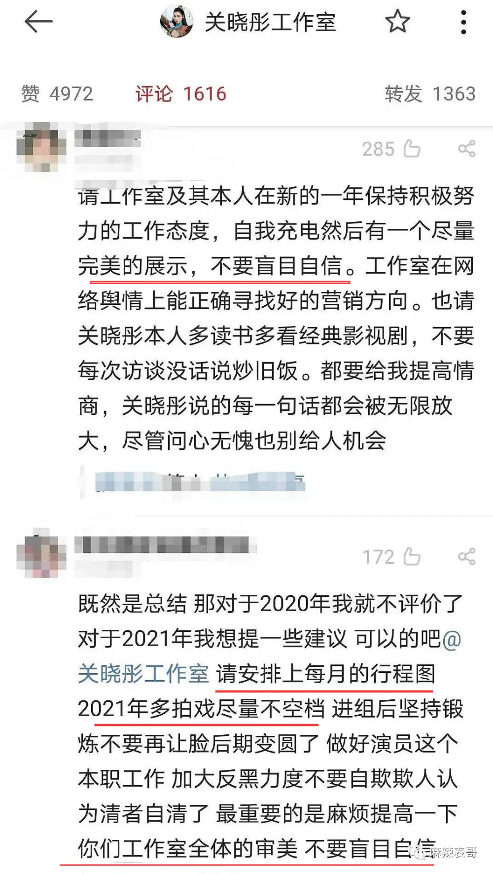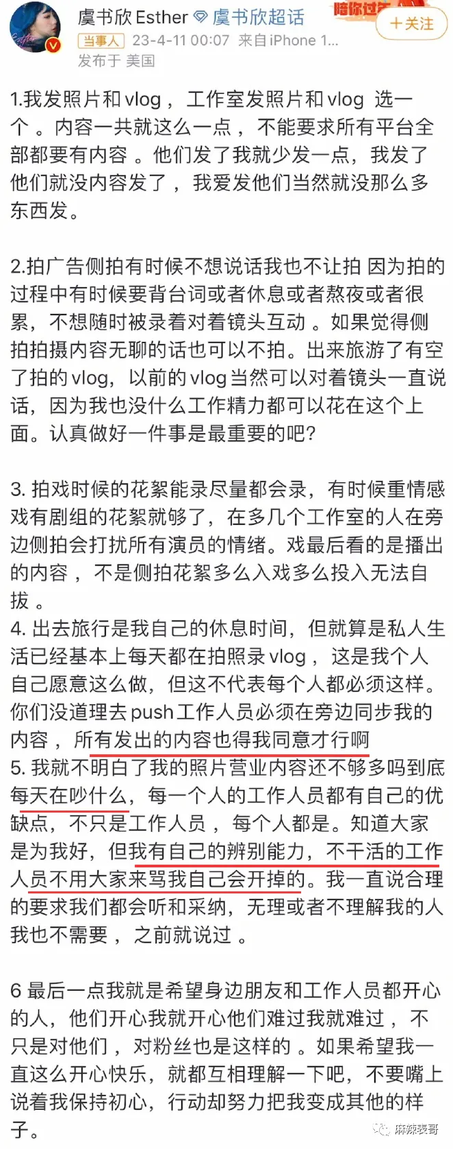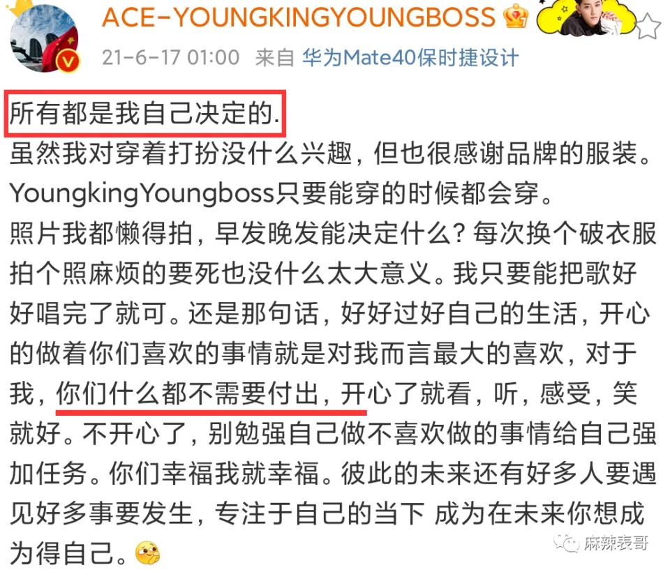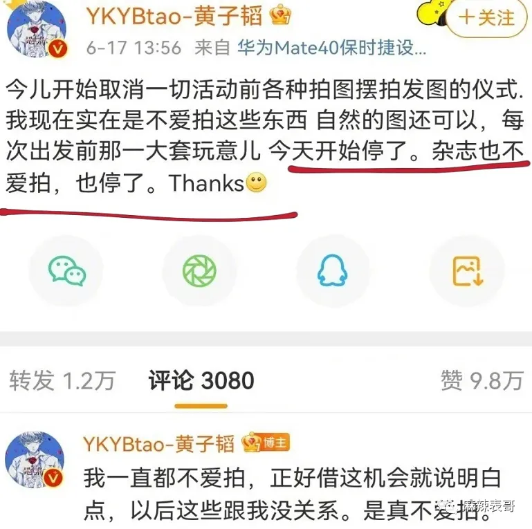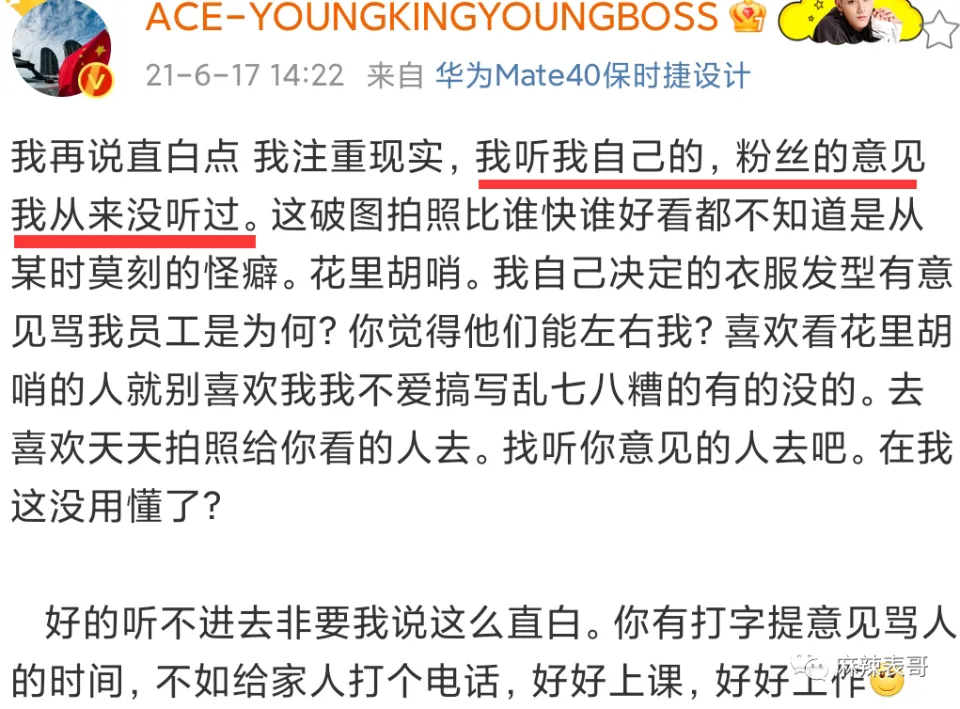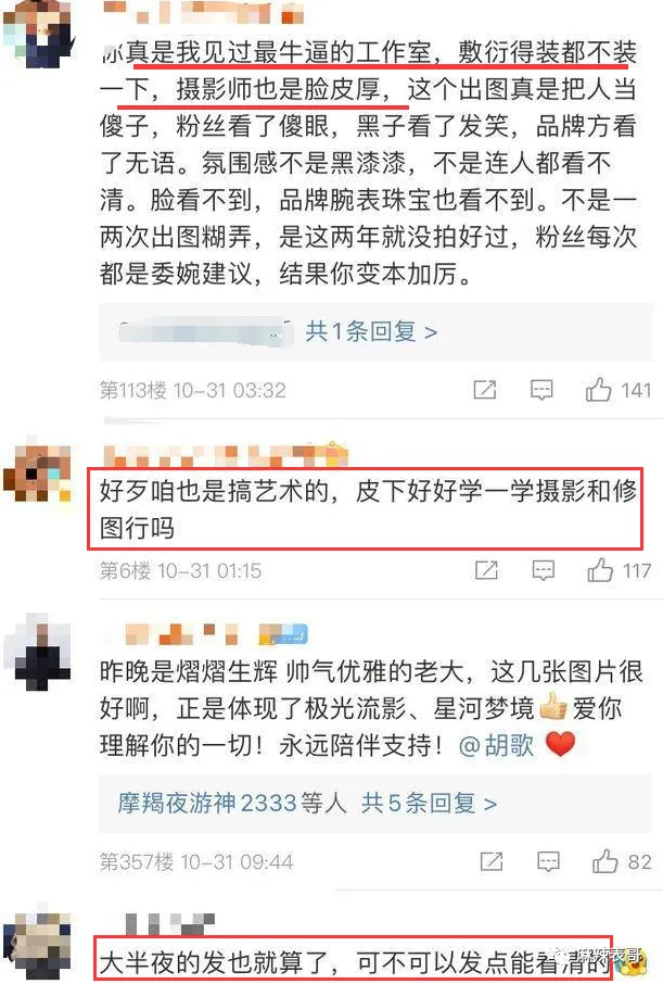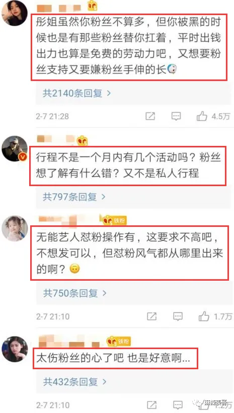 内娱艺人和粉丝之间的关系大噶?鲱难处置处罚的。远比艺人和经纪人,艺人和吃瓜群众之间来得更玄妙更复杂。怎么说呢?就是近之则不逊,远之则怨,多一分少一分都欠好搞。迩来,虞书欣给本身放了个假,出国旅游。 去了韩国。 去了美国。 出国度假固然没什么好说的,重要是她出去一趟,就失事了。 虞书欣这边忙着玩耍,粉丝那里忙着变脸。在虞书欣微博底下各种亲亲抱抱,彩虹屁满天飞。 到工作室底下,又是另一种态度。 颐气挑拨,阴阳怪气,吩咐工作室赶紧起来干活,发虞书欣的物料。 我翻了翻日历,4月8日那天是星期六。 好家伙,如今全网都在反对996,为反抗996做出各种哗闹,结果虞书欣粉丝在工作室面前耀武扬威玩一把资源的feel。固然了,称粉丝为资源还不敷准确。更准确的说,他们像是古装电视剧里大户人家的管家,对主子谄媚至极,对下人没个好脸。 然后很快,管家就被主子打脸了。 虞书欣回应,写了一二三四五六条。 划重点:全部发出的内容得虞书欣同意才行,不干活的职员不消粉丝骂,她本身会开除。 说直白点就是指粉丝多管闲事,艺人就是工作室的老板,工作室干啥不干啥都有老板来安排。 而说到这,我就想到一件事。 之前虞书欣走红毯,媒体出图是如许↓ 工作室出图是如许↓ 当时也有很多粉丝对工作室的图表现不满,说修得不像本人,如今来看这图应该是颠末虞书欣同意了吧? 固然,粉丝大概没想这么多。好的都是自家爱豆,欠好的都是工作室的错。即便虞书欣了局写了几百个字回应,粉丝仍旧嘤嘤嘤,秒变苦口婆心的老妈子,操碎了心要给虞书欣把关工作室。 咱就是说,粉丝难,艺人工作室的工作职员更难。粉丝费钱打投,费钱买代言,做数据,的简直确算是小份额的投资人,但工作室的工作职员壹泵η打工人,何苦什么锅都要打工人来背呢?而艺人怼粉这种事,不是第一次,早有先例在前。 之前,胡歌工作室发了四张胡歌的运动图。 粉丝看了后特别不爽。犹如观察的领导,一通点评,说工作室不可,照相师不可,修图师不可。 然后胡歌就了局了。说图是本身选的。 说照相师也很无奈。每次都背着相机来,一脸无奈归去。 胡歌这么一说,粉丝还敢骂?那一定是不敢。 比胡歌更护短的是杨洋。早前杨洋拍了一组图。 粉丝也很不满足。但他们不敢直接说杨洋,于是跑去diss杨洋的扮装师。然后杨洋就回:要不你来给我化?护得非常不客气。 暴性情的关晓彤比杨洋更暴。 大过年的,关晓彤工作室发了关晓彤这一年的总结。 然后粉丝就来提发起了。让他们进步审美,不要盲目自负,还要安排每月的行程图。 工作室说不发行程图,谢谢发起。 大概这句话惹恼了粉丝,厥后事就闹大了。 末了关晓彤了局回应。同样给工作室撑腰,渴望粉丝不要再给工作室添堵。 这一通怼,让粉丝大为伤心。纷纷感叹美意被伤害。 关粉有一句话没错,手伸太长简直讨厌,但公道的发起,艺人还怼的话就是美意当成驴肝肺。这句话很实用一批艺人。 比如娜扎。 曾有粉丝在本身微博许愿,愿娜扎早早进组。然后被娜扎怼了。 又有粉丝许愿,渴望娜扎搭戏的都是粉丝不作妖,正主帅气的大帅哥。又被娜扎给怼了。 大概娜扎是和陈乔恩取的经。 之前陈乔恩有一个铁粉在本身微博发表了对陈乔恩奇迹的见解,说陈乔恩不要乱接一些戏,多开辟开辟本身的戏路。 这段话被陈乔恩看到了。陈乔恩一顿输出,把粉丝给怼了归去。 固然粉丝话说得有点硬,但简直是理智奇迹粉啊,陈乔恩就算有本身的规划,不附和粉丝见解,也用不着亲身了局怼。毕竟艺人和粉丝声量完全不一样,很大概让粉丝被其他粉网暴。 固然,她没有江疏影绝。粉丝催江疏影进组,江疏影回了句“嘻嘻”。 配图是如许的↓ 一脚踢飞,老娘就是不进组,嘻嘻。 我要是她的粉,我一口老血喷到长城。 无所谓粉丝,直接硬刚的,还算是我行我素,离不开粉丝又嫌粉丝贫苦的,那就很纠结,也很尴尬。 比如黄子韬。 有粉丝发起黄子韬在运动前拍一些图,一开始黄子韬说全部都是本身决定,粉丝什么都不必要付出。 厥后直接生气,说杂志不拍了。 嗯,只听本身的,粉丝意见从来没听过。 牛掰哄哄的。把粉丝气惨了,厥后粉丝叫他驱逐后盾会,他驱逐了吗?没有。由于要用到粉丝的时间,他还是要用到。 出歌,粉丝要支持。 数据,粉丝也要做。 直播,粉丝也不能缺席。 真是用人朝前,不消人朝后。 想要流量又受流量拘束之苦的,尚有杨紫。早前,杨紫还没因《香蜜》而大红成为流量时,还在演《高兴颂》里的邱莹莹。 当时她就很倾慕有粉丝接机。 以致她有一个小号。 杨紫用这个小号出钱集资让粉丝探班。 可见,对于流量的倾慕。 但一旦成为流量,粉越来越多后,免不了就会受到粉丝的管辖。厥后杨紫和秦好汉谈爱情,隔三差五秀恩爱,大概空降秦好汉粉丝群,大概半夜晒合照。 粉丝本就对这段恋情不满足,看到频仍秀恩爱后就更不高兴。此中有一些品评过激的。 这事大概简直刺激了杨紫,她厥后怼了一天的粉。那叫一个失去理智。 说粉丝是母猪。 说不必要粉丝叫苦叫累外加伤害她身边人。 叫赶紧走赶紧走,别打着爱的名义来伤害。 总之,那一次是豪情输出了一整天,完全岑寂不下来。 那一战,杨紫应该丧失了不少粉丝。 但2018年《香蜜》一播出,丧失的粉丝数目又超量补了返来。但说来说去,圈内没有谁能有杨逾越会PUA粉丝啦。 杨逾越做直播,教粉