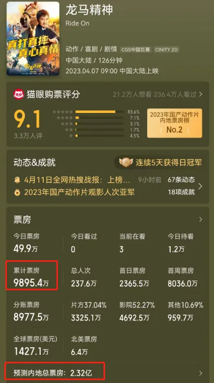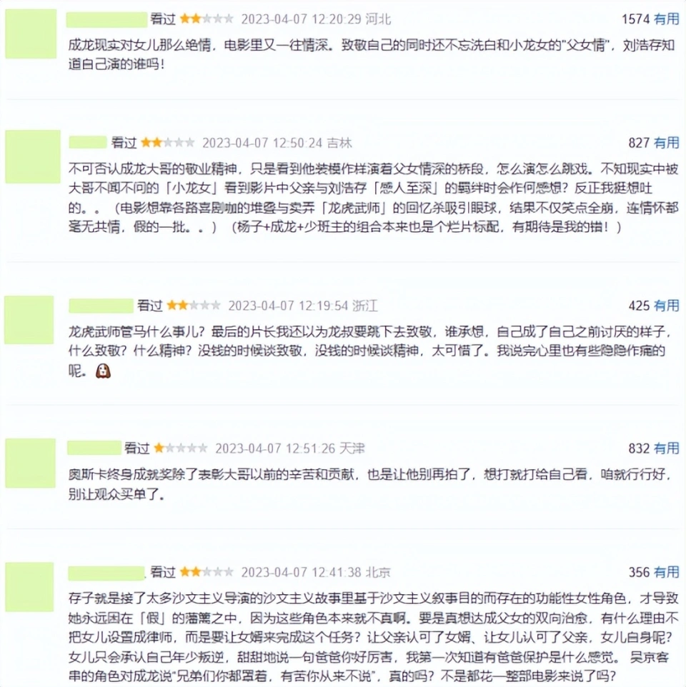 《龙马精力》上映六天票房没到一亿,在浩繁粉丝前来“力挽狂澜”的环境下,豆瓣评分过了合格线。 成龙、吴京两人坐镇,整部影戏累计猜测票房仅有两亿,大哥这回又“倒”了。 品评也是南北极分化严峻,各人纷纷表现冲着大哥去看,可剧情却大失所望。 从曾经万人追捧、国际着名的功夫巨星,到出演这种烂片被观众评价“想打就打给自己看”。 为了票子连面子都不要了,真的值得吗? 一、剧情稚子、感情线生硬,这场过家家的闹剧该竣事了靠情怀宣传,靠怀旧卖座,抱着成龙大哥这条大腿,却连重点都抓不住,在影院的我想起之前的放肆宣传真的有点想笑。 “生命会老去,影戏不会”但是成龙大哥挑选脚本的眼光会。 1.毫无亮点、强拼硬凑,父女世纪大息争 能看得出来,杨子导演太喜好亲情线了,好像只要稍微显现雷同亲人之间的情绪,就能让现场的观众哭得感天动地。 好比《你好,李焕英》、《长津湖》以及《人生大事》等等,最容易把握的煽情点。 于是在这部致敬龙虎武师精力的大戏中,他没有选择刻画不离不弃、嘴硬心软的妻子形象,而是拿住了父女线。 实在也不是不可以,单亲家庭铸就女儿脆弱敏感的性格、对执着于不讨喜工作的不明白等等。 由亲情升华到对龙虎武师家人的奉献精力,更全面地显现武师一家的服从。 可《龙马精力》中的女儿偏偏是作天作地的。 前一秒和父亲你好我好,在没有详细深刻的来由下忽然变脸,仇深似海。 还没咋地呢,又忽然世纪大息争,强行给观众塞了一嘴煽情,还没开始嚼又让人吐出来了。 通过让女儿这一形象不符合逻辑的活动,来突出老罗心田的抵牾和煎熬,这种浮于外貌的形貌完全没有到达让人共情的水平。 实在刘浩存的演技也不算出戏,但是人设太不讨喜,太影响主线。 2.人马感情不真,打戏有看点但没逻辑 在看《龙马精力》时想到了杨子导演之前拍的《痛爱》,这种能吸引到爱宠物的“主子”来观看,必须要到达对动物真的爱。 确实,从《龙马精力》前期宣传来看,各人是真的很喜好赤兔这匹马,乃至在告竣将马带走时,各人潸然泪下。 可正片到临,我是真看不出老罗与赤兔相伴半辈子、相依为命那种亲情。 起首,成龙年总是到位的,套路式的互动有笑点能看出年总是真喜好这匹马。 可这种感情根本就不是仅仅拍戏几个月才造就出来的。 整部影片强拉出来的泪点,能看出杨子只是使用马来制造所谓的看点,而不是用真情暴露感动观众。 老罗要真刀真枪上场演戏,却连彩排都不消,这种自己搏命的精力大概很感动,可对马的伤害是不可预见的。 换成狗大概猫,陪自己半辈子,就由于自己对演绎奇迹的热爱,就要它来遭受云云大的风险,连彩排都不试试,这种感动到底是感动别人照旧自我感动。 影片中大段人马互动掖掖仪外貌的相处,在我看来还不如《我和我的父辈》中吴京、吴磊与马的那种感情显现得到位。 只管已经69了,可成龙的打戏照旧照旧出色,四两拨千斤的招式都能看出深厚的功底。 但剧情完全撑不起云云真实的打戏,调戏女儿、讨债偷马都非常生硬,乃至人物都要问一句:我们为什么要打呢? 3.三种画风的三位主演 真的不明白,既然要致敬龙虎武师又为什么请刘浩存和郭麒麟来演。 如果郭麒麟演的是徒弟也还能有圆的余地,偏偏还让刘浩存和郭麒麟来组CP。 强行增长笑点就强行给郭麒麟安插进来。 成龙的感情都非常到位,可大哥跟刘浩存相差46岁,无论是外貌照旧年事都与父女设定差距极大。 当大哥表现出父亲的宽容和爱意,刘浩存就像是另一个天下的人,她演技中规中矩但与成龙的演出风格完全差别。 更别说郭麒麟了。 这个脚色美满是故事主线之外的人物,强拉硬拽成三番进来贡献那么点笑点,还得被观众吐槽,这是干啥呢。 撤除一水假大空的五星好评,从网友的评价中也能看出各人对影片的理性讨论。 天赐良机的情怀却拍不出重点,只能靠追捧大哥来宣传影片,恐怕只能斲丧成龙大哥的好口碑。 二、为了票子不要面子,7年9部烂片观众该死被割韭菜吗?内娱唯一继承起一声“大哥”的演员,成龙这辈子真的没白活。 50多年前就开始了演艺生活,靠自己的真功夫硬是在好莱坞闯出了一片天。 1.为内娱现状鸣不平,成龙也不得不低头 成龙的敬业是没得说的。 在网络不发达的期间,成龙一系列影戏已经火到人尽皆知,告急刺激的动作戏加上笑点频出。 既新颖又抓人眼球。 肯受苦、敢拼敢闯,让成龙直接被国际承认。 然而随着期间的发展,更新换代严峻的演艺圈也早已换了一片天。 有流量、有人气没有一点职业精力也能爆火,刮破手也大喊小叫,乃至还能得到全网好评。 云云搞笑的事变竟然也能成真,成龙吐槽也不是没有原理的。 其着实2012年《十二生肖》上映后,他已经公开表现自己即将隐退,不会再拍动作片。 该影戏其时票房一飞冲天,直接成为其时影视圈的佼佼者。 可几年事后,成龙照旧不得不低头,与流量互助。 前有《神探蒲松龄》被骂上天,后有《急先锋》扑得无声无息。 这就是现实吧,就算明知道会打脸,照旧得硬着头皮上,大概也真没想到观众还真不买账。 在吴京大红大紫后,成龙也在镜头前大发感慨。 “我花了几十年才凑了两百多亿,他四部戏直接两百多亿了。” 确实酸,不但有对吴京“安若泰山”登上票房冠军宝座的酸,尚有对自己前半辈子的酸楚。 于是这次《龙马精力》吴京鼎
