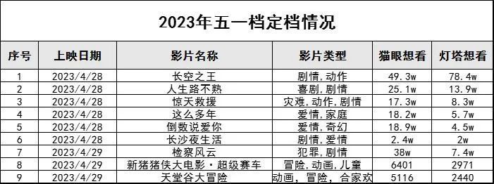 犀牛娱乐原创 文|小福 编辑|朴芳 大盘回暖的速率,着实并没有我们想象中那样快。 春节档竣事以来,影戏市场进入传统冷档期。只管有不少不错风致的项目上映,但仍旧暴袒露了市场履历过长时间低迷后难以敏捷复原的酷寒。 而半个多月后的五一档,大概是带热上半年大盘,为暑期档预热的最紧张机遇了。 五一档是每年春节档到暑期档之间容量最大的档期。纵览已往五年五一档情况,档期总产出量呈上涨态势,固然这个趋势的紧张影响项也在于档期长度。像档期票房汗青第二高的2019年,五一档共计4天,革新影史高点的2021年,五一档则占据了一个五天小长假。 本年与2021年情况相近,五一节又赶上了一个五连休,毫无疑问,这代表着该档期将拥有更大的市场容量。 从如今的定档阵容来看,本年五一档还优劣常值得被看好的。 本年五一,五天九部 制止4月12日,即将在五一档上映的重点影片共计九部。 和近两个月上映的很多影片相似,本年五一档中也搜集了多部客岁积蓄下来的项目。像《长空之王》《惊天接济》《查察风云》这三部影片,此前都履历过定档再撤档。爱情片《倒数说爱你》,最初也筹划在客岁年内上映。 这些看起来不敷“新”的项目中,不乏对准过暑期档、国庆档等重磅档期的热门影片,无形之中进步了本年五一档的团体气力。 现阶段在五一档热度领跑的《长空之王》最初定档客岁国庆档,该片为国内首部聚焦试飞员群体的影片,在公布撤档之前,该片的映前热度和预售结果都高居同期第一位。而在来到本年五一档的新战场后,《长空之王》的热度仍旧助推该片稳坐同档期头号种子位置,如今猫淘累计想看人数高出120w。 劫难动作片《惊天接济》同样也履历过定档撤档,仅看题材和演员阵容,过往市场同类项目浩繁,该片并没有显着上风。不外该片是五一档最早一部开始点映的项目,从首批点映都会、时间范围来看,影片对于自身的内容风致,特殊是在下沉市场的渗出本事还是有肯定自大的。 作为五一档唯逐一部笑剧,《人生路不熟》稳赚范例刚需加成。该片由易小星执导,他的上一部笑剧作品《洗浴之王》曾在2020年贺岁档得到高出4亿票房结果。如今来看,依赖范例上风,《人生路不熟》在五一档或有肯定根本盘,而片方也比力早就开始动作,如今是除了提前点映的《惊天接济》之外唯逐一部开启预售的五一新片。 不知从何时开始,爱情片也成了五一档的固定班底。尤其是在疫情后这两年,2021《你的婚礼》、2022《我是真的讨厌异地恋》两部爱情片稳稳称霸五一档。本年五一档,仍旧少不了爱情片的身影。 本年五一档搜集了《倒数说爱你》《这么多年》两部爱情片,即将上演同日对打。此中《倒数说爱你》最初筹划在客岁上映,后在本年3月公布进入五一档,《这么多年》则是一部典范的以小博大光线芳华片。 这两部影片均由有肯定观众认知度的青年演员主演,题材方面,《倒数说爱你》的故事融入了肯定奇幻元素,《这么多年》则是比力传统的芳华爱情项目。以是只管二者范例相近,细分定位还是有所差异。 《长沙夜生存》是五一档里相对特殊的一部作品。光看片名看不透卖点,光看剧情又很像是一部拼盘故事片,但可以确定的是,领衔主演一栏巨大的“长沙”,以及宣传阶段浓重的都会卖点,已经让这部影片富足特殊了。 耽误一年上映的《查察风云》也终于将揭开秘密面纱。作为国内少有的查察官题材项目,该片在本年五一档补全了犯罪范例片和主旋律影戏的空缺。 末了另有对准低龄观众的《新猪猪侠大影戏·超等赛车》《天国谷大冒险》两部动画,只管在前期热度和IP势能上都比力弱,但思量到档期宽松,找到目的受众群体的压力并不算大。 假如严格按照五一档市场容量来看,五天九部新片的数量已经富足紧凑。但思量到疫情后这几年各个档期项目扎堆都比力严峻,乃至是客岁五一档大撤档之前也有过十部新片的阶段,同期对比下来,这戋戋九部重点新片,一点都不算浮夸。 最“平衡”的五一档 而除了最直观的新片数量之外,我们从这份片单读出了更积极的市场信号。 一是丰富的项目范例。 包罗疫情前在内,本年五一档应该是近五年来新片范例最多元的一年。军事、动作、爱情、犯罪、动画、家庭,这些丰富的范例让观众选择更加自由。加之大部门新片都是中等体量,没有重量级项目的克制,自然也就让更多新片得到了富足的市场空间。 二是富足大的受众差异。 在丰富的项目范例背后,是各异的影片卖点。像是由王一博主演,曾在客岁领跑国庆档预售的《长空之王》,在热度上一骑绝尘。而提前半个月开启较大规模点映的《惊天接济》,则打出了口碑牌。 档期唯一笑剧《人生路不熟》、在五一档屡战屡胜的爱情刚需《倒数说爱你》《这么多年》、主旋律《查察风云》、范例新奇的《长沙夜生存》、引进国产各一部动画《新猪猪侠》《天国谷大冒险》……项目虽多,但细致看下来,这些项目专注的垂直范畴各有千秋,有望形成较为抱负的差异化竞争。 这种“平衡”的档期排布,可以更大水平的放大一部影片的市场潜力,实现多片共赢,对整个大盘带来利好。履历了市场动荡的三年,我们已经好久没看到过如许良性的档期分布了,这亦是市场在重回正轨的有力佐证。 如今为数不多的压力紧张来自外部。 2017年的《速激8》、2019年的《复联4