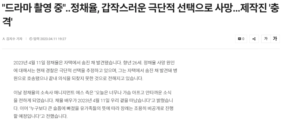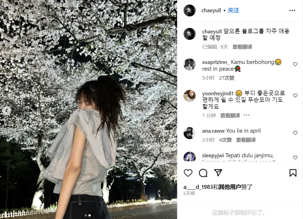 4月11日,韩国娱乐圈又传噩耗,韩国女星郑彩律被发现死在家中,年仅26岁。而据韩媒最新报道称,警方在颠末一系列的观察之后,开端推测殒命缘故起因好坏常选择,也就是自尽。 郑彩律所属社工作职员S开始确认了郑彩律去世的不幸消息:“本日,我们不得不通报一个非常令民气碎和不幸的消息,女演员郑彩律已经于2023年4月11日脱离了我们,葬礼将根据死者眷属的意愿安静和私密地举行,他们比任何人都更加心碎。盼望敬业的演员彩律可以在温暖的地方安息,祈求逝者一起走好。”,所属社也夸大:“我们恳请各位不要传播谎言和矫饰的报道。” 最新报道指出,郑彩律被发现昏迷在家中后,曾被告急送往医院,但终极却无力回天。对于郑彩律的死因,警方考量好坏常选择,现在正在做进一步的观察。 知恋人则透露,郑彩律生前患有很严肃的烦闷症,通常里她却从不体现出来,总是嘻嘻哈哈。在各人的眼中,郑彩律反而是一枚开心果。长此以往,导致她的烦闷环境越来越严肃,终极走上绝路。 值得一提的是,郑彩律的外交账号不停保持着更新。就在4月10日,也就是她去世的前一天,还分享了一段本身作为广告模特的短片,配文:“让我们笑吧”,短片中,郑彩律身穿蓝色外衣,妆容风雅,笑脸非常辉煌光耀,令人更觉唏嘘。至于这是不是她想嘱咐亲朋们的末了话语,盼望家人不要伤心,不得而知。 翻看郑彩律的外交账号主页,通常里,她经常会晒出各种美照,就在3天前,她还分享了一组生存照,照片中,郑彩律手拿一瓶酒,站在电梯内对镜自拍,心情呆萌可爱,完全察觉不到有什么异样。 别的一张则是喝了一口酒之后,有些痛楚的心情特写。 尚有一张是好坏侧颜照,看起来略显冷静和伤心。郑彩律死后的配景大概率就是自尽时所在的家中。 郑彩律手里提着一瓶酒,给本身的小脚丫特写,这也太可爱了吧。单单从照片来看,真的会以为郑彩律好坏常热爱生存的小女孩。 而在6天前,郑彩律更新的樱花树下照片配文中写道:“以后我要更频仍地更新博客了”,遗憾的是,以后亲朋和粉丝们再也没有时机看到她的更新了。 据悉,郑彩律去世前正在参演新剧《不大概的婚礼》,该脚本年2月中旬开机拍摄,接到郑彩律去世的噩耗后,该剧拍摄临时制止。 包罗导演和演员在内的剧构成员对此也感到非常震惊,一位负责人受访时说,“现在,拍摄取消到12日,具体环境正在商讨中,突然接到噩耗,各人也都没故意情继承工作” 郑彩律出生于1996年9月4日,2015年,以steam娱乐旗下模特身份出道。2016年,郑彩律到场On Style模特生存节目《妖怪的RUNWAY》而被人熟知。 2018年,郑彩律开始转型做演员。初次亮相柳承修和崔汝真主演的影戏《深渊》中,片中饰演潜水锻练施言。 别的,2020年播出的电视剧《僵尸侦察》中,郑彩律饰演警官裴允美一角。 郑彩律颜值高,身材好,五官非常风雅,气质很清纯甜蜜又阳光。 网友们纷纷以各种情势发声追悼郑彩律,其外交账号末了一条动态品评区中,粉丝们写道:“请去一个好的地方”“我们会想你的”“安息吧” |