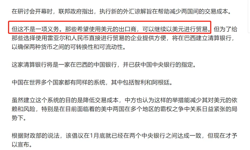 巴西央行拥有高出3000亿美元的外汇储备,这内里:美元及其资产占比为80.42%,继承位居榜首,且上风巨大;人民币及其资产占比5.37%,升至第二名;欧元占比4.74%,降至第三名。 看到这则消息,信赖有一部分网友会严肃地品评南生,这无疑是在推许美元,打击大众信心。在他们眼里,巴西正在积极倒向人民币,是环球去美元化办法前锋,人民币咋能只有这点比例呢? 尚有一部分网友会感到很开心!常常理性观察国际金融的网友都根本相识美元、欧元在环球的职位。特别是美元,许多发展中国家都渴望得到。但这个意愿却难以得到满足,常常闹出“美元荒”变乱。 如今,人民币在巴西的外汇储备中已击败了欧元,升至第二名。固然占据的市场份额还相对有限,但这个效果是一步一步走出来的。不积跬步无以至千里,我们中国人固然应该感到高兴。 南生,看到这则消息有何想法呢? 在本年4月初的时间,南生看到了这则消息灵敏写了一篇批评文章,标题是《签了协议,更要强化落实!可用人民币,置换巴西、阿根廷的美元债》,提出:与签订协议相比,积极落实是更告急的观点。 看到这则消息,为何要发起“积极落实协议呢”?这是由于:我国与巴西签订的“中巴两国商业以本币直接结算,低沉对美元依靠的协议”只是拓宽了巴西外贸企业结算路径,不是取代之前的结算路径。 在中巴两国以后的商业中,是“可以直接利用本币,不是使命”(如下图)——可以利用人民币,也可以利用巴西雷亚尔,但不是必须要利用,那些还盼望利用美元的出口商,他们可自由地利用美元。 与签订协议相比力,积极美满与该协议相干的配套办法,强化落实的效果才是根本。这一点,我国有着多次的履历辅导。以中韩两国签订的钱币互换协议为例,已到达了4000亿元的级别。 而且我国还与其他许多国家签订了钱币互换协议,从协议涉及到的金额来讲,人民币已成为环球最大的互换钱币。但真正有用落实的比例偏低,国家外汇管理局外汇研究中央就曾提到这个不敷。 他们在文章中指出:我国与韩国之间的双边商业结算中“美元占比在90%左右”,韩国企业没有太大的动机利用人民币,这导致之前签订的钱币互换协议启用率较低(如下图)。 但新冠疫情在环球大盛行之后,韩国急需美元,而美国签订的钱币互换协议却灵敏启用,从美国那边得到大量的美元活动性资金。 网友们,签协媾和有用落实是两回事啊!以各人关心的钱币互换协议为例,只有当对方必要人民币时,他们才会启用。而且是必要多少,启用多少;不必要,那就不会启用。 协议上签订的金额,重要是规定了启用上限。如果这个国家的外汇富足,外贸企业不愿意或没有动力利用本币,那这个协议更多是“象征意义”。 鉴于此,南生才撰写了《签了协议,更要强化落实!可用人民币,置换巴西、阿根廷的美元债》这篇文章,目的就是盼望能动员巴西企业积极利用人民币,储备人民币,动员人民币国际化历程。 要搞清晰,其他国家为什么要持有美元 其他国家、地域持有美元的缘故原由有许多,但此中一个告急缘故原由是:美元及其体系,是当今国际金融市场向导者。许多人更是把美元称作“美金”,持有美元资产是多国的优先选择。 多国优先持有美元资产的别的一个缘故原由是“他们的债务也重要是美元”。为了还债,为了低沉出现债务危急的几率,那也要持有富足的美元才可以啊——形成了闭环,必要突破此中的某个链条。 用人民币,置换其他国家的美元资产,别人会不答应。但可以从美元债入手,特别是当他们面临即将到期的美元债压力时,我国借给他们人民币,并发起他们把拿到的人民币来和我国兑换美元。 他们再把拿到的美元,去还债。我国外汇储备环球第一,对外商业长期逆差,拥有大量闲置的资金——必要有用利用起来。 这么一通利用后,其他国家的一些美元债,就变成了人民币债务。人民币债,要比美元债限期更长,利钱更低,给这些发展中国家镌汰还债压力。 接下来就是怎样让这些国家还钱了。南生之以是选择巴西和阿根廷试点,是由于这两个国家和我国的外贸,他们处在顺差职位,可以赚到富足的人民币嘛。 有了人民币债务的压力后,他们在和我国的商业中优先担当我国企业付出人民币,就形成了现实动能,协议就会有用落实。有了富足的人民币,才气提拔人民币在环球外储中的份额嘛。本文由南生撰写,无授权请勿转载、抄袭! |