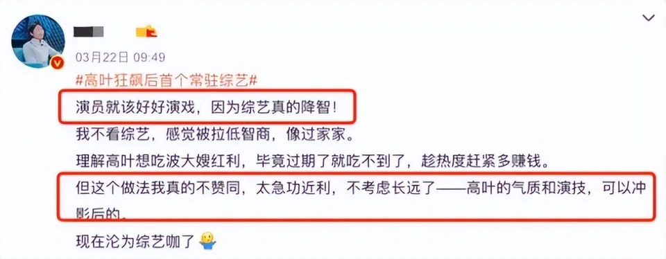 《狂飙》堪称本年的剧王,一部戏,捧红了剧中许多演员。 此中,张颂文、高叶、苏小玎格外引人注目,他们凭着在剧中的体现,一度成为了热搜上的常客。 许多名局面,也让人回味无穷。 比如,高启强和大嫂初相遇,两人在情侣大街相遇的那一场戏。 张力十足,看得人血脉偾张。 而安欣用警戒线逼退高启强的那一幕,也堪称经典。 一条线,划出了正邪之间的对立,高启强和安欣之间剑拔弩张的氛围以及两人的体现,看多少次也不会烦。 一镜封神。 饰演高启盛的苏小玎固然是个副角,着墨不多。 但凭着疯批的形象和飘忽的走步,直接成了热门,他本身大概都没想到会如许走红。 不浮夸的说,这三人在很长一段时间里险些霸屏。 到现在,固然这部戏播出已经2个月了,但热度仍旧不减,只是三人的差距却越来越大。 01、《狂飙》中,大嫂高叶的人设极好,加上高叶和导演制片关系也不错,给了她充实发挥的时机。 她把这个脚色塑造的有血有肉。 以一己之力,成了内娱少有的“嫂系尤物”。 一样平常生存里,她开朗的性格也圈粉无数。 在剧中她的发型,引得许多女孩纷纷效仿,但和一样平常明星说本身没怎么积极做造型差异,她体现,本身这美美的造型是费了许多力气的。 属于次抛,也就是用一次就要重新整理一次。 作为剧中极为抢眼的女性脚色,高叶深受广告商的喜欢。 在《狂飙》播完没多久,许多广告就找到了她。 她的经纪人两个手机,每个手机天天都要充四次电,单是为她接洽工作就要连轴转的倒班。 她一口吻接了6个代言。 固然和苏小玎一样,她也没能免俗的接了游戏代言。 但无论是拍摄程度照旧代言的程度都比苏小玎高多了,观众也难过的没有反感。 但这此中的隐患也显而易见,她接代言险些没有观察期,都是直接就官宣。 如许假如产物格量大概其他有题目,就很容易影响她个人形象。 除了广告她还一口吻的拍了不少时尚杂志封面。 要知道,这在从前都是大花才有的报酬。 而她凭着一部戏就能一飞冲天,确实不易。 她的声音也被导航用了,听说下载量很高。 尤其是在微博之夜,她以当红的身份坐到了第二排,已经分析了她的职位。 本以为她的口碑能不绝好下去,没曾想,她居然这么快“翻车”了。 因由营销号说她在感情上是个小白,由于工作繁忙,到了35岁不绝没有谈过爱情。 高叶看到了这个宣传,本人亲身了局辟谣。 并体现,说她35岁还没爱情,属于骂人了。 高叶此举大概是不想让本身被定为在小白花上,但没想到却不测的翻车了。 但没想到,35岁没爱情的人不少。 她这个言论一出,直接被许多人评价为情商低,刻薄。 之前的口碑碎了一地。 但最关键的是第二点。 走红之后,她的运动一个接一个。 且不说各大颁奖仪式,就是为品牌站台也没有停过,这让人有些担心,她能不能静下心来好好演戏。 而后,有传出了她接了综艺《芳华周游记》的消息。 这是一档常驻综艺,到场了就意味着演员会长期袒露在观众面前。 关于演员接综艺,争议不绝很大。 许多演员都体现,在综艺里,演员的秘密感没了,以后演戏观众很难有代入感。 郝蕾尚有包罗《狂飙》的主演张译都明白体现过绝对不接综艺。 冯小刚在好久之前的一次座谈上,也明白提出了演员不要过多到场综艺,伤害演技。 颜丙燕也说过,演员不应该上综艺,接代言去挣这些块钱,由于挣了以后,就很难静下心来创作了。 之前的孙红雷、黄渤,尚有邓超等都碰到过综艺形象和演技相辩论的题目。 尤其是邓超,在接综艺之前,可以说是本地中生代里演技和口碑的top级。 但常驻综艺后,他的定位成了笑星。 纵然有《烈日灼心》那么炸裂的演技打底,口碑仍旧没有维持住。 许多人也给了演员选择,要么当综艺咖,要么去演戏。 而高叶的情况则更为突出。 许多人称呼高叶为“大嫂”,说到底是喜欢她剧中的形象,而不是她本人。 她个人的形象并没有太过突出吸粉的地方。 到场综艺大概有大概会自曝其短,但更紧张的是有大概会影响她以后的脚色塑造。 实际上,像如许由于一个脚色走红,但后续没有好演出跟上的红,是很难长期的。 曾经的张小斐,与本日的高叶何其相似,差异的是,张小斐尚有国民度极高的小品打底,但爆红之后,现在已经归于寂静。 从交际平台上来看,高叶的热度也是直线降落。 从最早一个动态百万点赞,到现在回归平常程度,乃至还不如素人的大号,也分析她还没有到完全本身就能圈粉的地步。 云云种种,在加上迩来的讽刺事故,自然让人对她的未来有了些担心,以为她飘了,急功近利。 作为娱乐圈的老人,她的团队很夺目。 现在她也有新戏正在拍,对手照旧林雨申。 林雨申的妈妈是李晓婉,干妈是李少红,在圈内也是闻名的星二代。 他参演的作品,质量都不错。 只是以高叶如许的运动密度来看,她大概率会步其他综艺咖的后尘了。 02、苏小玎的成名最不测,但他的翻车也最不测。 不测走红后,他直接在捞金的路上开启了“狂飙”模式。 但让人不解的是,他的团队太不爱惜他的羽毛了。 先是去了小杨哥的直播间,扎着长发,扭捏作态,一派网红作风。 舞蹈也是搞怪到有些猥琐了。 斲丧的也是他剧中的“嚣张走位”那一段。 可他倾销的都是垃圾袋、剪毛器一类的东西,非常没档次。 而后,他又录制了游戏的代言。 制作粗糙不说,用的也都是《狂飙》内里的梗。 “只要是高家看上的东西,臭卖鱼的怎么了”。 