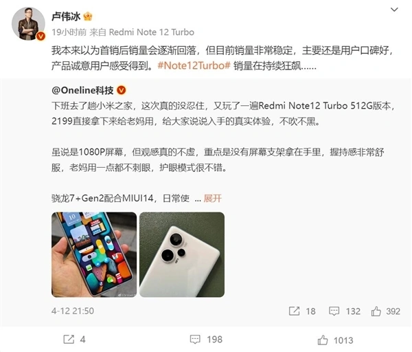 快科技4月14日消息,小米团体卢伟冰体现,我原来以为Redmi Note 12 Turbo首销后销量会徐徐回落,但现在销量非常稳固,紧张还是用户口碑好,产物诚意用户感受得到,Note 12 Turbo销量在连续狂飙。 该机起售价是1999元,顶配版16GB+1TB版本首发得手价是2599元,在同档位极具竞争力。 该机首发搭载高通第二代骁龙7+移动平台,这颗芯片的综合能效体现险些和骁龙8+持平,性能体现相称不错,再加上Redmi的狞恶引擎调校,其综合体现堪比旗舰。 经测试,Redmi Note 12 Turbo在《王者光彩》120帧高清实测中,该机均匀帧率到达了119.7fps,帧率颠簸相称小,且没有低沉画质或亮度的小动作,游戏体验直接拉满。 别的,Note 12 Turbo还配备以超扩散导流VC为焦点的散热体系,其VC面积达3725mm,为Note系列最大。确保性能连续稳固输出,不降频。 参数方面,Redmi Note 12 Turbo采取OLED柔性直屏,利用COP封装工艺,下巴2.22mm,最窄边框1.42mm,电池容量是5000mAh,支持67W有线闪充。 |