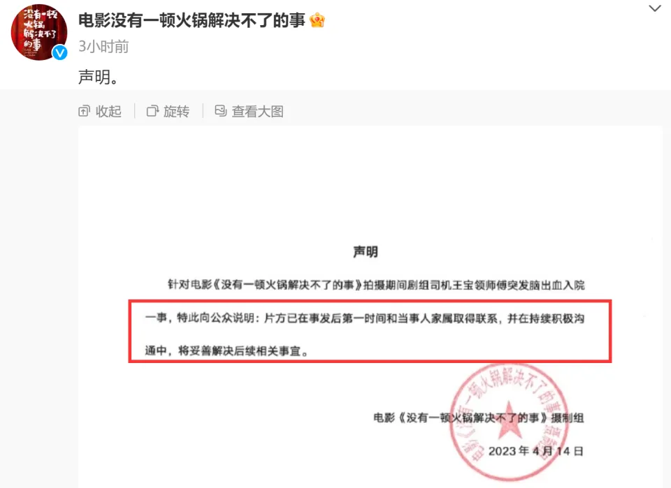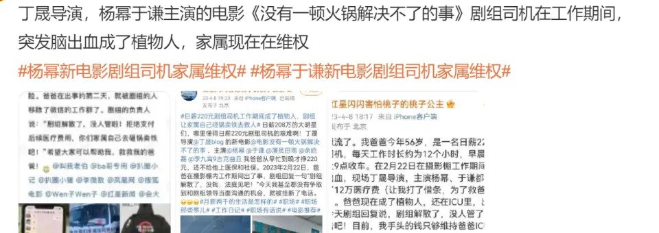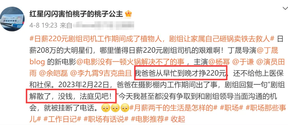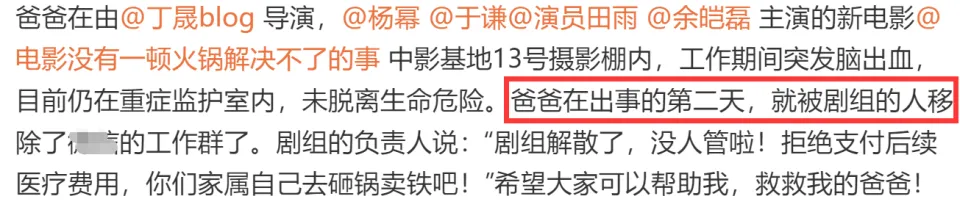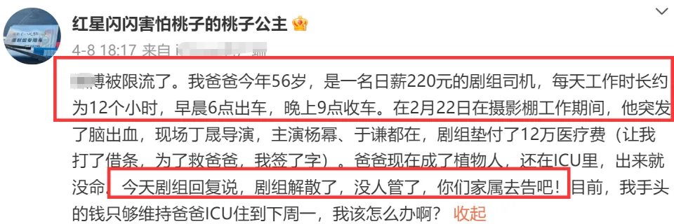 4月14日,多家媒体报道了一则令人痛心的事,杨幂与于谦互助的新影戏《没有一顿暖锅办理不了的事》剧组失事,一位叫王宝领的司机突发脑溢血变成了植物人,可剧组却拒绝担责,让无数人感到愤怒。 王宝领的女儿从四月初开始发文,想借助舆论的气力为爸爸维权。 《没有一顿暖锅办理不了的事》于2月8日开机,其时杨幂看起来略显干瘪,她和于谦很少互助,阵容令人等待。 一样平常环境下,良好的影戏拍摄时间总是比力长,必要泯灭许多的时间和精神。然而,这部影戏却在三月就传出了告竣的消息,不外片方还没有官宣告竣。 如果一部影戏制作的速率云云快,那么每个工作职员肯定是遭受着高强度的工作内容。剧组专用司机王宝领的女儿说,爸爸在剧组天天都工作12个小时,早出晚归,非常辛劳。 2月22日,王宝领在剧组突发脑溢血,剧组垫付了12万医药费,但让眷属打了借单。 王宝领年仅56岁,脑溢血事发突然,固然他很快被送到医院去救治,但在icu救济了几天后,照旧不幸成为了植物人,之后眷属要用巨额的医药费维持他的生命体征。 王宝领的日薪只有220元,他是百口的经济支柱,失事后家人们想与剧组沟通,但剧组工作职员却非常狂妄地说这部影戏已经拍完了,剧组也驱逐了,根本没有钱,还说:“法庭上见吧!” 更可气的是,王宝领失事的第二天,就被移除了群聊,剧组好像恐怕影响到他们的口碑,还让眷属本身去砸锅卖铁救人。 退一万步说,就算王宝领不是工伤,他们也不能用云云淡漠的话伤害他的眷属,更何况王宝领是在高强度工作下突发疾病,很有大概就是工伤,剧组理应赔偿。 舆论发酵后,片方发声明称他们已在第一时间接洽了王宝领的眷属,正在协商中。 盼望剧组能正视题目,不要滥杀无辜,更不要躲避责任。 #杨幂于谦互助新影戏#、#剧组#、#植物人# 作者:栀栀 责编:樱桃 本文由盖饭娱乐原创,欢迎关注,带你一起长知识! |