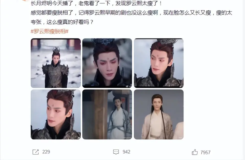 迩来,电视剧《长月烬明》正在热播中,男主罗云熙却由于太瘦成为几度出圈,成为热议的重点。 关于他的品评也出现了非常严峻的南北极分化,有人以为他已经瘦脱相不忍直视,但也有网友以为他完善表明出脚色的“美强惨”。 罗云熙自己采访时说,他本人非常能吃,不绝想要增肥,还发了增肥食谱,但效果并不佳。 在剧中,罗云熙扮演的男主由于从小就被天子父亲送到帝国当人质,恒久吃不饱饭,被虐到营养不良。 某种程度来说,瘦弱是符合男主人设的,但罗云熙过于瘦削的身段,却让人有些出戏。 他不光双颊严峻凹陷,脸长到好像鞋拔子,而且体态也太过骨瘦如柴,戏服穿在他身上松松垮垮,更显得头大身子小,以至于被网友吐槽他是“风干螳螂”。 原来罗云熙扮演的是魔尊,然而看着穿在他身上过于肥大的衣服,总有种小孩扮大人的错觉,那里还能感受到魔尊应有的霸气。 与女主白鹿同框搭戏时,原来体型正常的白鹿却在他的陪衬下,看起来非常魁梧有力,两人一对比,完全有种性转感,画面非常突兀尴尬,毫无CP感,更像是“姐妹花”。 原来未开播前,许多人对于《长月烬明》很布满等候,罗云熙的粉丝也以为其偶像大概依附此剧大爆,乃至飞升成为顶流。 但实际眼前,罗云熙非但没有得到更好的发展,反而成为群嘲对象,乃至有不少人以为曾经润玉滤镜稀碎一地。 实在,从前罗云熙固然也瘦,但是给人视觉感是正常的。 2012年,他和谭松韵相助了影戏《最美的时间遇见你》,在内里分别出演男女主角。这也是罗云熙第一部男主戏。 在影片中,罗云熙的皮肤尚有些黑,脸上尚有些婴儿肥,还是布满芳华气味的,扮相也很符合大弟子。 厥后,罗云熙依赖《何以笙箫默》中青年何以琛在娱乐圈有了名气,固然罗云熙骨架能看出比力瘦小,个头也不高,胜在形象阳光康健,因此深得不少人的喜好。 他也借此乐成迎来自己演艺奇迹的第一个高峰,劳绩了各种戏约,此中不乏古装剧,不外造型却有些一言难尽。 在《上古情歌》中,他扮演的赤云显着是一名战神,但是罗云熙的肩膀太窄,根本撑不起衣服,幸好脸上肉感很足,看起来违和感少些。 直到2018年,随着《香蜜沉沉烬如霜》热播,罗云熙乐成依附扮演润玉一角,一跃成为各人心目中的古装男神,奇迹也乐成到达顶峰。 在剧中,固然润玉是男二,但是脚色形象很饱满,前期人如其名,真的是温润如玉,后期固然霸气狠绝,却让人恨不起来。 润玉时期的罗云熙,脸部线条非常流畅,脸颊饱满,看起来就给人感觉真的是 “公子世无双,陌上人如玉”,非常仙气飘飘。 有网友形容说:“笑的时间温柔如水,悲的时间自带三分薄情,这种破碎感让人难以释怀。”可以说,其时润玉时期的造型完全就是罗云熙颜值顶峰时期。 大概是以为自己找到了颜值最佳状态,罗云熙更加注意体态,没想到却在瘦的路上一去不复返。 在《半是蜜糖半是伤》、《良言写意》等多部剧中,罗云熙就曾多次由于太瘦而被诟病。由于不绝瘦,曾经饱满圆润的脸颊开始日渐棱角分明乃至出现倒三角,加上自己骨架小肩很窄,让人有种头大身子小的既视感。 这次在《长月烬明》中更是显着,固然还是罗云熙,造型颜值显着丑了不少,全然无力气感,看得只让人出戏。 在许多人看来,曾经的罗云熙也算是有演技有颜值的范例,怎么就离爆红差一口吻呢? 回顾罗云熙的演艺之路,并不算顺遂,甚职苄些崎岖。 罗云熙的父亲是舞蹈老师,在家庭的影响下,罗云熙从小便练习舞蹈,有深厚的童子功,之后又考上了上戏芭蕾舞专业。 但从上戏结业后,他却由于身高差无法当芭蕾舞演员。芭蕾舞男演员要求至少是180cm,罗云熙却只有177cm,即便他舞蹈功底踏实,也只能遗憾落第。 之后,罗云熙辗转继续了一段时间芭蕾业余班老师,厥后在朋侪发起下,去北京公司当练习生。 2010年,罗云熙和其他两个练习生构成了JBOY3组合正式出道,并推出了单曲《爱的左券书》。然而,组合还没等火起来,就面对驱逐的运气。 随后,他又和此中一名练习生符龙飞组合“双孖JL”组合,并推出了同名EP《JL》。两人一起参加了“声动亚洲”歌唱比赛,在现场体现不错,终极得到了中国区总决赛12强的好效果。 但这个组合寿命也很短,创建不到一年也被拆散了。 单飞后的罗云熙受邀出演《最美的时间遇见你》后,开始正式踏入演艺圈。多年来,他固然出演了无数脚色,然而被人记着歌颂的却只有一个润玉。 拍摄《夏日心跳》的时间,还被骂的狗血淋头,导演直接绝不客气地对他说:“不会演你就归去!” 现在的罗云熙,演技虽说不上是力懦头,但还是有很大进步的。 从籍籍无名到小闻名气,罗云熙拥有本日的效果并不轻易。当年在《香蜜》中由于戏份太多,以至于被男主粉吐槽是加戏咖,还被讽刺该剧应该改名为《润玉传》,他为此遭到不少攻击。 但大概是由于太不轻易,罗云熙也很爱惜每一次工作时机。他自从火了之后,就不绝处于超负荷工作中,即便是疫情期间,仍旧一部接着一部接拍新戏,出席各种商业活动,还出了自己的第二张专辑,根本没有停下来苏息过。 因此,罗云熙云云瘦,一方面大概是由于他曾经刻意保持身段,另一方面则应该是由于他太累了造成的。 不外,任何事一旦矫枉过正。固然能明白罗云熙想要红,想要认真工作的心情,但太过斲丧自己,终极只会把自己累垮,并不能得到渴望的乐成。 以是,清醒一点吧,演员是一个恒久的行业,男
