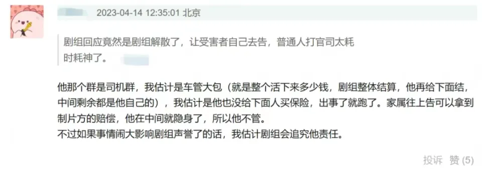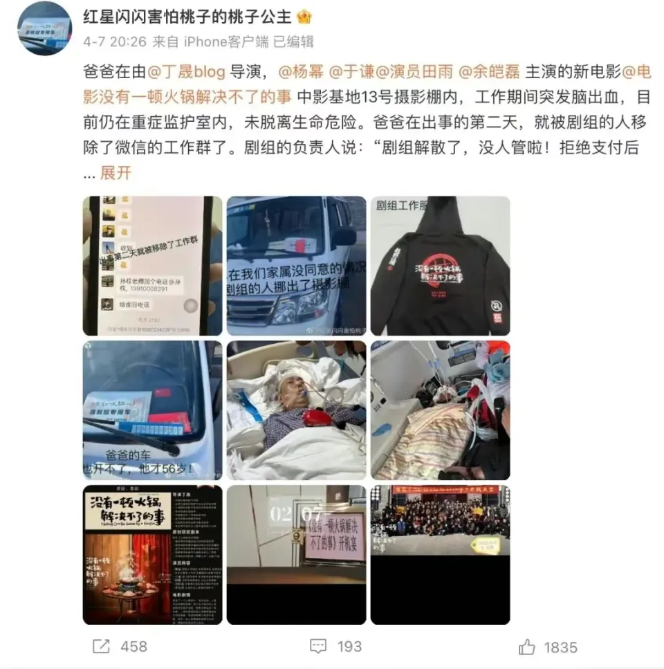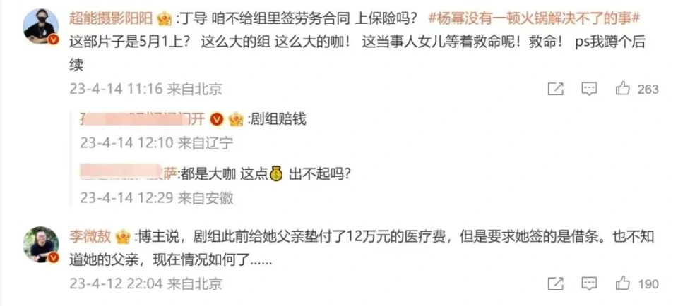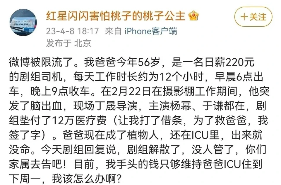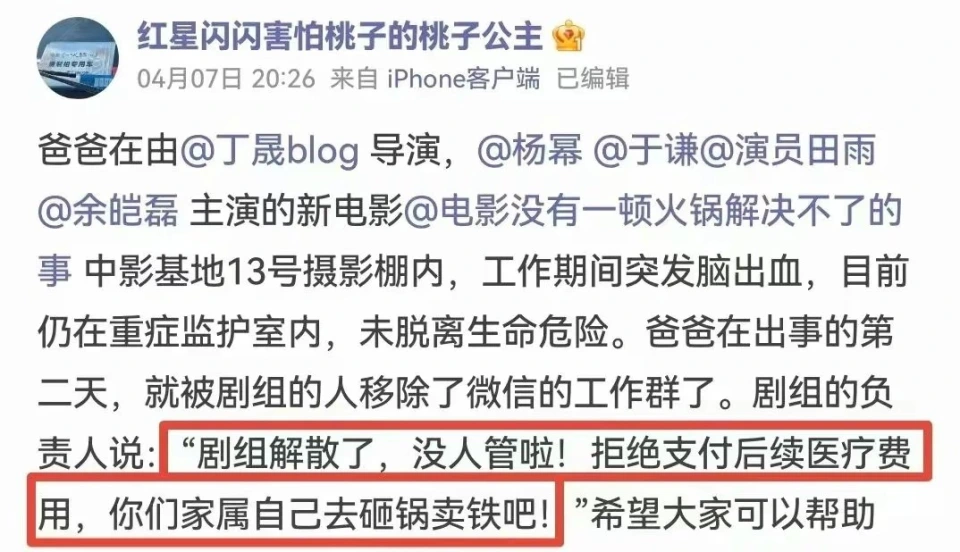 点击右方关注,天天都有圈内大瓜奉上。4月14日,由杨幂、于谦等多人领衔主演的影戏《没有一顿暖锅办理不了的事》剧组惹争议。 该片已经拍摄竣事,将于近期上映,但近两天被爆出,剧组司机脑溢血成植物人,剧组垫付12万让眷属打欠条,后续无人管,引起热议之后 ,部门网友直接反抗了该片。 事故的因由是一位名叫“红星闪闪畏惧桃子的桃子公主”在网上爆料本身的父亲在工作期间突发脑溢血,如今成为了植物人,由于治疗费用太过高昂,小女孩不知该怎么办,只能上网告急涉事剧组办理题目。 据司机的女儿透露,事故发生的时间是在工作期间,但是爸爸失事住院的第二天就被工作职员移除了群聊。 同时,剧组的负责人体现:“剧组遣散了,没人管,你们眷属本身去砸锅卖铁吧。”轻飘飘一句话就要打发人。 剧组工作职员的淡漠还不止于此,就连司机师傅的车子也被剧组移除了拍照棚,第一时间与其撇清关系。 从司机的车上可以看到,车前放着:“摄制剧组专用车”的牌子,阐明该车当时就是在给《暖锅》剧组提供服务。 据司机女儿的透露,本身爸爸失事的时间是在2月22日,当时势发的时间丁晟导演,以及主演杨幂和于谦都在现场,剧组垫付了12万元的医疗费,但让眷属打了借单。 现在司机在重症监护室住着,女儿4月8日发文的时间,称如今手头的钱只够父亲住到下周一,本身不知道该怎么办了。 据悉,司机师傅年仅56岁,日薪是220元,天天工作时长是12个小时,早上6点出车,晚上9点收车,为了菲薄的薪水搭上了本身的康健,从司机日入220元来看,司机师傅的家里应该不是豪富大贵的家庭,病患躺在重症监护室,天天的费用都是一笔不小的开支,若没有保险支持,信赖一个平凡家庭根本无力负担。 在女儿最新发布的微博中,晒出了本身老姑变卖了本身的金饰,拿来了2万元,给本身的父亲看病。 从女儿晒出的照片中看,司机师傅满身插管,躺在病床上,病情并不乐观,信赖后续治疗也是一笔不小的开支。 司机女儿从4月初开始发文维权,以致在导演发布的微博下面留言,但是不绝没有得到复兴,多次发文后,直到本日才引起了部门媒体的关注,让更多人看到了这件事。 此中娱记“超能拍照阳阳”关注了此事,而且扣问导演,有没有给组里工作职员签劳务条约,是否上保险。 除此之外,另有不少大V帮助转发,而且提到了假如用人单位没有给劳动者购买社保,导致劳动者受到丧失的,劳动强度过大,工作时间过长,等因素发病的,单位也要负责。 丁晟导演曾在3月份的时间发布了该影戏的官宣博文,司机女儿在其下方留言但无人问津。 现在,该事故已经引起了浩繁网友的关注,纷纷喊话导演出来回应一下,以致部门网友直言这是一部无良影戏,已经自发反抗起来了。 对于这件事,有部门知晓剧组工作机制的网友体现,大概是剧组外包的司机车队,有个车管同一管理下面的司机,用车的时间剧组关照车管,车管直接分配使命就可以了,看环境应该是车管不想负责,跑路了。 同时提到,假如车管不管的话,眷属往上找,可以找到制片方负责,如许的话剧组也会追究中心人的责任。 不管末了责任在谁,司机在剧组出工伤了,如今躺在医院里成了植物人,当务之急是涉事方出头和谐,资助办理题目,而不是一味的隐身,如许的话影响到了影戏的口碑,还没上映就遭反抗,那就得不偿失了。 【发展路上,感谢关注】 |