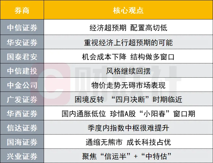 十大券商最新战略观点奇怪出炉,具体如下: 中信证券:经济超预期 设置高切低 经济正在从局部复苏走向全面复苏,不会出现通货紧缩。另一方面,A股正处于整年第二个关键做多窗口,市场感情依然较高,主线轮动已经开始,当前财报季业绩的紧张性显着提升。 设置上,发起在行业板块之间由高位切向低位,重点关注医药、基建和根本金属;同时在数字经济内部由高位切向低位,重点关注与硬件和算力相干的半导体、通讯装备。 华安证券:器重经济上行超预期的大概 猜测后市,预计市场仍将一连震荡上行的中性偏乐观走势。一是3月出口超预期强势,市场对经济预期改善正在被佐证;二是相近一季度末中心政治局集会,市场对于稳增长政策预期大概提升;三是美联储在FOMC集会纪要中提及美国经济阑珊大概性,或表明其已经思量政策转向。 设置上,发起三条主线:一是受益经济上行超预期大概的可选消耗品白酒、医疗服务、医疗美容和扮装品和地产链卑鄙家具用品、家用电器、装修装饰;二是尚未被市场定价但复苏良好的出行链条,包罗航空机场、旅馆餐饮和旅游及景区;三是“数字中国”与AI商用双轮驱动下TMT财产行情,包罗直继续益的盘算机、通讯和传媒,以及新需求叠加周期转正将迎来扩散行情的电子。 国泰君安:时机本钱降落 结构做多窗口 现在股票仍处在结构做多的窗口,2023年更多的是一个底部抬升、市场中枢上移的过程。上证3400不会一挥而就,必要反复和充实换筹的过程。 1)继续看好股价调解充实、红利预期见底,微观筹码出清,且中期维度受益周期性复苏和技能创新板块,继续看好低位发展:医药(创新药),电子(半导体/消耗电子)。2)在传统范畴中关注受益于复苏、一季报有望超预期的发展性的细分:啤酒/食品/出行链,以及受益于中特估+类债资产的重估:构筑/化工。3)国内数字化政策+外洋创新大周期,公募团体低配,中期财产大主题。关注行情轮动:盘算机(数字经济)、通讯(数据要素)、传媒(影视/游戏)。 中信建投:风格继续回摆 市场结构的再平衡准期举行中,主题热度有所降温,固然代价等滞后指标偏弱,但3月份的出口和信贷数据均超预期,维持经济处于慢复苏趋势中,且近期存在政策进一步加码助推大概。 当前顺周期相对收益和估值均处于较低程度,短期相对吸引力上升。因此维持短期设置适度平衡,中期科技主线判定。行业关注:半导体、医药、新能源车、构筑、地产链、游戏等,主题关注:国企改革。 中金公司:物价走势无碍市场体现 关注三条主线 经济复苏周期仍有望支持市场走强,TMT板块受益财产趋势快速发展支持但业绩兑现仍有不确定性,履历前期过快上涨后显现颠簸,若后续中国增长复苏得到更多数据验证,行业根本面逻辑大概重新重于主题逻辑,市场风格也大概更加平衡。 发起关注三条主线:1)根本面修复空间和弹性大,且政策继续支持的范畴,如泛消耗行业和地产链等;2)关注财产链安全、数字经济等政策支持的发展范畴,包罗高端制造、科技软硬件;3)受益于一带一起战略,以及国企改革等主题时机。一季报将渐渐披露,发起关注业绩超预期的时机。 广发证券:窘境反转 “四月决断”时期相近 本年市场会在业绩改善弹性行业中评估AI的性价比,与13年和19年经济复苏证伪、财产投资崛起的土壤差异,23年“四月决断期”相近,大概会阶段性带来“复苏投资”和“财产投资”的拉锯。 行业设置三条线索:数字经济AI+二次增长曲线(互联网平台经济)、央国企重估(电力/通讯运营商/构筑);广义活动性敏感+发展:创新药/东西/黄金;扩内需消耗优先&消耗升级(啤酒/纺服)。 华西证券:国内通胀低位 爱惜A股“小阳春”窗口期 在经济内生动能修复的过程中,国内货币政策进一步发力的须要性有所低沉,但在低通胀环境和稳就业的诉求下,政策也不会急转弯,结构性政策工具仍会加大对单薄范畴的支持力度,国表里活动性环境有利于A股市场“小阳春”行情的睁开。 A股企业红利在一季度探明底部后渐渐回升,后续板块轮动大概有所加快,可阶段性关注一季报业绩有望高增的细分行业。逢低结构三条主线:1)AI相干的数字经济有望成为贯穿整年的紧张主题;2)受益于美债利率下行和AI应用催化的半导体行业;3)“中特估值体系”和“一带一起”催化下优质央企/国企投资时机。 信达证券:季度内指数中枢很难提升 3月下旬以来,由于宏观数据尚且不错,市场再次企稳上行。但这一次上行很难驱动指数中枢再次抬升。指数4-5月依然存在走弱消化估值的大概,期待二季度后期真正的红利改善。 行业设置发起:(1)2023年是关注新赛道的紧张年份,重点关注已往2-3年体现相对较弱的发展,好比盘算机、港股互联网、机器装备等。(2)金融地产低估值,或可以超配到2023年年中。(3)消耗中,我们以为疫情和地产政策驱动的修复是年度逻辑,不光是短期博弈性逻辑。(4)周期长期逻辑好,但Q2大概会受到外洋经济颠簸的影响。 国海证券:通缩无熊市 发展科技占优 国内处于低通胀与弱复苏环境,经济总量预期走平与财产结构性景气高企的对比光显,AI财产的鼓起与国内发展数字经济的政策方针形成共振,发展风格的结构性行情应运而生,在此配景下,TMT板块大概率将是年度主线。 行业设置上看好大概率为整年主线的安全资产,以及阶段性存业绩存在超预期大概性的部门消耗板块,包罗1)安全资产范畴,