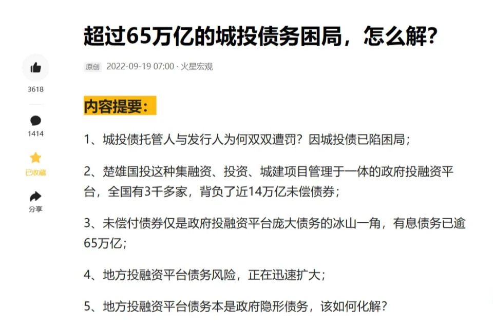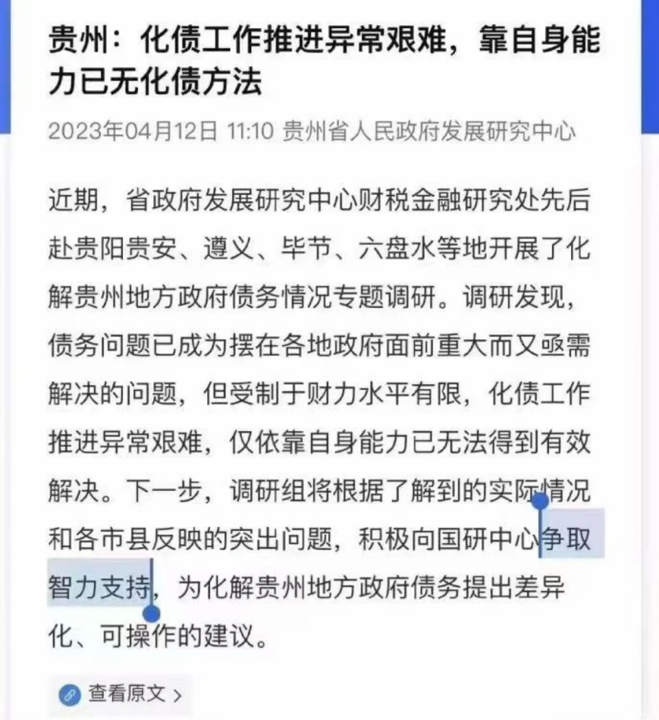 划重点: 一、贵州省政府突发“靠自身本领已无化债方法”信号弹在疫后经济规复快速有用、央行发布亮眼的信贷数据、海关公布了超预期的出口数据之时,贵州省政府给市场发射了一颗令人告急的赤色信号弹:地方政府债务间不容发! 4月12日,贵州省政府发展研究中心刊发《化债工作推进非常艰巨,靠自身本领已无化债方法》一文,披露克制到2022年12月份,该省政府不包罗地方隐性债务的显性债务到达12470亿元,此中省本级2035亿元,省以下10435亿元。 所谓显性债务,就是列入央行统计口径的政府债券。根据央行公布的金融数据,克制2022年12月尾,天下政府债券余额为60.2万亿元,此中国债约25.6万亿,地方债34.6万亿。贵州地方债券余额约占天下地方债券余额的3.6%。 贵州省政府研究中心坦言,债务标题已成为摆在各地政府面前巨大而又亟需办理的标题,但受制于贵州的财力,化解债务的工作推进非常困难,仅仅依靠贵州省自己,无法化解债务。 二、贵州省真实的全口径债务有多大?着实,12470亿元的显性债务,并非贵州省地方政府债务的全部。 由于除了财政部、发改委列入筹划的政府债券之外,贵州各地也和天下各地政府一样,大量地、广泛地、失控地利用各种地方政府投融资平台(LGFV),发行了城投债,获取了银行贷款,以及委托贷款、信托乞贷等非标债务,另有难以统计的应付款。 根据Wind城投债口径统计,停止2022年底,贵州共计城投主体160家,有存续债券的城投企业共117家。存续债券共有411支,城投债存量规模合计2995亿元。 2018-2021年底,贵州省垣投企业全部债务规模一连大幅度增长,年均复合增长到达10.7%。存量匀称票面利率6.31%。 按照国证大数据根据Wind数据推算的2021年贵州省投融资平台的债务布局推算, 2995亿元的城投债存量仅占投融资平台债务总量(不含应付款)的21.9%。 2022年12月尾,按照推算,贵州省投融资平台尚有委托贷款、信托贷款等非标债务4130余亿元,银行贷款存量6551亿元。 2022年底,贵州省投融资平台不含应付款的债务余额约为13676亿元,约占天下投融资平台债务总额的2.1%。 这意味着,克制2022年12月,显性债务12470亿元,再加上13676亿元的隐性债务,贵州省各级政府累计负债余额约莫为26146亿元。 三、贵州省各级政府有多大的偿债本领?政府债务属于公共债务,其还本付息,均来自于税收、基金、国有资源谋划收入等公共收入。26146亿元的地方债总债务,按常住生齿3856万人盘算,贵州人均背负政府债6.78万元。 贵州省2022年GDP为21466亿元,其宏观杠杆率到达121.8%,为发达国家地方政府宏观杠杆率的10倍左右。 2022年,贵州全省一样平常公共预算收入1886亿元,全省政府性基金预算收入2041亿元。其自身的公共收入只有3927亿元,其债务收入比率已经到达665.8%的难以置信的水平。 至关紧张的是,贵州自己是一个依靠转移付出才华够维持财政收支均衡的穷省。2022年贵州全省一样平常公共预算付出5849亿元,其自身的收入仅能满意其一样平常预算付出的67.1%。 2022年,贵州得到了3673亿元的中心转移付出,重新发行政府债券得到的资金为2085亿元(不含城投债)。贵州各级政府每付出100元,只有40.5元来自税费和基金收入,37.9元来自于中心转移付出,21.6元来自于借债。 更严峻的是,在贵州的显性债务中,2022年得到发债收入2085亿元,但付出债务本金用了1479亿元,借债还债率到达70.9%。债务用于发展的比例不敷3成。 面临两万多亿巨债,纵然免除利钱,贵州省财政各级政府、古迹单位不吃不喝,也必要80个月才华还本。而天下银行和IMF保举的政府负债比例,最高限为80%。 由此可见,贵州政府公开认可自己无力化解债务,也是由于贵州各级政府已深陷债务危急,债务气球邻近破裂边沿,如果没有来自外力的救济,贵州省地方政府债务,将像2022年的房地产企业债务一样,一破而无法摒挡。 四、从贵州看地方债为什么会失控?2022年9月19日,我在《》一文中披露,根据国证大数据的估算,克制2022年6月尾,天下各地投融资平台的有息债务余额,凌驾65万亿元。 加上34.6万亿显性地方债,中国地方政府有息债务规模已经靠近100万亿。 地方债规模云云巨大,隐含着巨大的风险。而地方债失去控制地膨胀,源于以下因素。 一是根深蒂固的“谋划都会”的行政思绪。 从公共行政管理理论到各国政府的实际利用,政府的存在,其本源和初心,就是受选民委托,为市场主体和公民,提供公共产物服务。 但构建于苏联筹划经济模式的中国政府,在政府职能和政府定位上,是存在天赋逾越的。政府逾越了提供公共产物服务的框架,也逾越了服务的目标,从服务异变为谋划和管理。 固然颠末三四十年的改革开放,我们不停在喊创建市场经济体系,但究竟上,我们不停沉醉于加大政府筹集资源、谋划资源的本领,对市场要素自由活动的干预越来越严峻。并将政府这个市场经济的评判员直接了局到场角逐,套上了谋划都会、引导市场的漂亮外衣。 政府到场谋划,天然就必要像企业一样到场资金、劳动力等生产要素的分配。但在分配过程中,又依附公权利,粉碎分配规则。 比如获取资金时无需像企业一样提供富足的抵押物,无法还款时也无需像企业一样负担逼迫实行的责任,资不抵债时无需像企业一样休业整理。这是地方债失控的重要缘故原由。 二是错误的经济发展模式。 改革初期,我们一穷二白,在从筹划体制向市场体制转换过程中,突然松